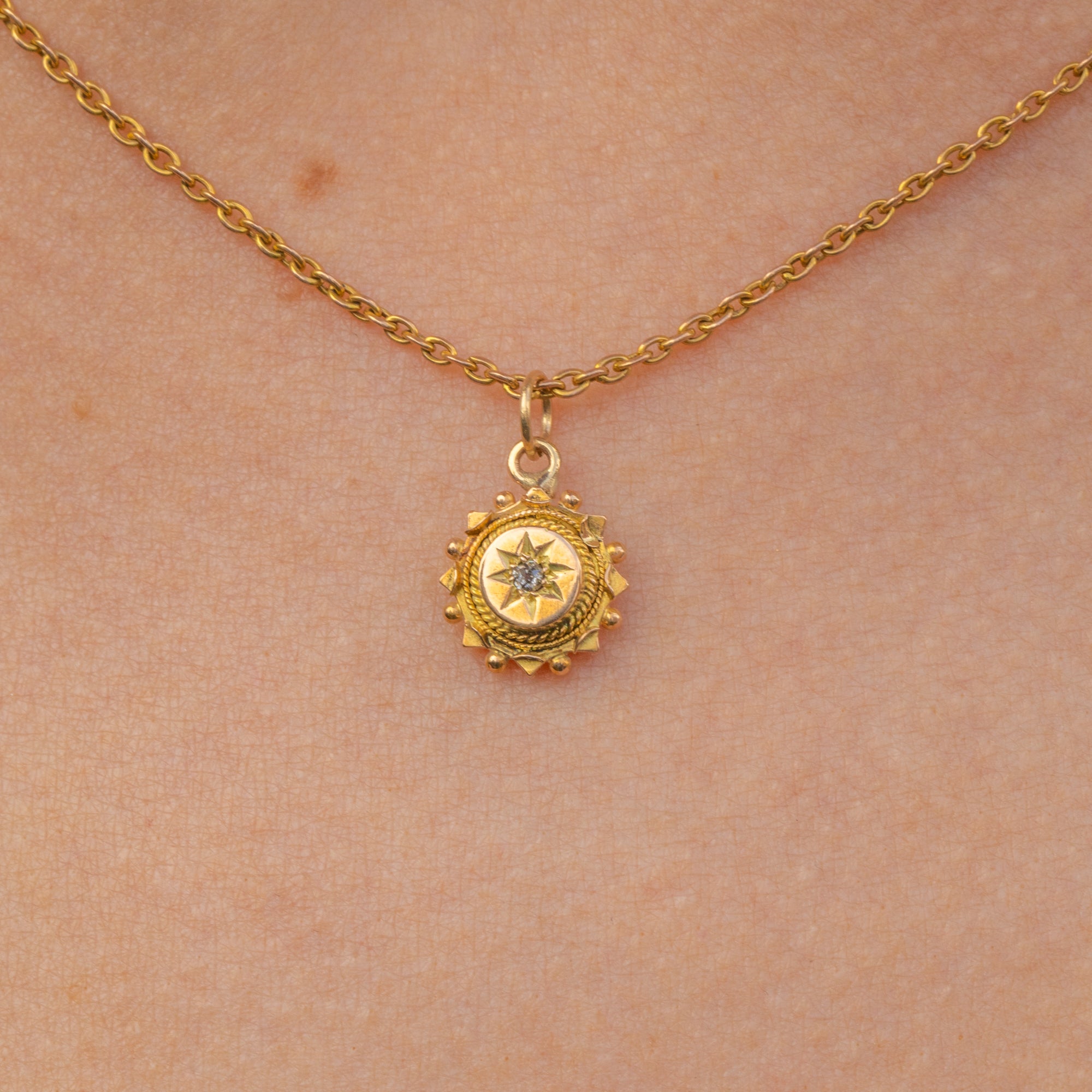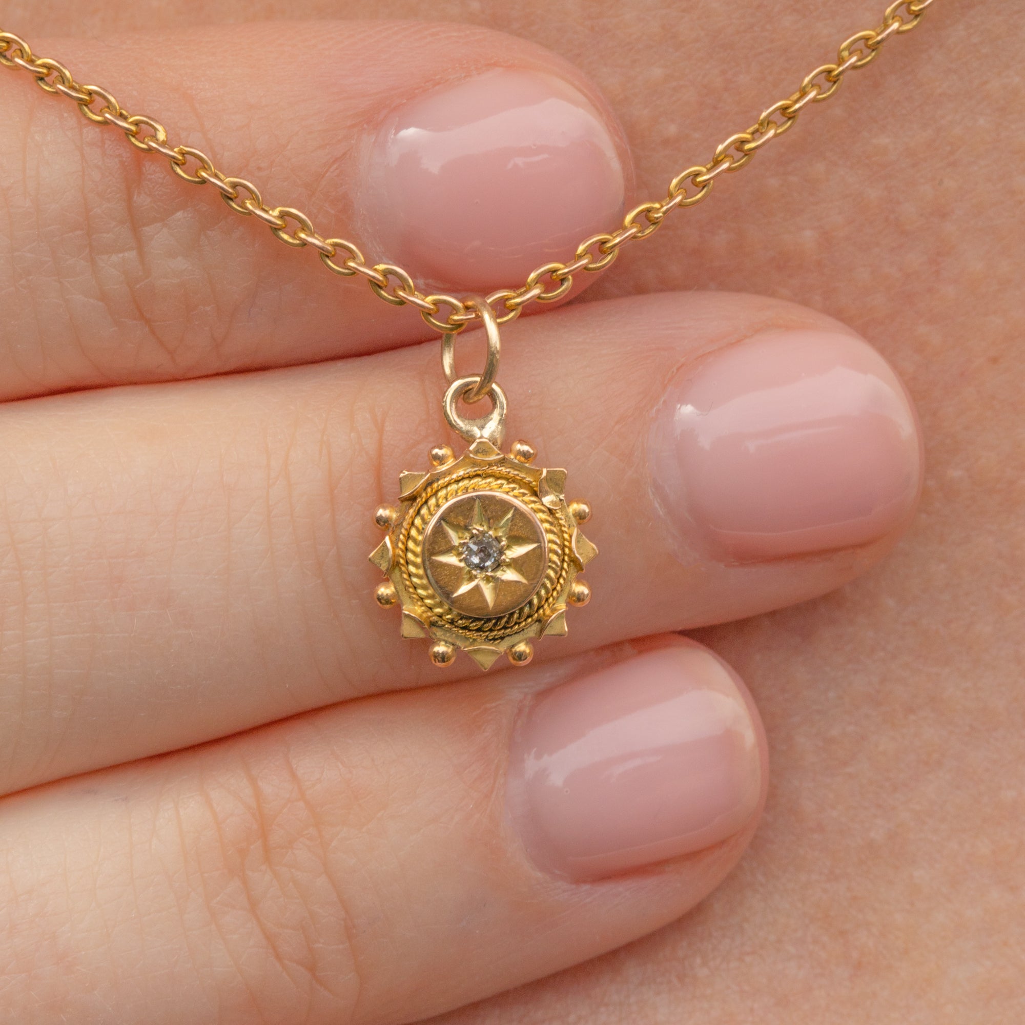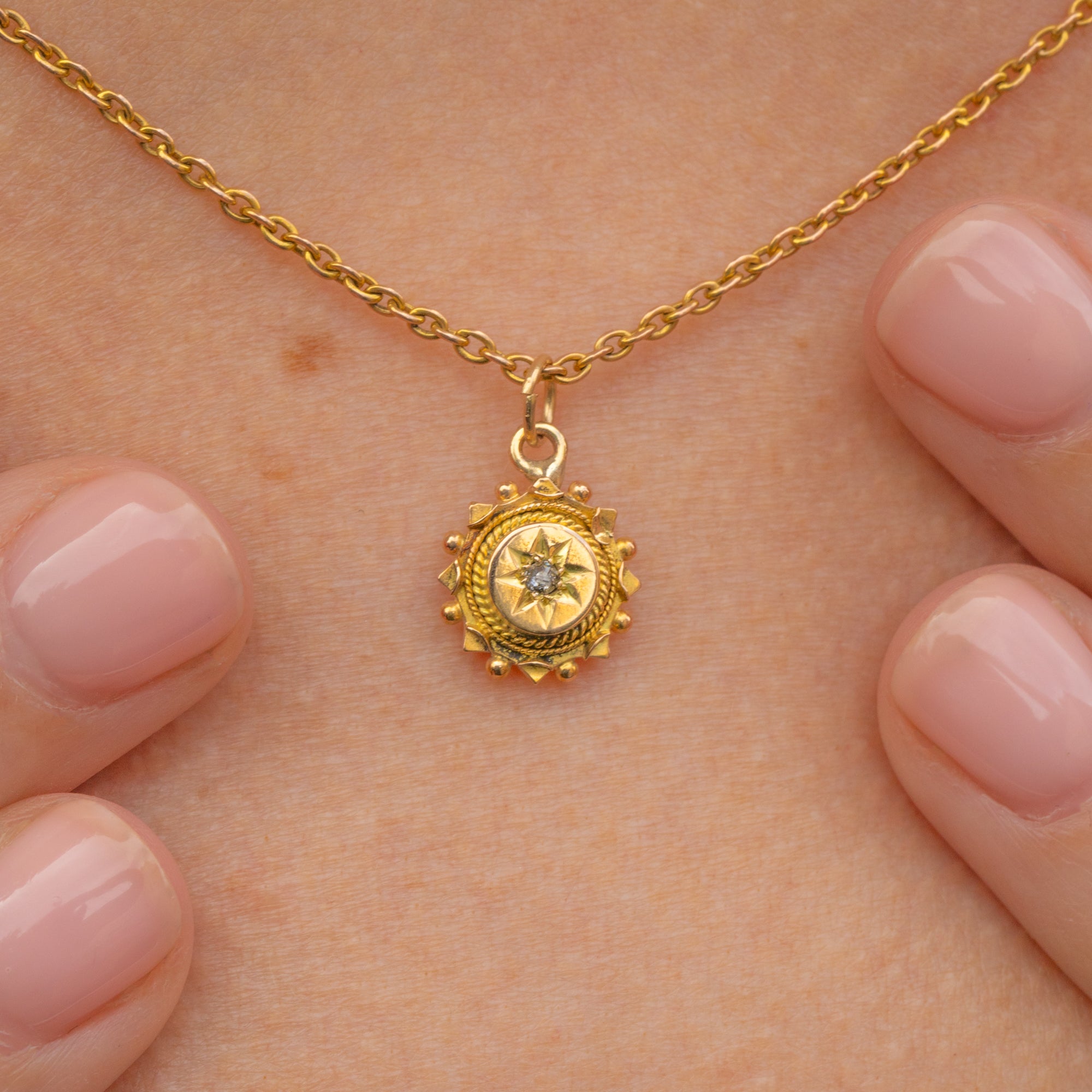 VERY GOOD. This Victorian 15ct Gold Diamond Etruscan round charm is in very good condition. The Diamond is secure in its setting and the beaded edge is entirely in tact. The back of the pendant has sign of a conversion to the back of it, from where it was likely a stick pin, but the charm is smooth and can be worn confidently.