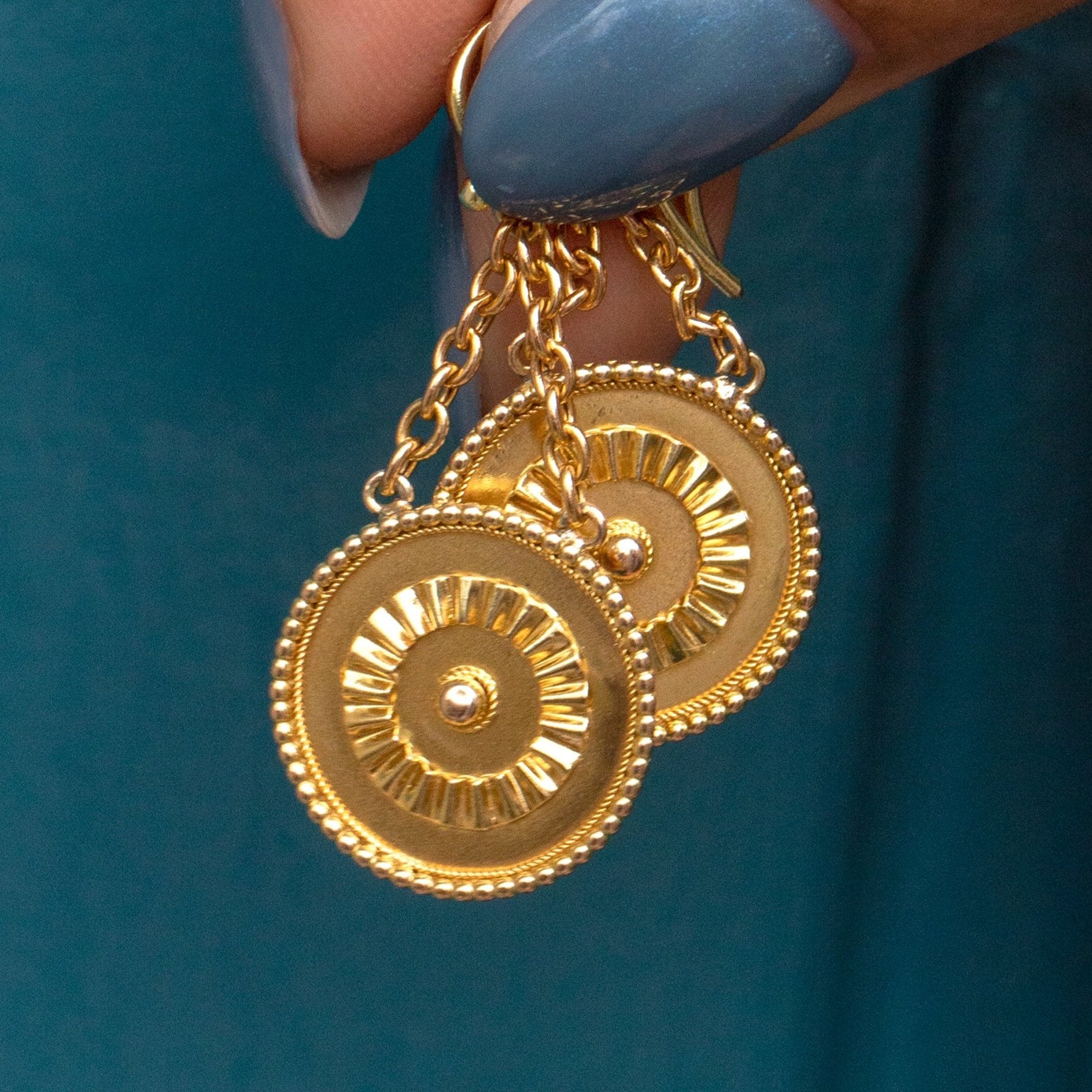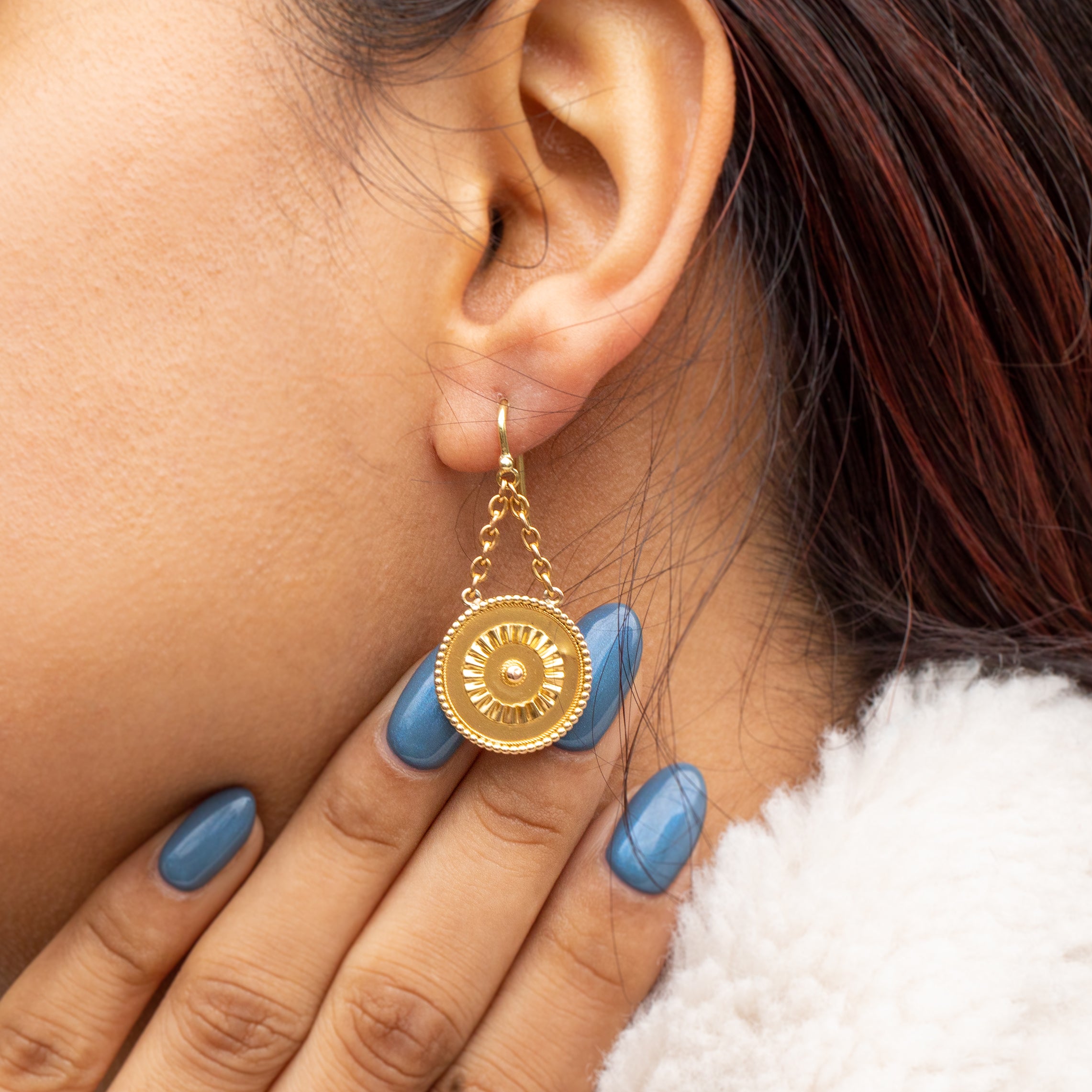 Suspended from 18ct Gold hooks, the disc drops are akin to a warm radiating sun; their gentle movement in the ear and textured detailing make them both an enticing and intriguing pair!