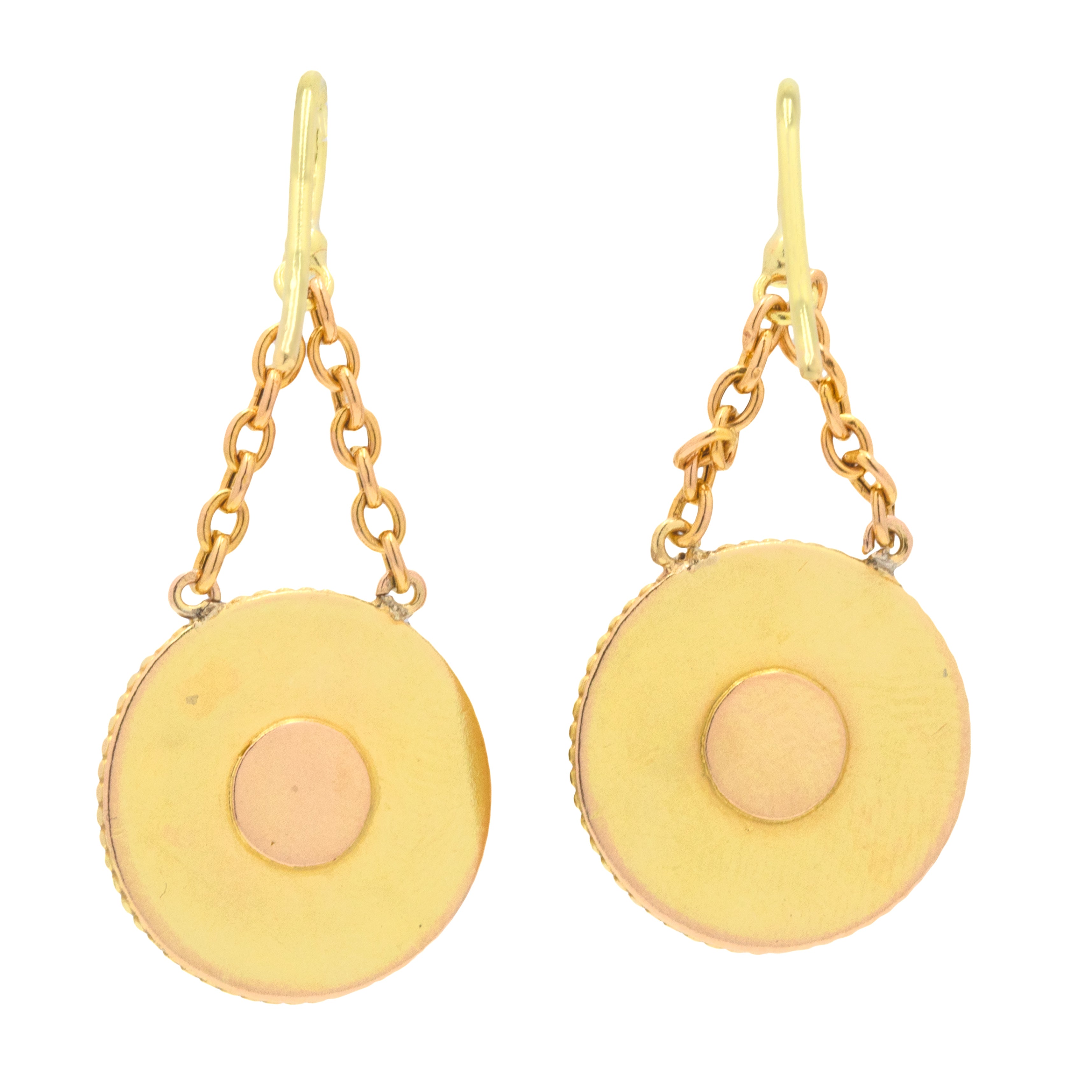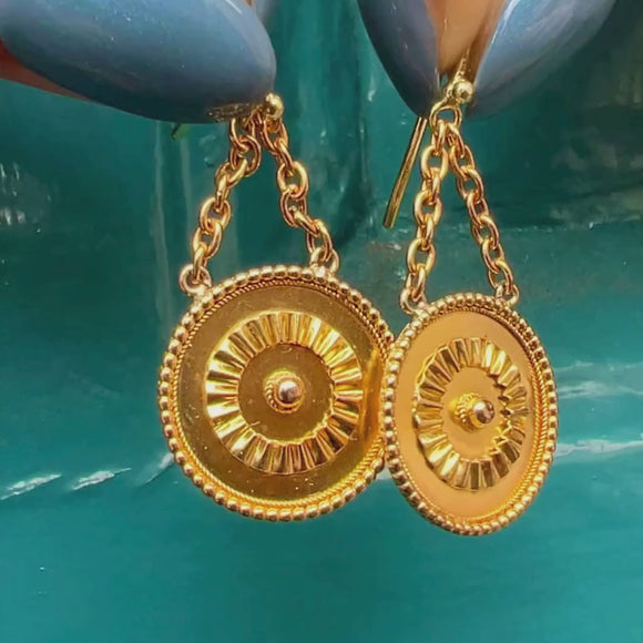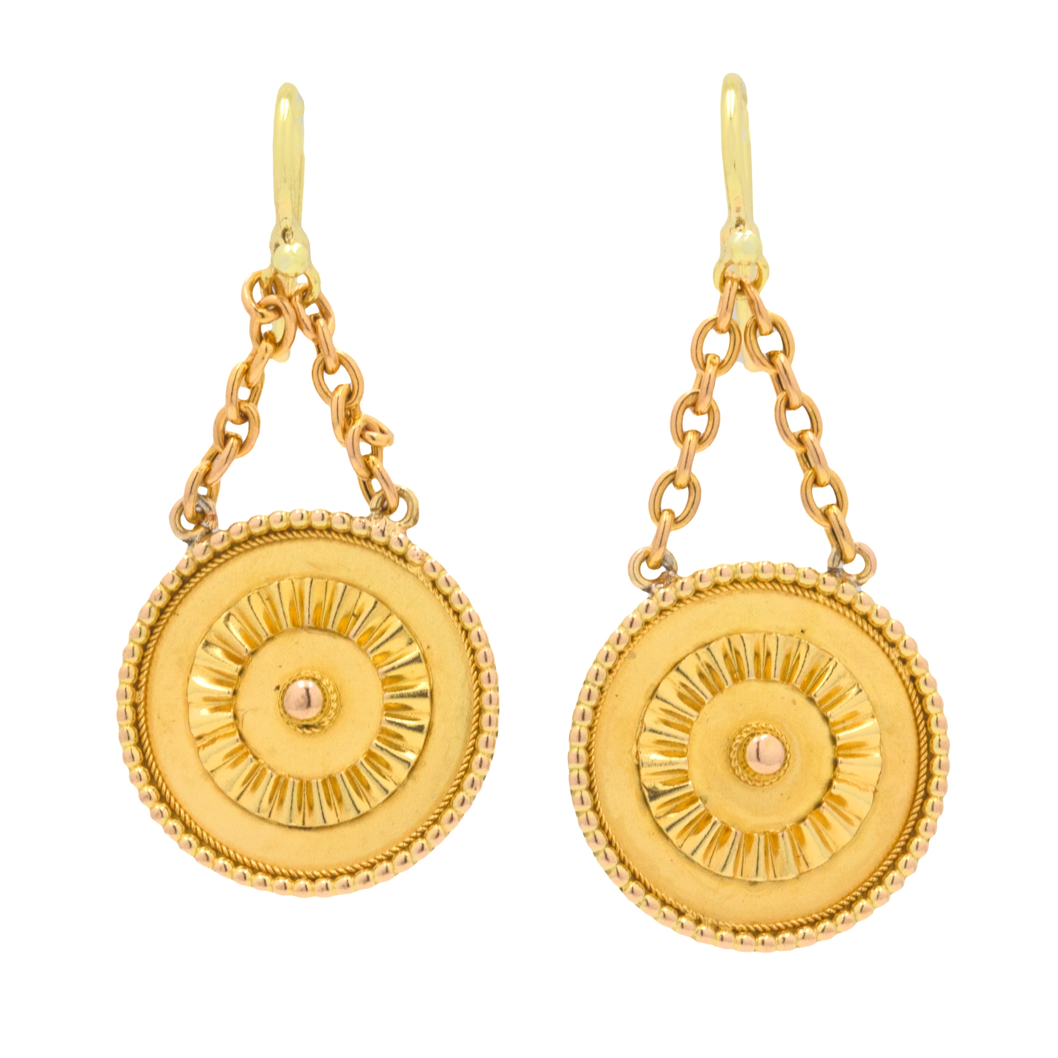 VERY GOOD TO EXCELLENT. A gorgeous pair of Victorian 15ct Gold disc drop earrings offered in wonderful condition! The Gold is brightly saturated and all of the details have remained crisp. One of the earrings has a little ding on its back, and the other has some surface wear, commensurate with age. The hooks slot comfortably into the ear, and the chain allows them to sway gently.