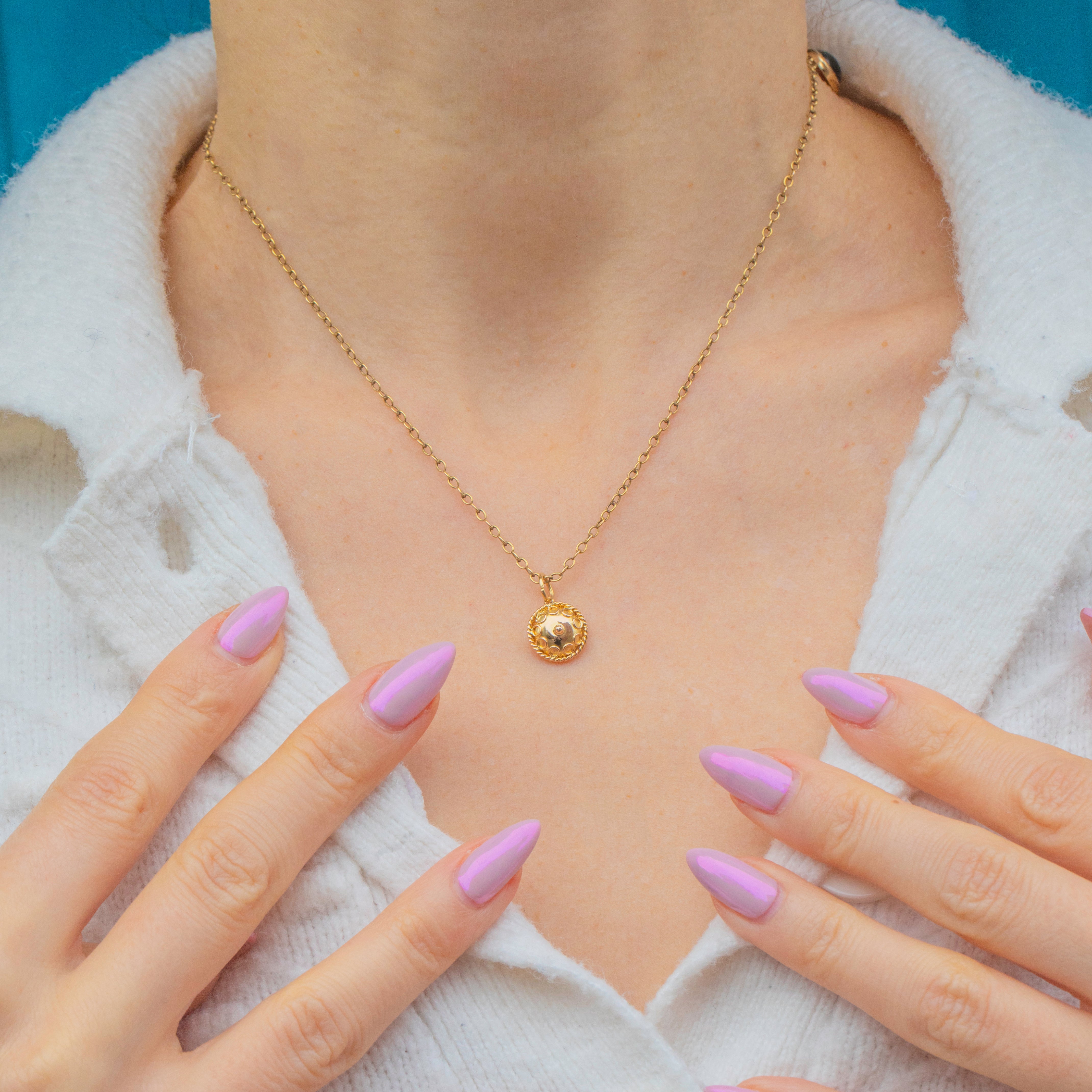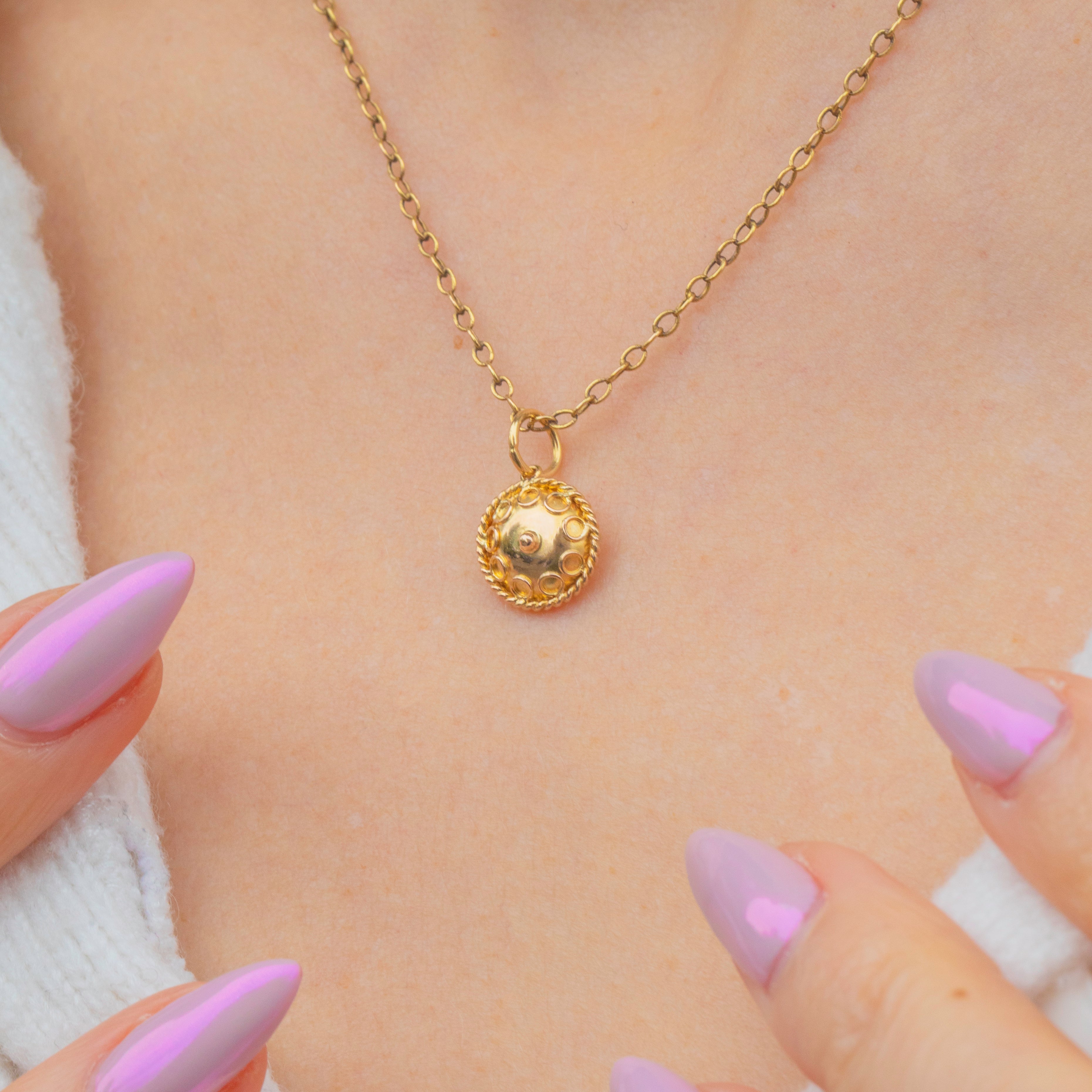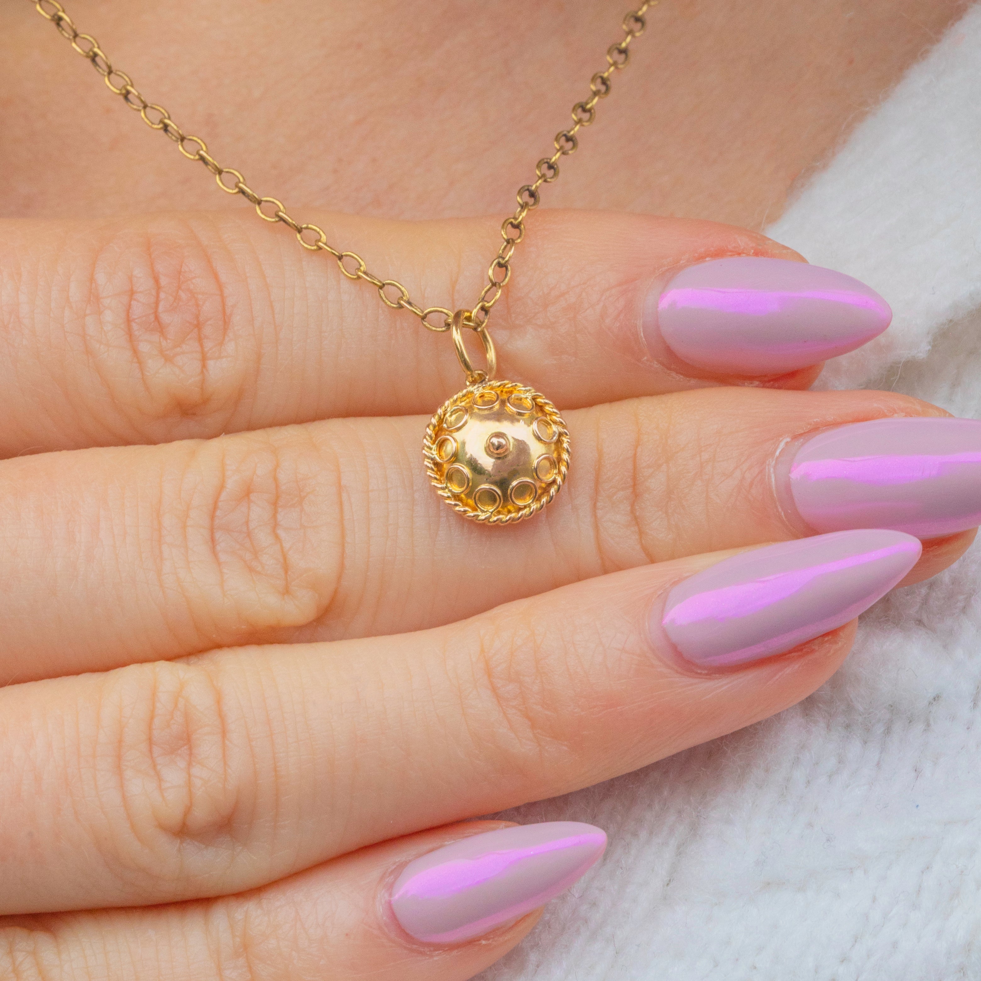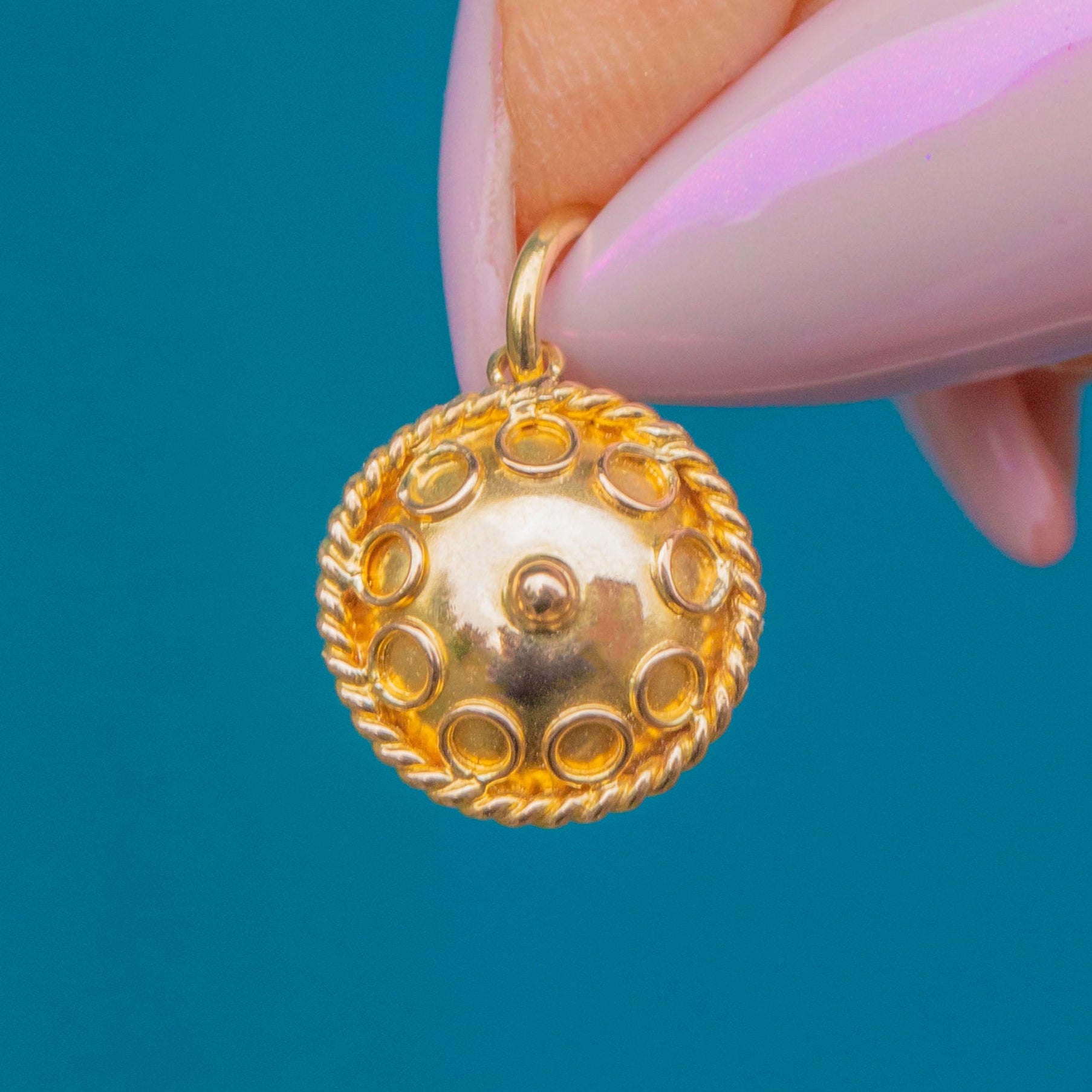 Small yet exquisitely made, this decorative charm adds a touch of antique opulence to any chain or bracelet. A perfect example of the Victorian fascination with ancient design and symbolism, reimagined through the warmth and luxury of Gold.