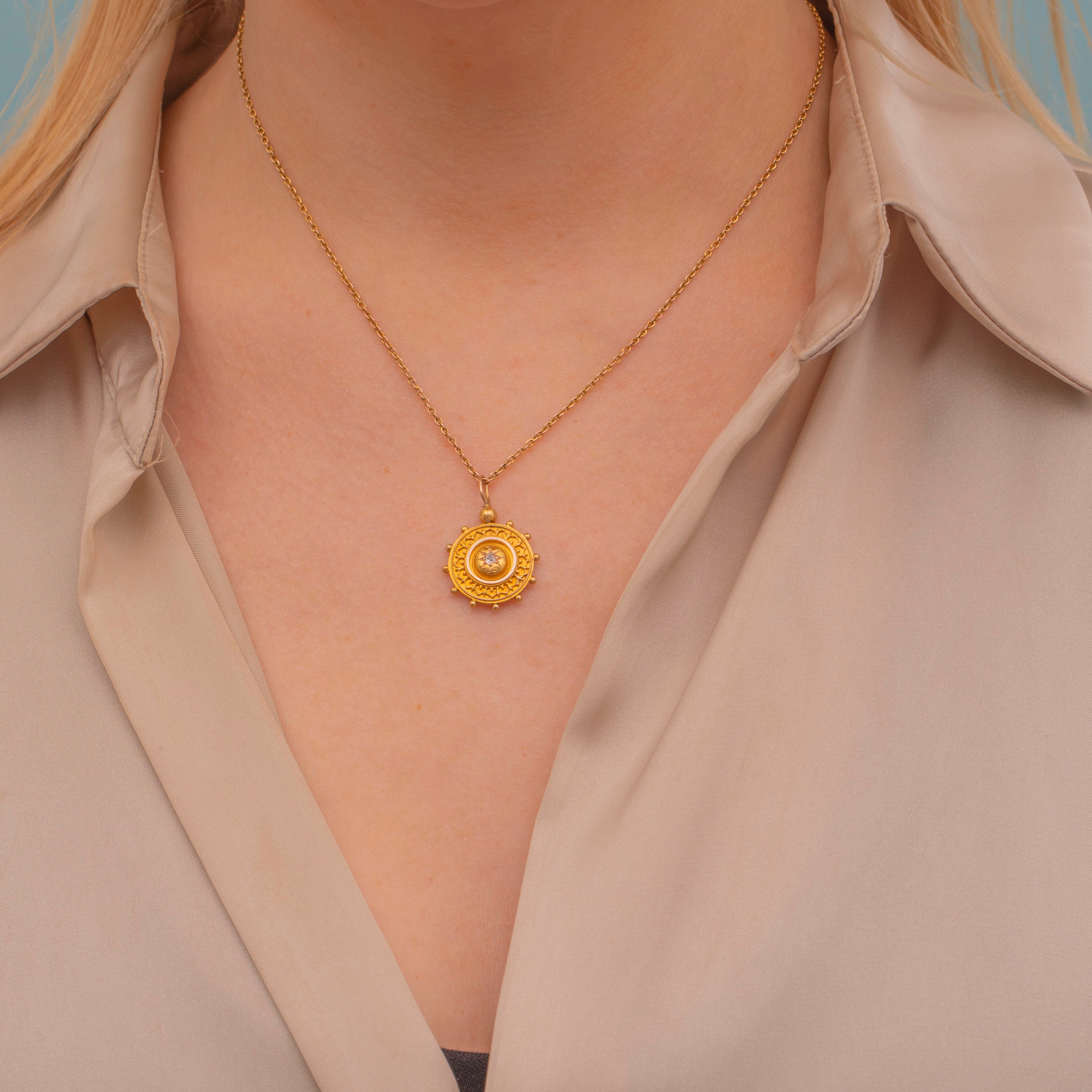 EXCELLENT: This Victorian 15ct Gold Etruscan Diamond disc pendant is in very good condition. Her Diamond is securely set, and her Gold is lustrous. In excellent condition, she is a must have.