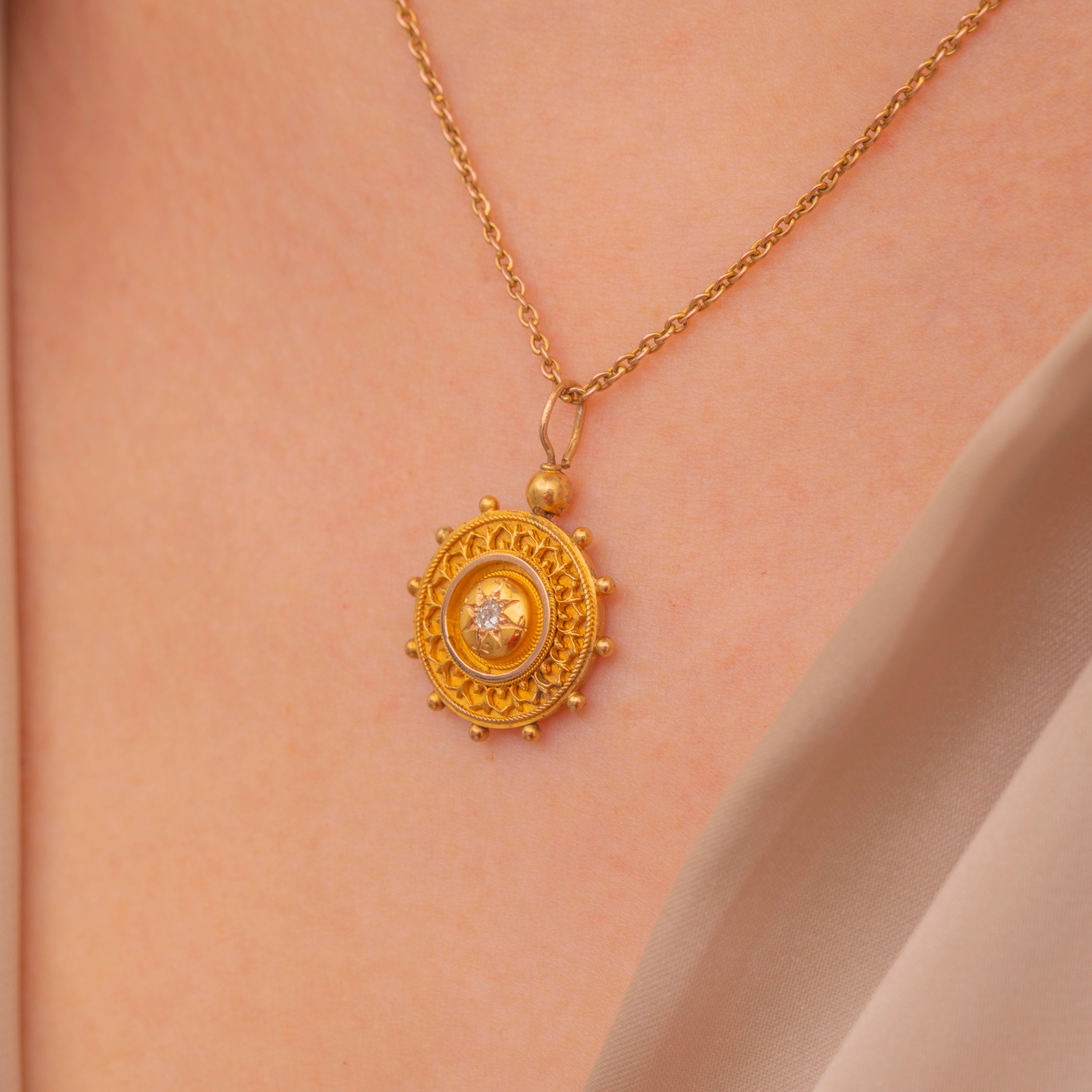 Add a touch of celestial charm to your collection with this Victorian 15ct Gold Etruscan Diamond disc pendant!
