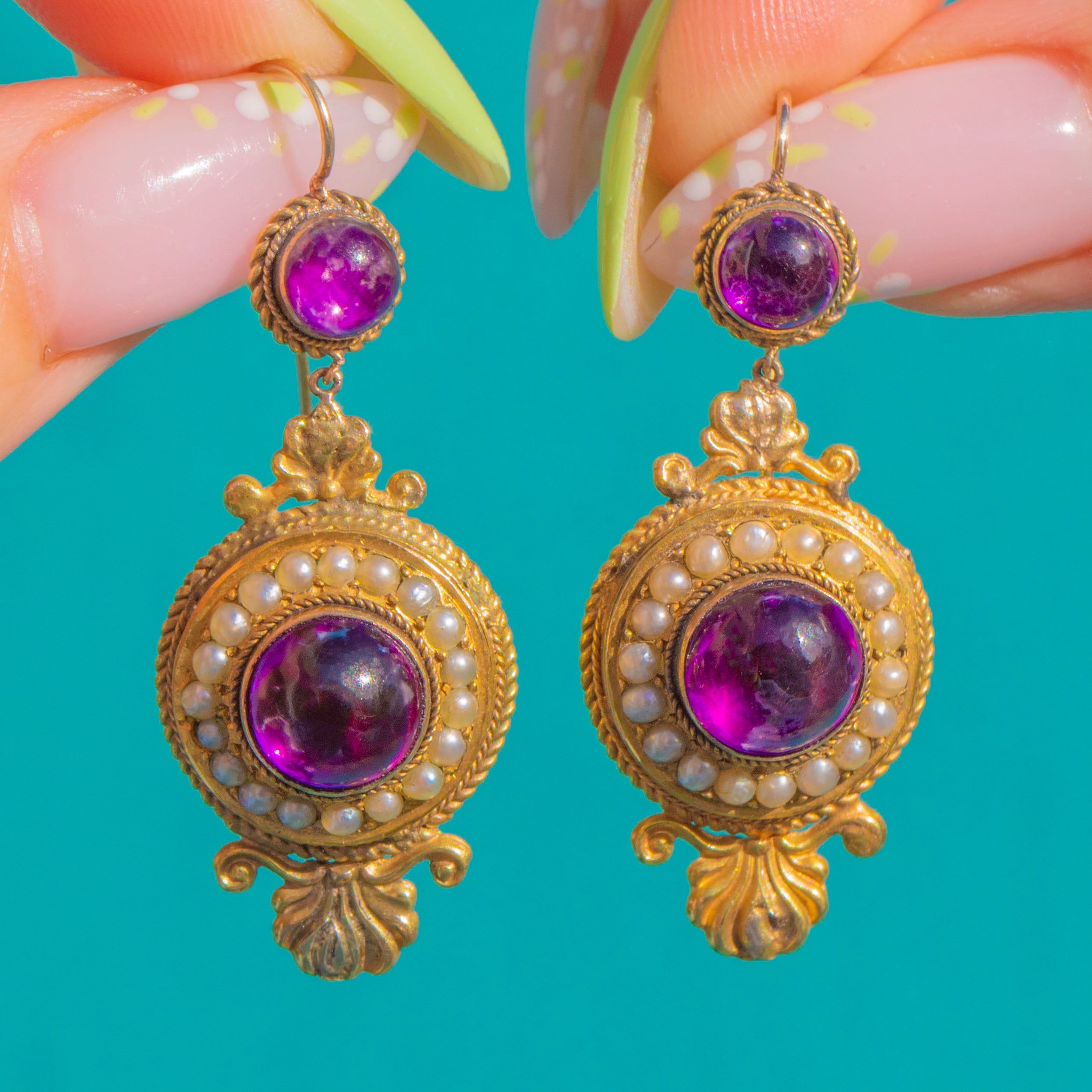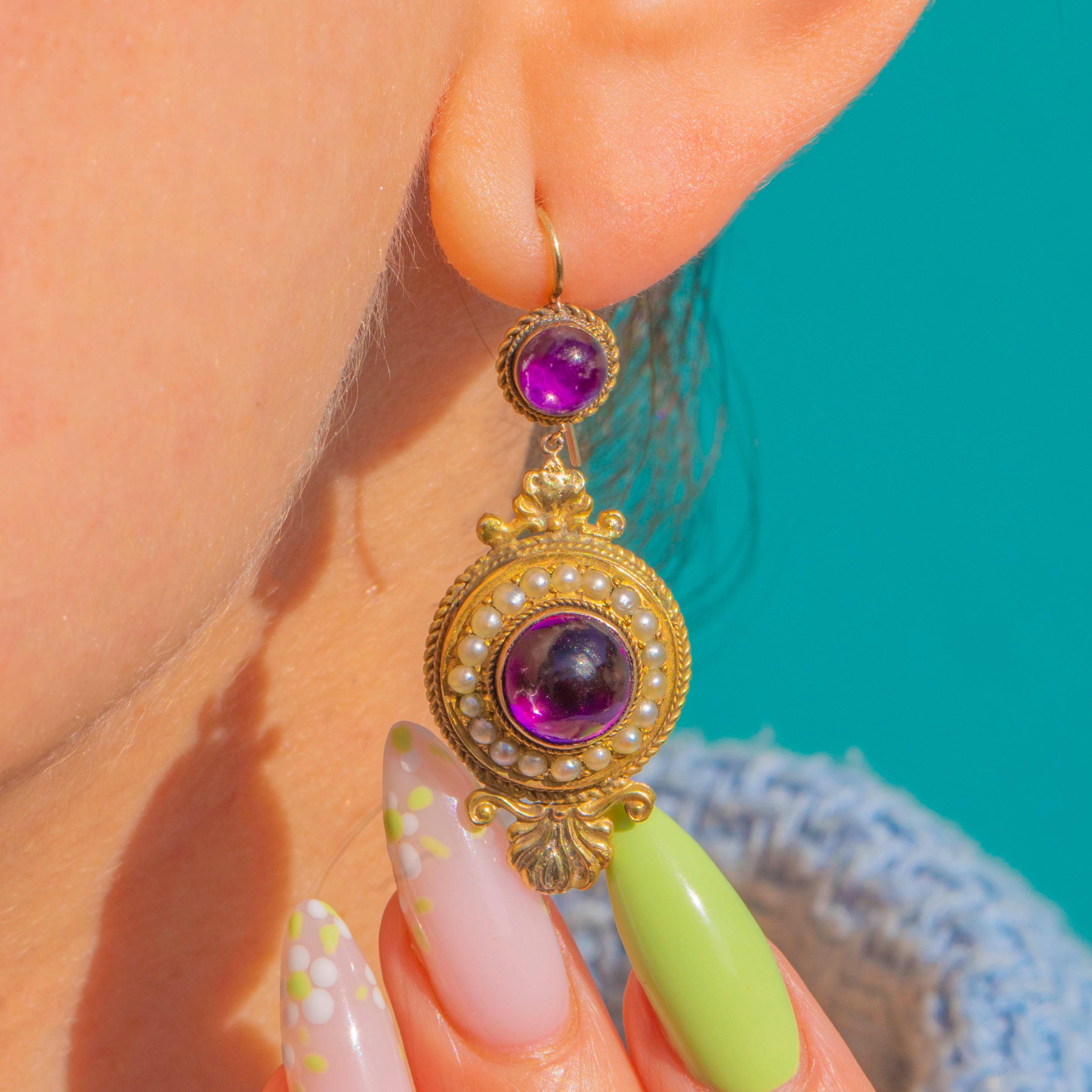 Opulent and romantic, these Victorian Etruscan Revival drop earrings embody the era’s love of texture and ornament. Crafted in bloomed 15ct Gold, each articulated two-part drop centres a rich purple foiled Amethyst that glows with life, framed by a close halo of creamy Seed Pearls. Rope-twist bezels and foliate scroll terminals add that unmistakable 19th-century flourish, while the articulation lends a graceful, lively sway on the ear.