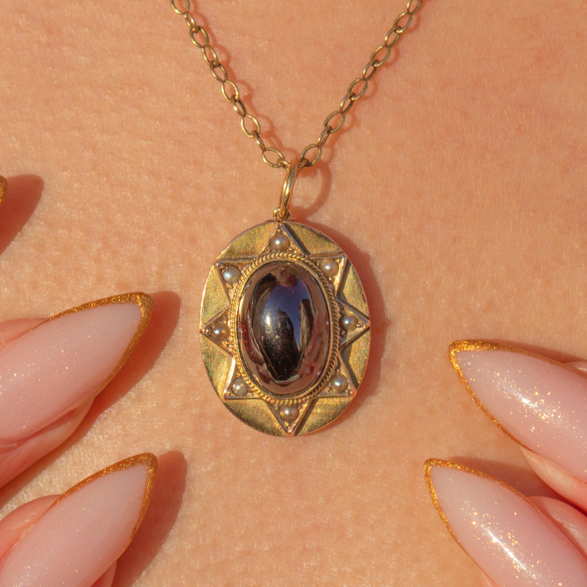 This Victorian 15ct Gold Garnet and Pearl star pendant is a wonderfully rich and romantic piece of antique jewellery. Set with a deep wine-red Garnet cabochon at the centre and framed by a celestial star of tiny Pearls, it has all the warmth and charm we love from late 19th-century design.