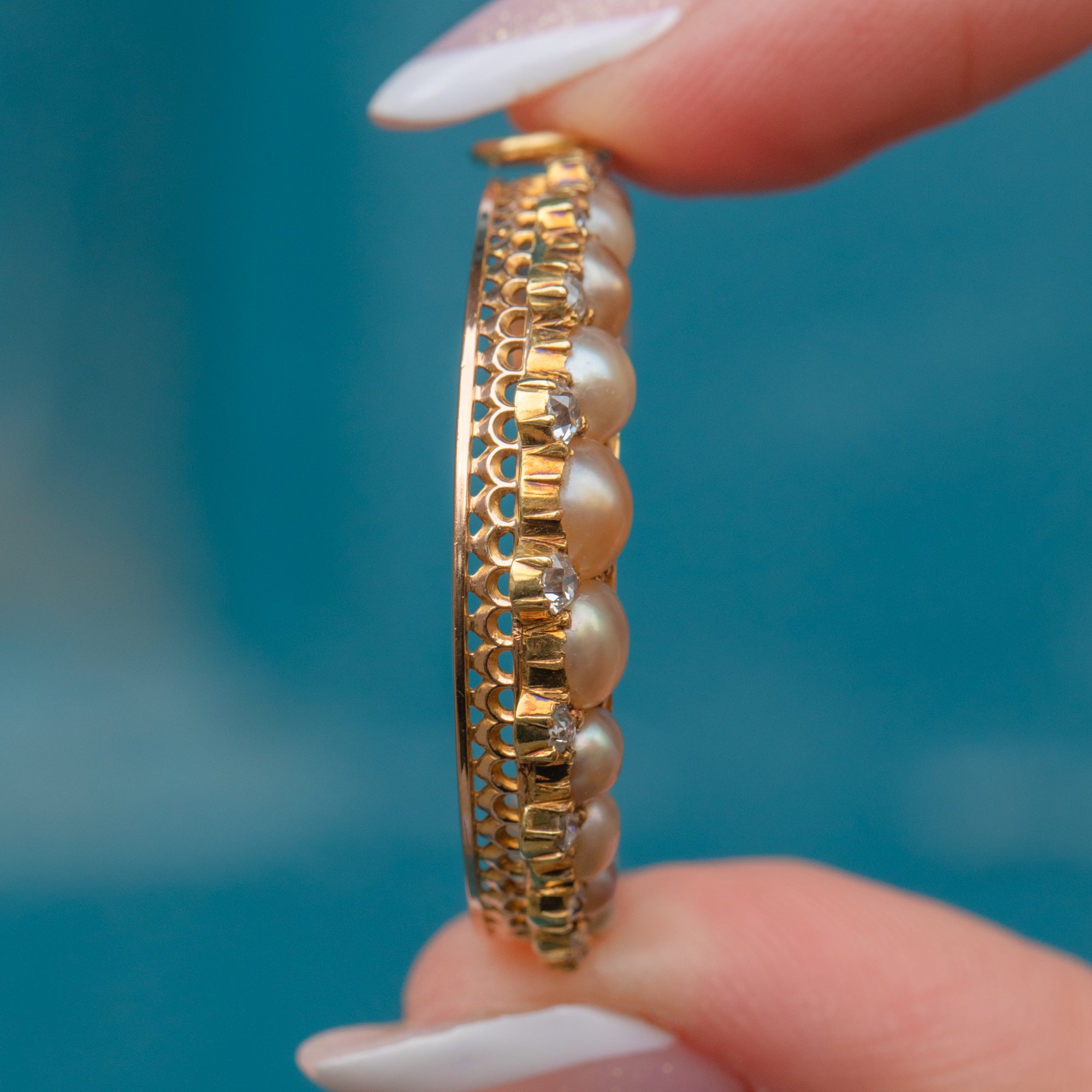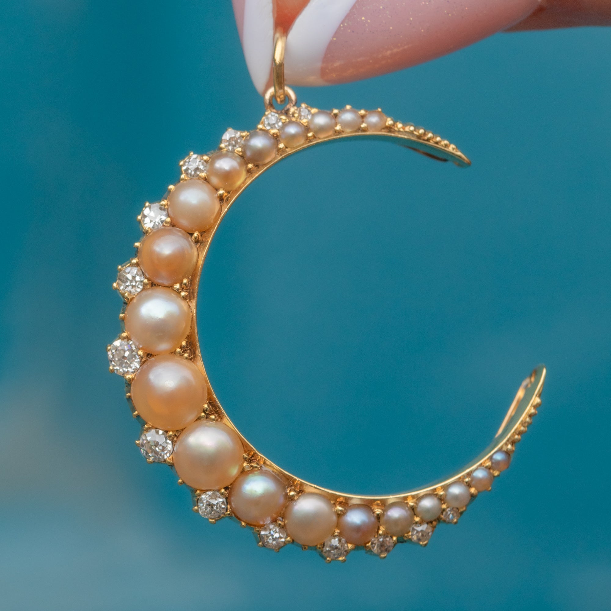 Rich in splendour, this Victorian 15ct Gold Pearl & Diamond crescent moon pendant will make a standout addition to your antique jewellery collection! Crafted from rare and saturated 15ct Gold, the striking crescent moon form is inlaid with champagne-hued Pearls and a sprinkling of scintillating Diamonds.