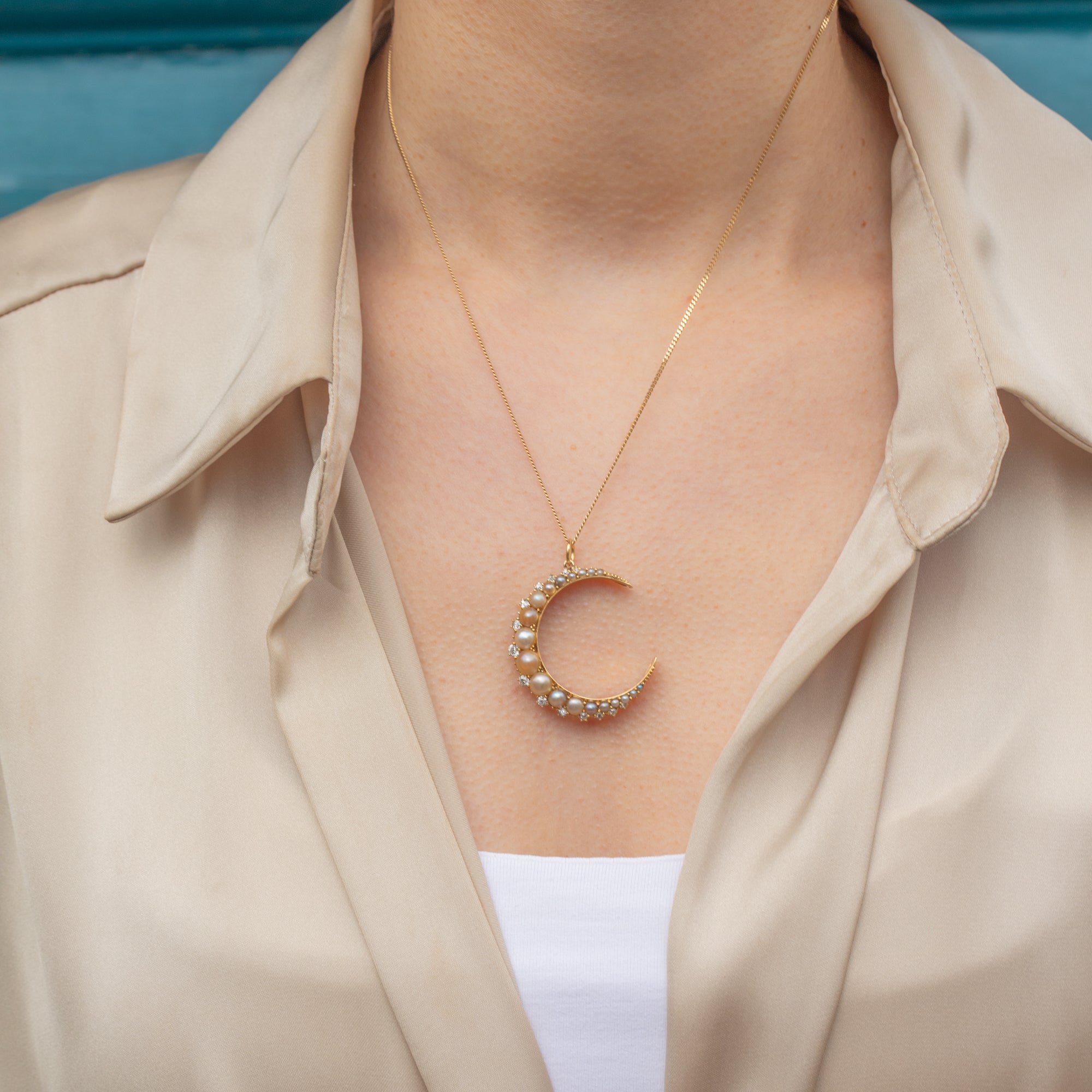 Victorian 15ct Gold Pearl & Diamond Crescent Moon Pendant
