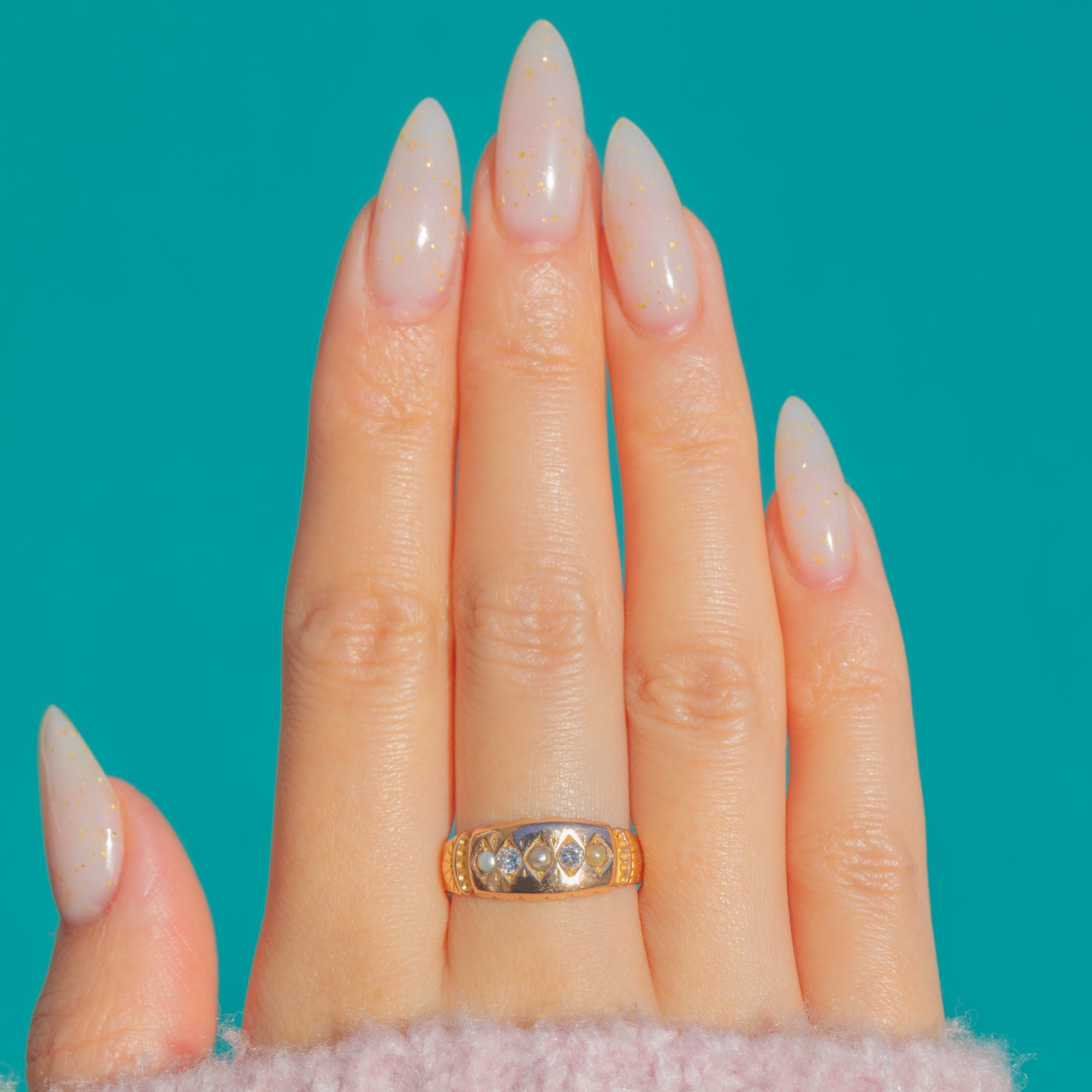 A beautifully preserved Victorian gypsy ring in warm 15ct Gold, bead-set with alternating Diamonds and Pearls across a geometric lozenge-style head. The low profile glides on the finger, while bright-cut engravings and fine beaded detailing lend a refined sparkle. A subtle two-tone effect at the head enhances the patterning and draws the eye to the alternating stones.