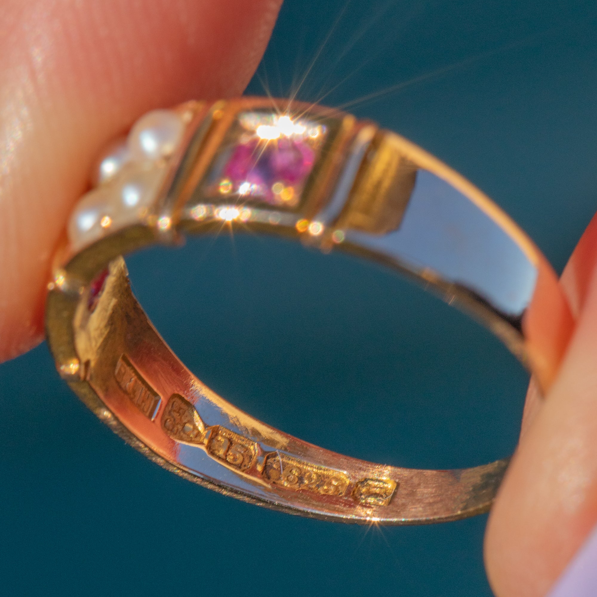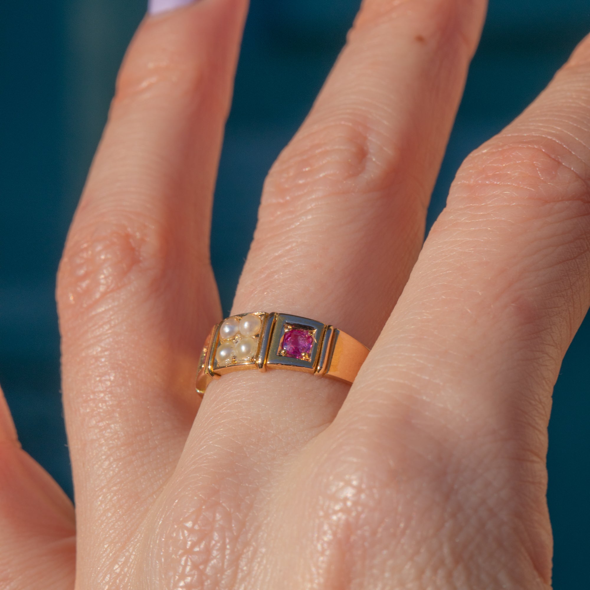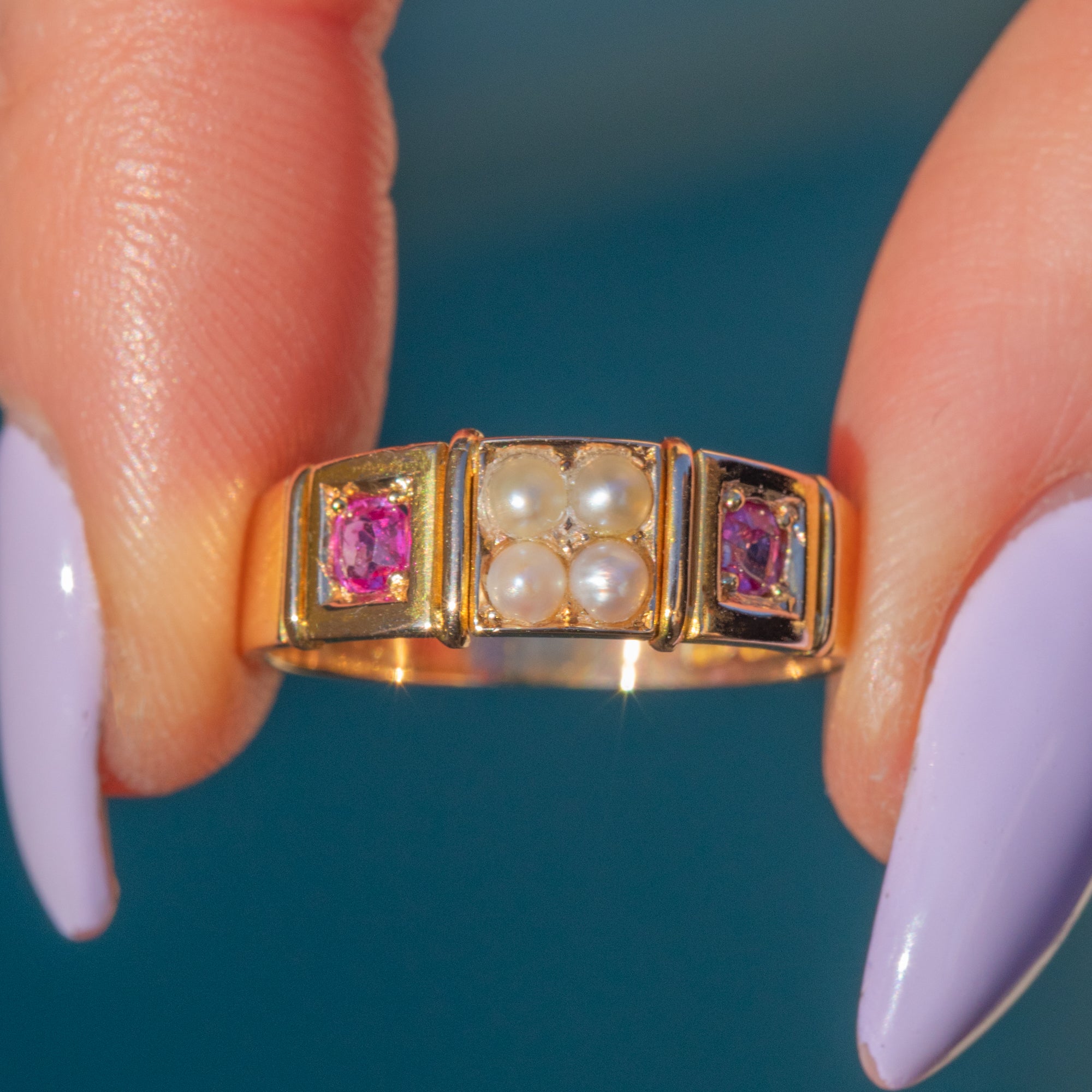 This antique ring boasts two gorgeous fuchsia pink Sapphires, adorned by a cluster of creamy Pearls in the centre of the ring. Her Sapphires are radiant, softened by the shimmer of her iridescent Pearls. Each gemstone is married by the warmth of her 15ct Gold band, giving this antique ring a lovely elegant finish.