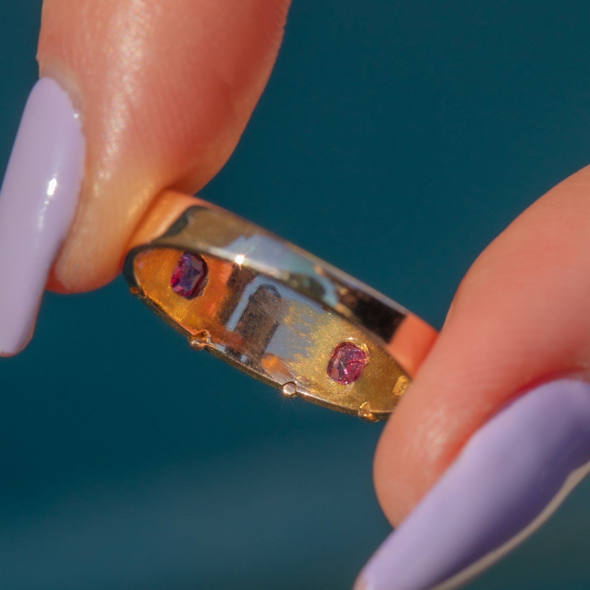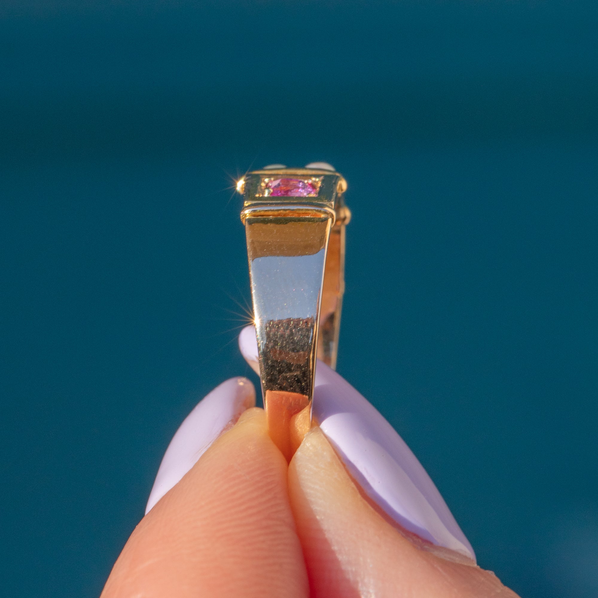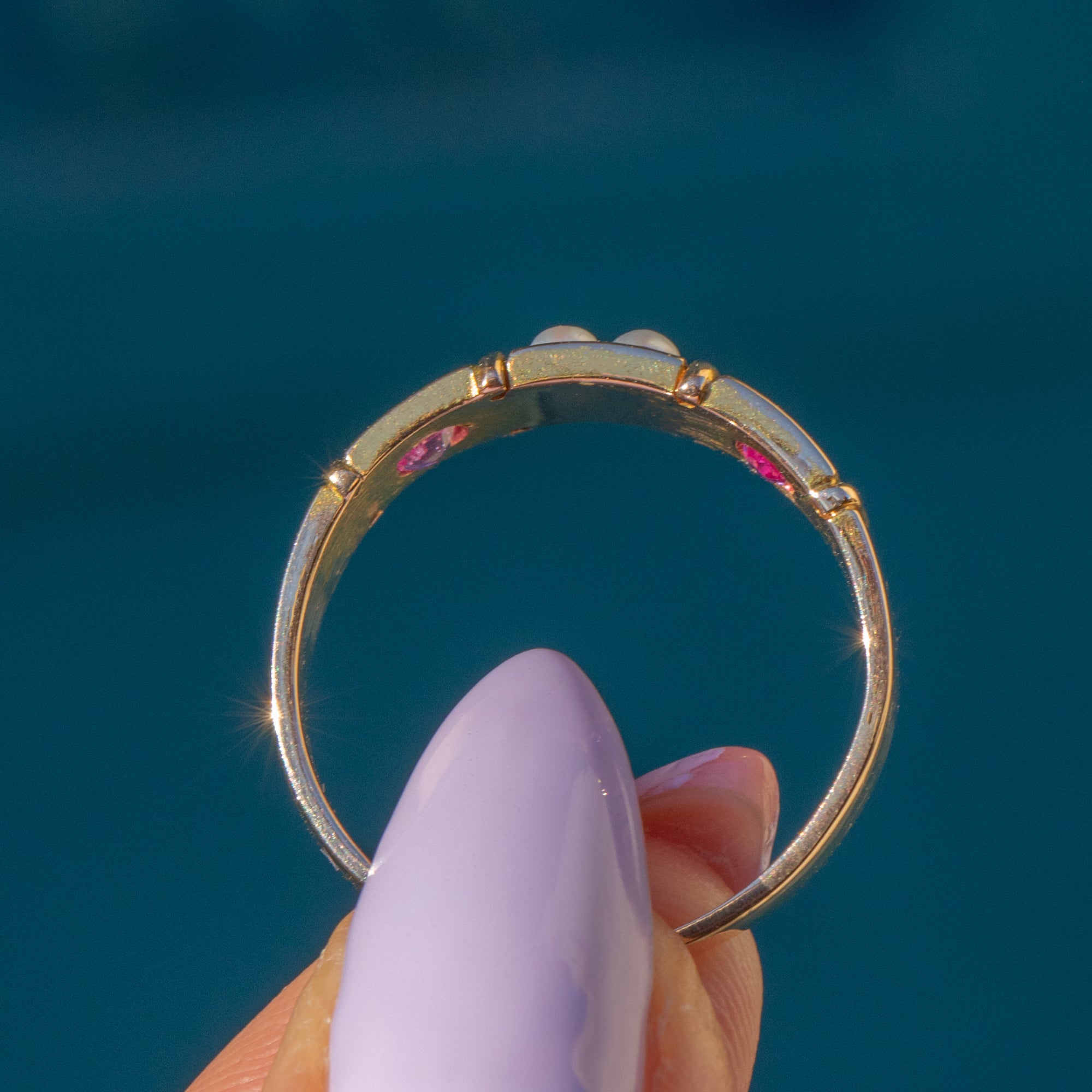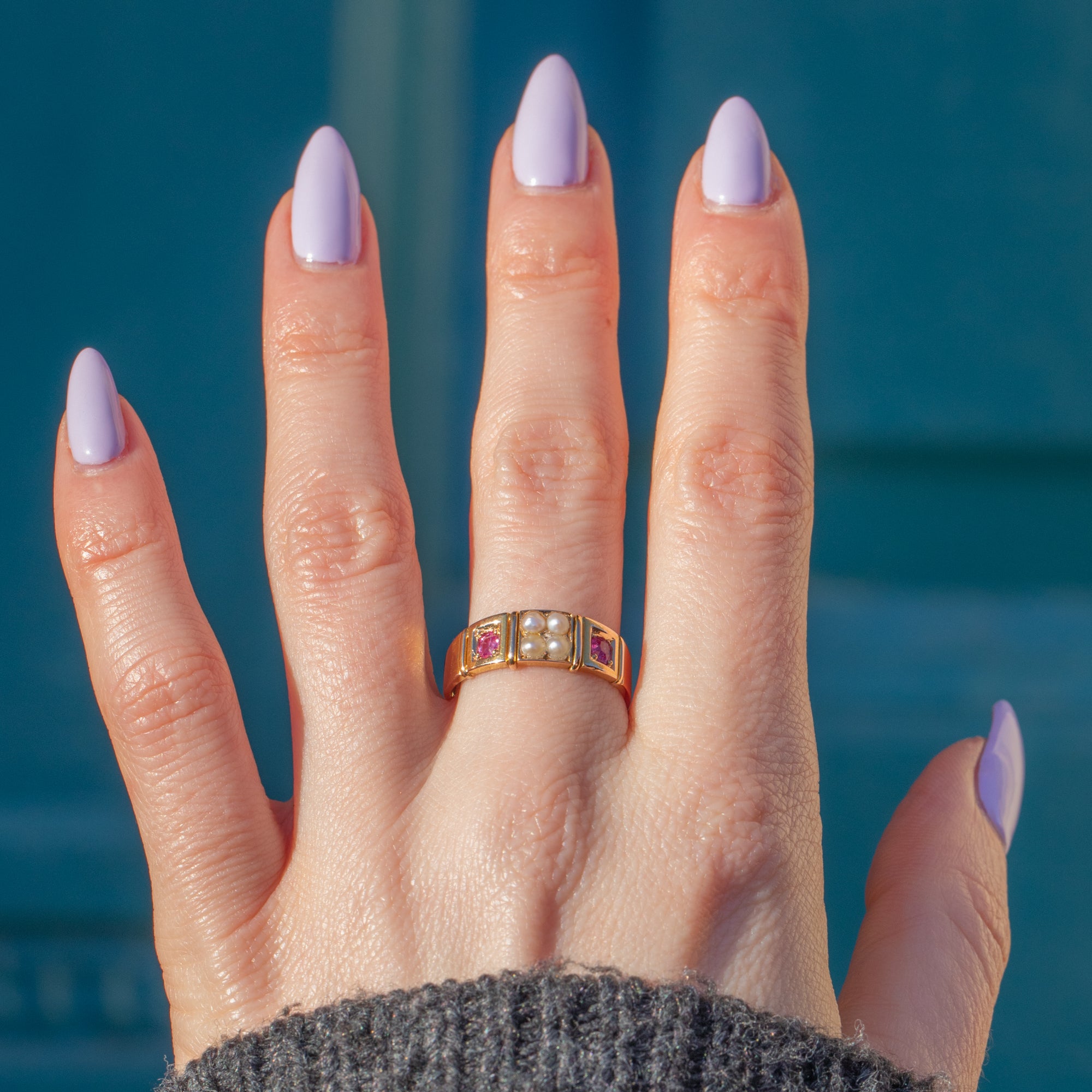 This antique ring boasts two gorgeous fuchsia pink Sapphires, adorned by a cluster of creamy Pearls in the centre of the ring. Her Sapphires are radiant, softened by the shimmer of her iridescent Pearls. Each gemstone is married by the warmth of her 15ct Gold band, giving this antique ring a lovely elegant finish.