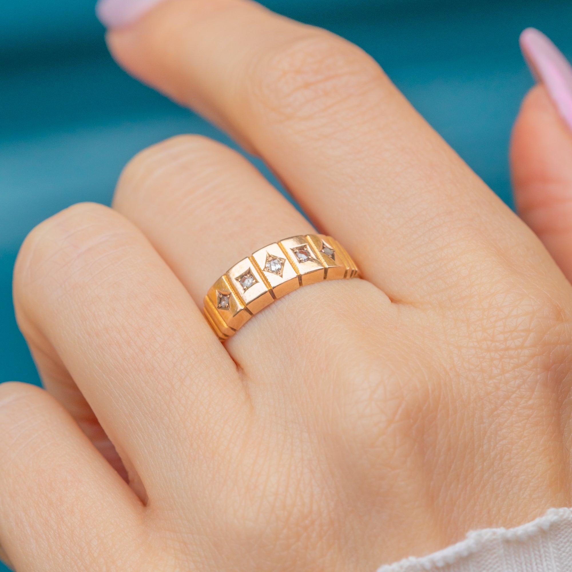 A charming Victorian “Gypsy” ring crafted in glowing 15ct Gold, set with twinkling rose-cut Diamonds that graduate gently across the front. The softly domed band and star-set Diamonds create a beautiful play of light, with a classic design that remains effortlessly wearable today.