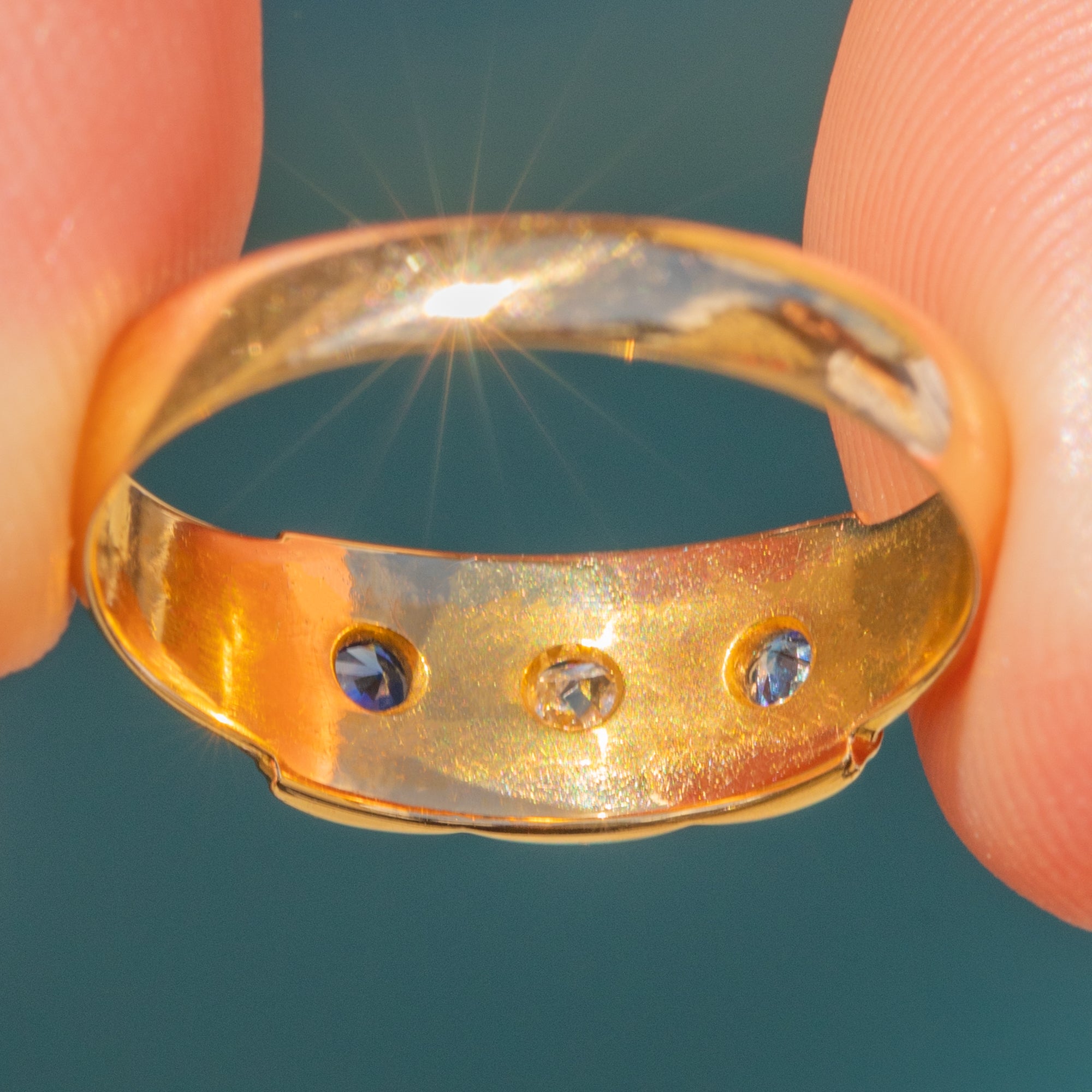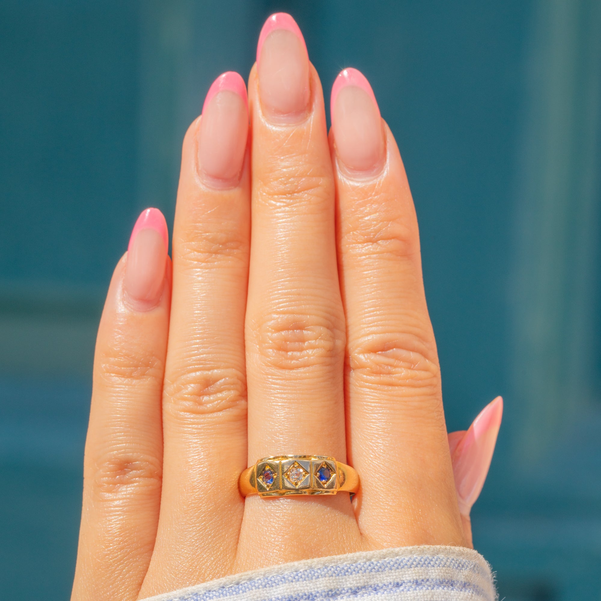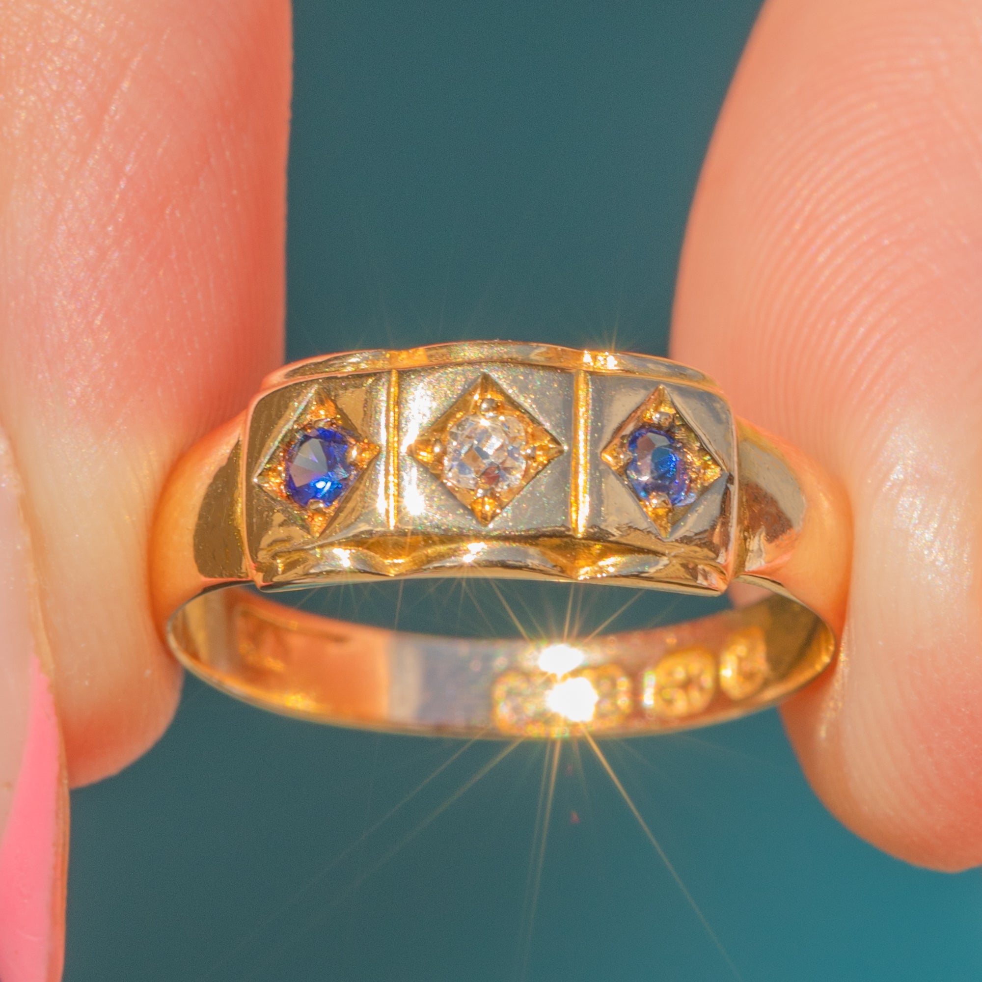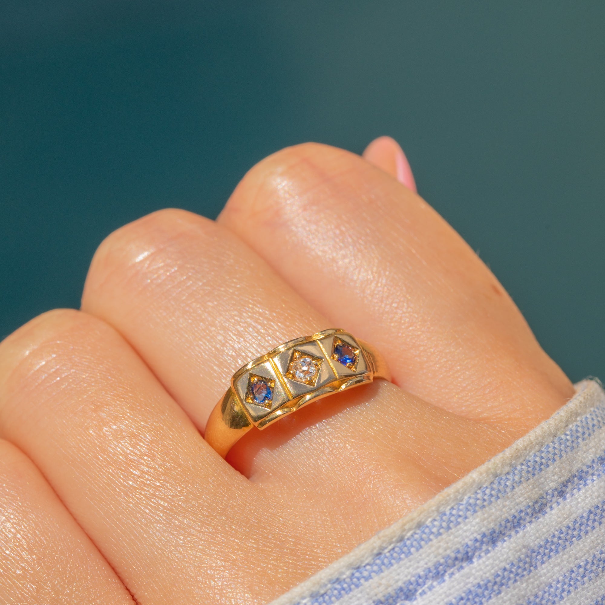 Dated to 1896, this Victorian 18ct Gold Sapphire Diamond gypsy ring is a wonderful antique piece! Inlaid with a scintillating Diamond flanked by deep blue Sapphires, she is akin to a star-lit midnight sky.