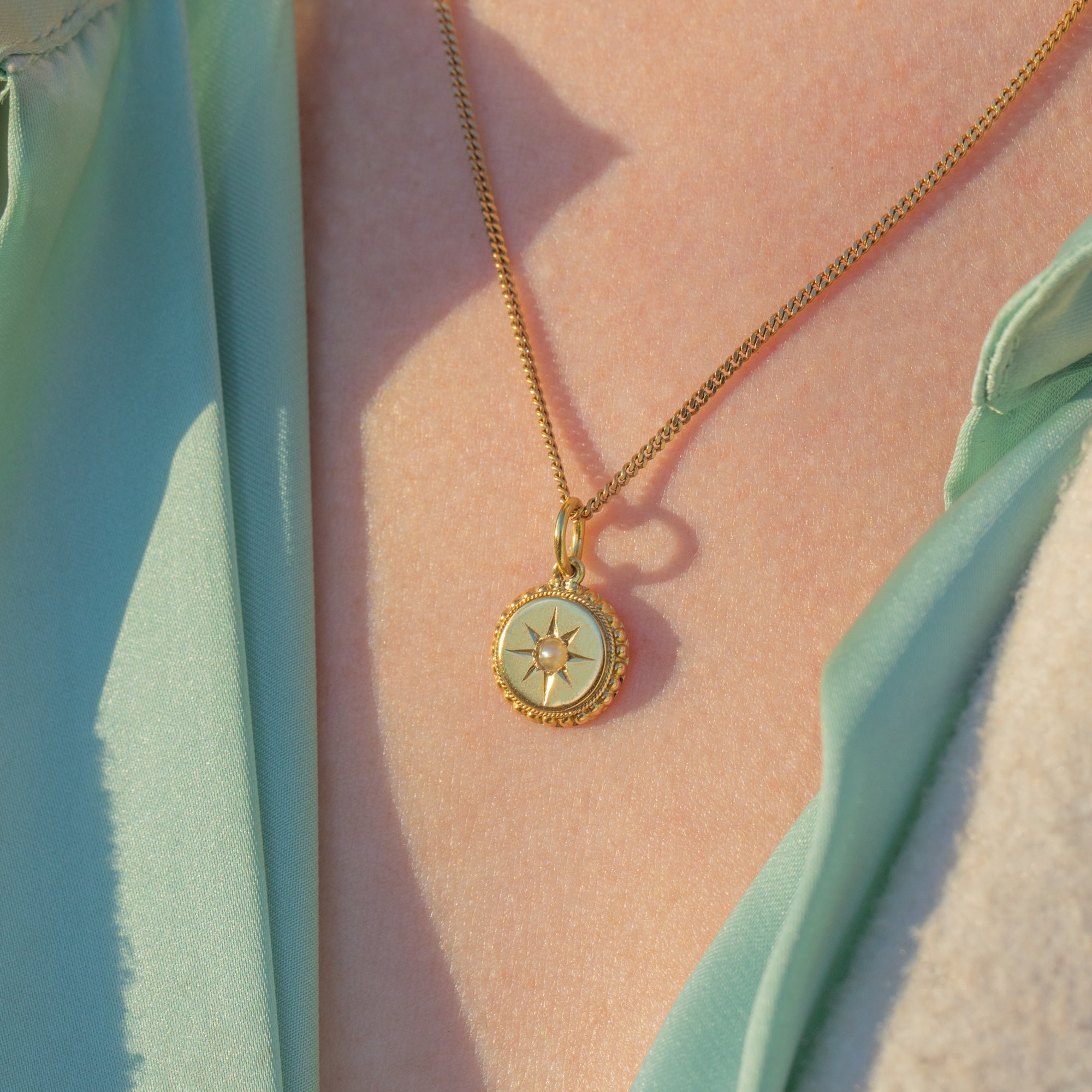 Featuring a lustrous champagne-hued Pearl and stunning star settings, this petite Etruscan charm is bursting with antique character. Wonderfully versatile, this ethereal Victorian charm is a must-have!