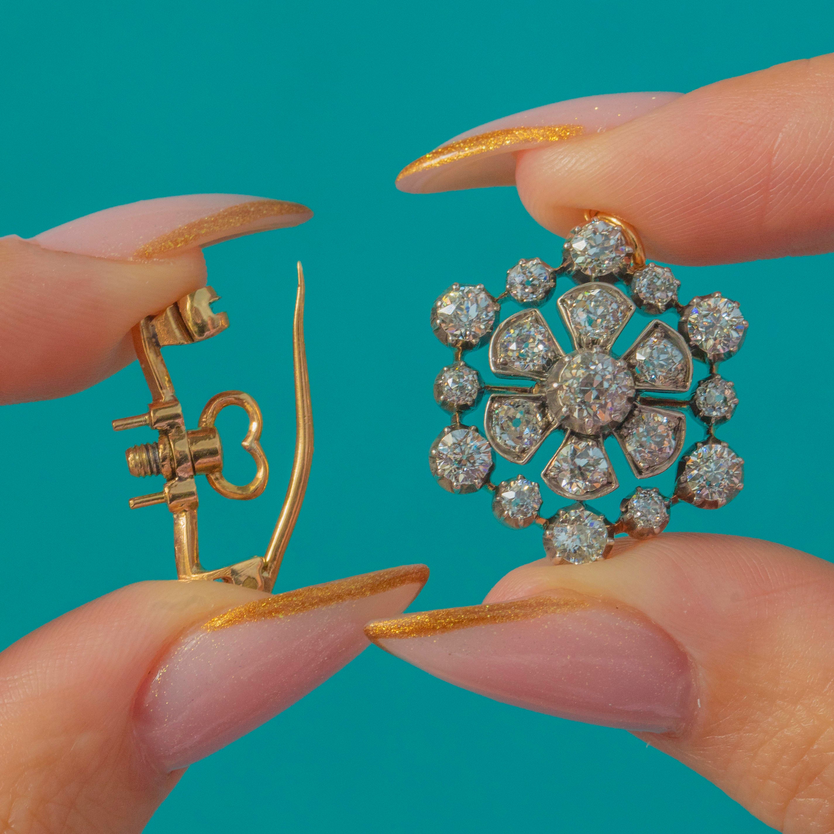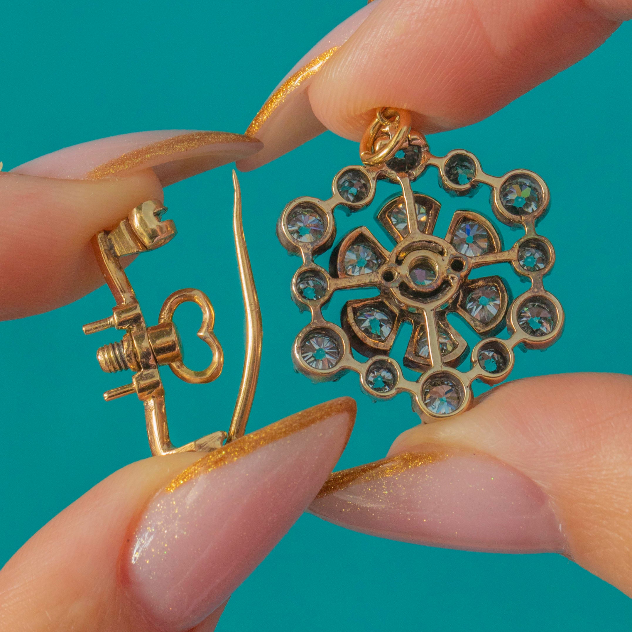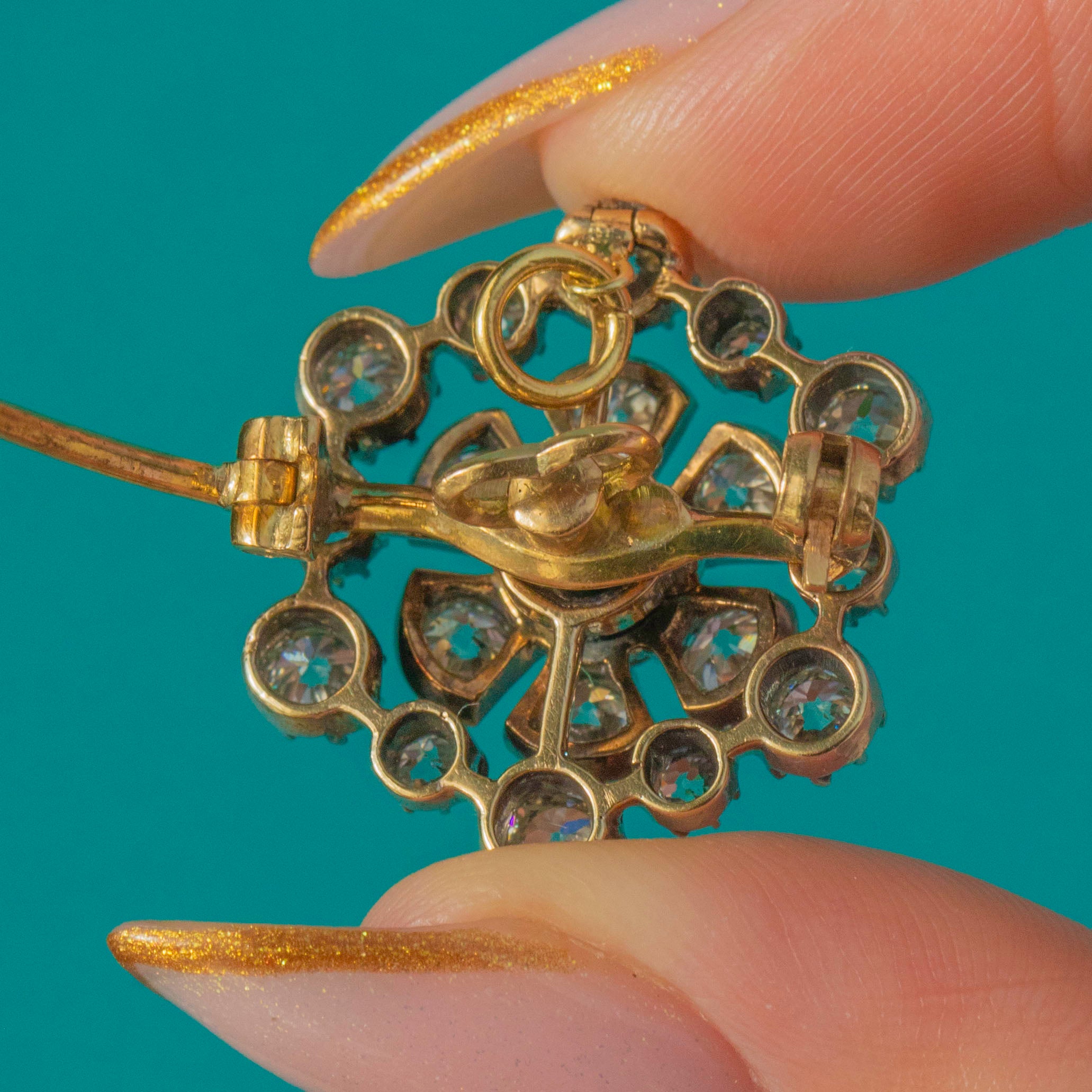 A breathtaking Victorian Diamond pendant with brooch fittings, crafted circa 1890 in rich 18ct Gold with traditional Silver settings. This elegant cluster features approximately 2.50cts of bright and lively Old Mine Cut Diamonds arranged in a classic rosette form, sparkling beautifully with every movement.