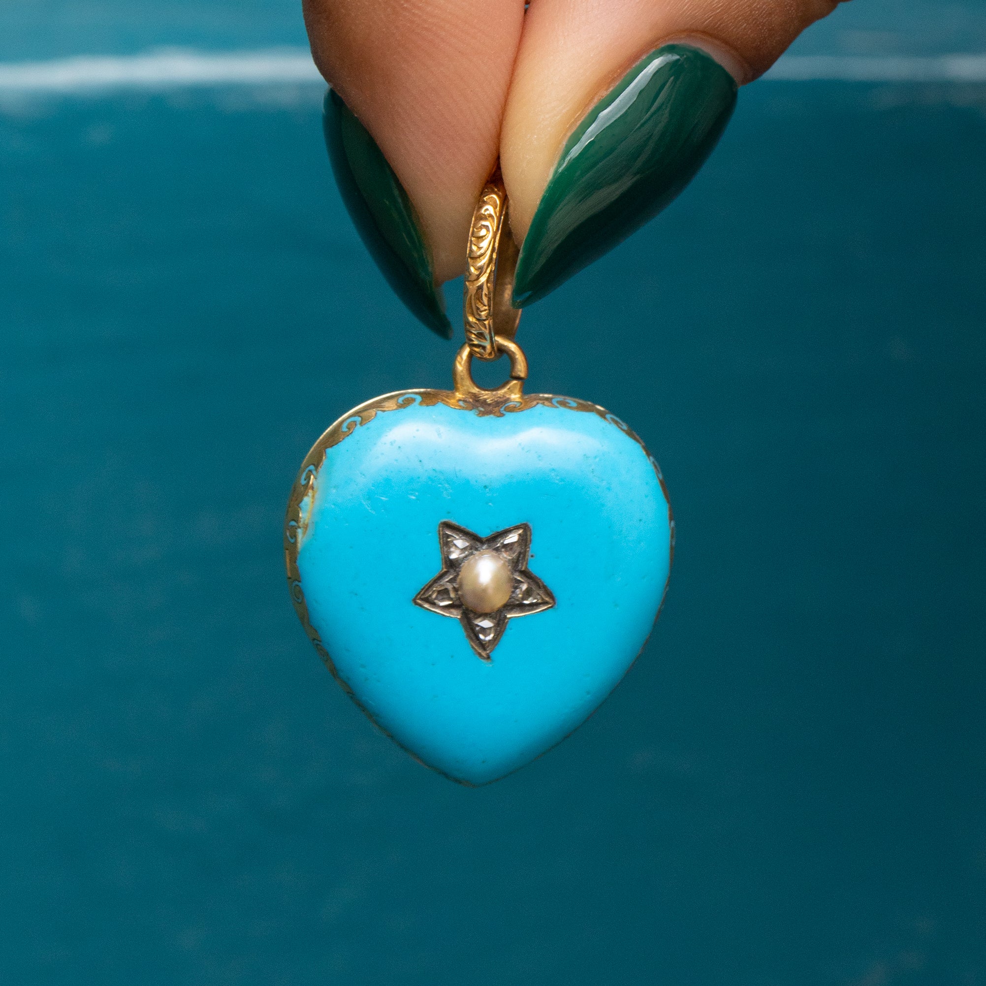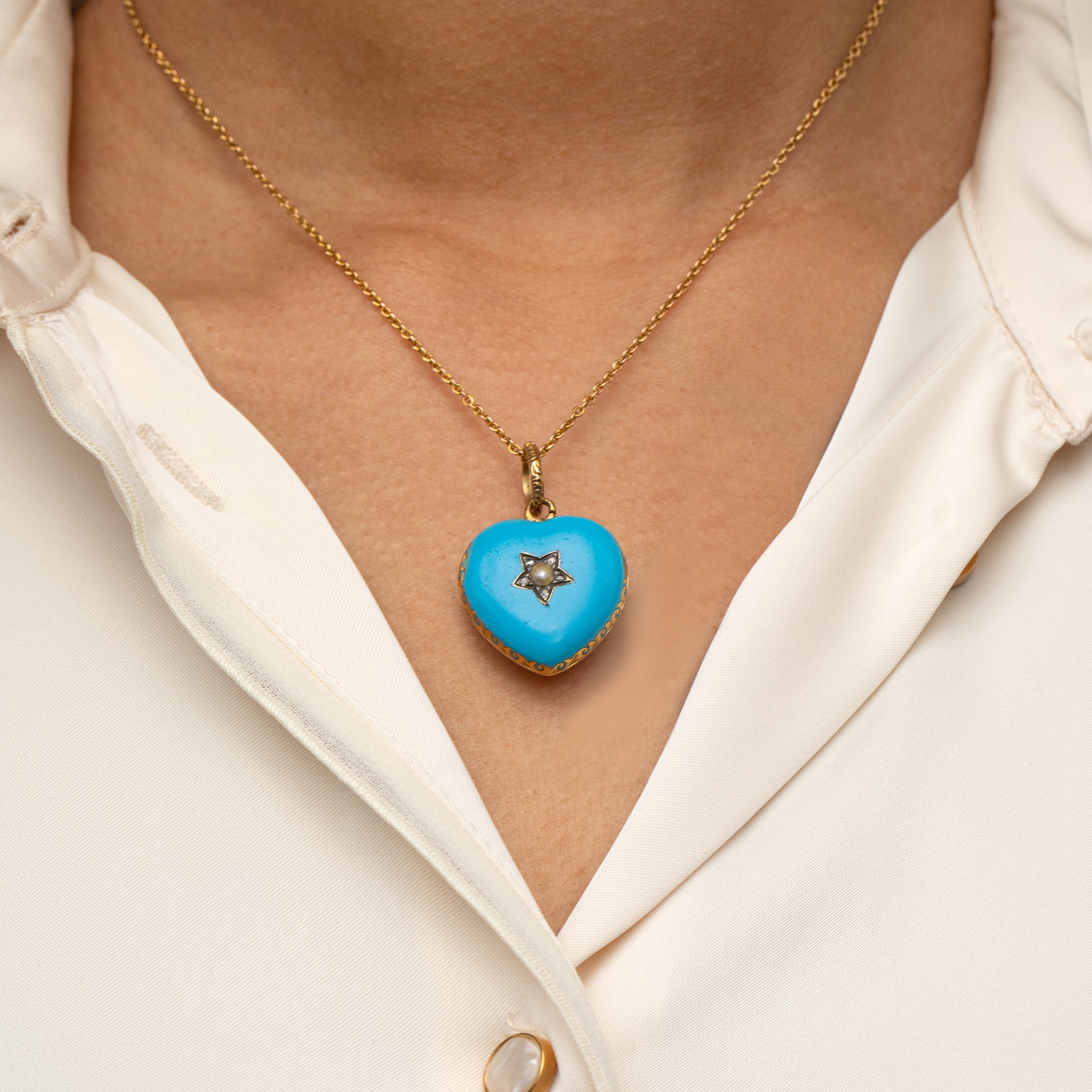VERY GOOD. This Victorian 18ct Gold blue Enamel Pearl Diamond star heart locket is in very good condition. The locket is in great shape and smooth to the touch. The Pearl is creamy and securely held within its setting. The Diamonds are all present with only some minor nibbles to note, however, they are all securely held in their settings. The Enamel has the most vibrant duck egg blue hue with some age-related wear to note, most notably the top corner of the heart, but this is not particularly noticeable face-on. The Glass panel has some scratches across its surface, which is to be expected from a piece her age. The hinge is in perfect working order and will keep the contents securely inside, and complete with a generous jump ring, you can wear this striking antique locket confidently!