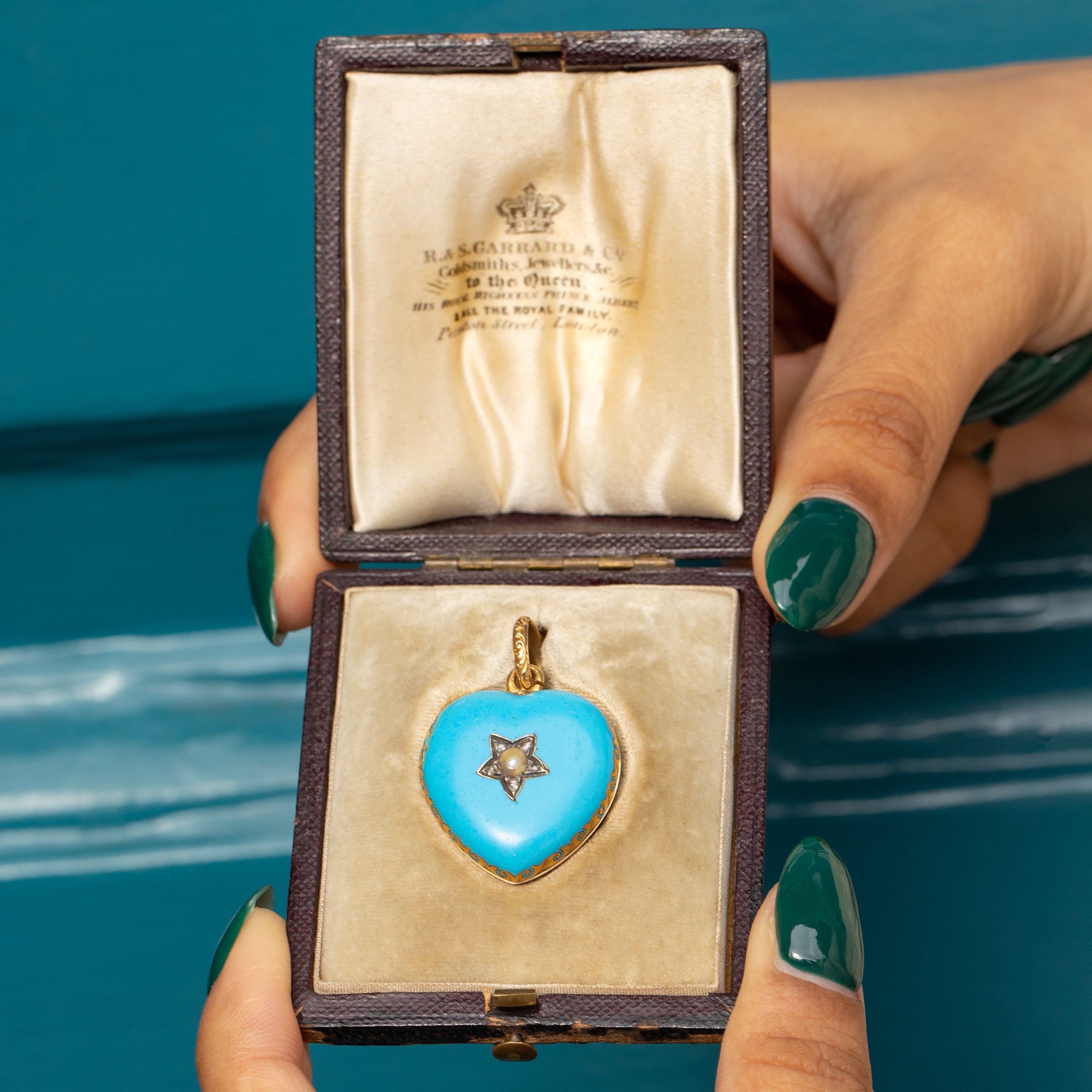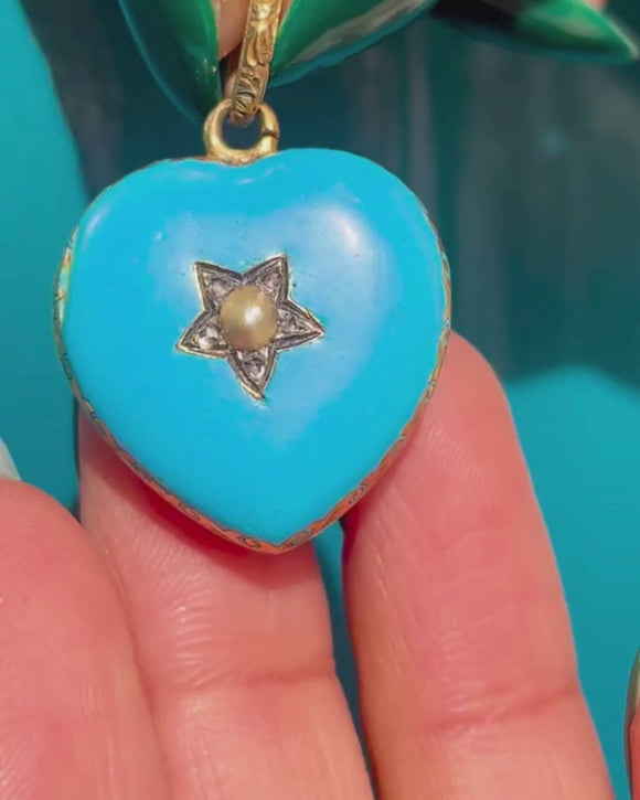 This Victorian 18ct Gold blue Enamel Pearl Diamond star heart locket is one of the finest solid Gold lockets we have had the pleasure of seeing and comes complete with its original fitted antique jewellery box!