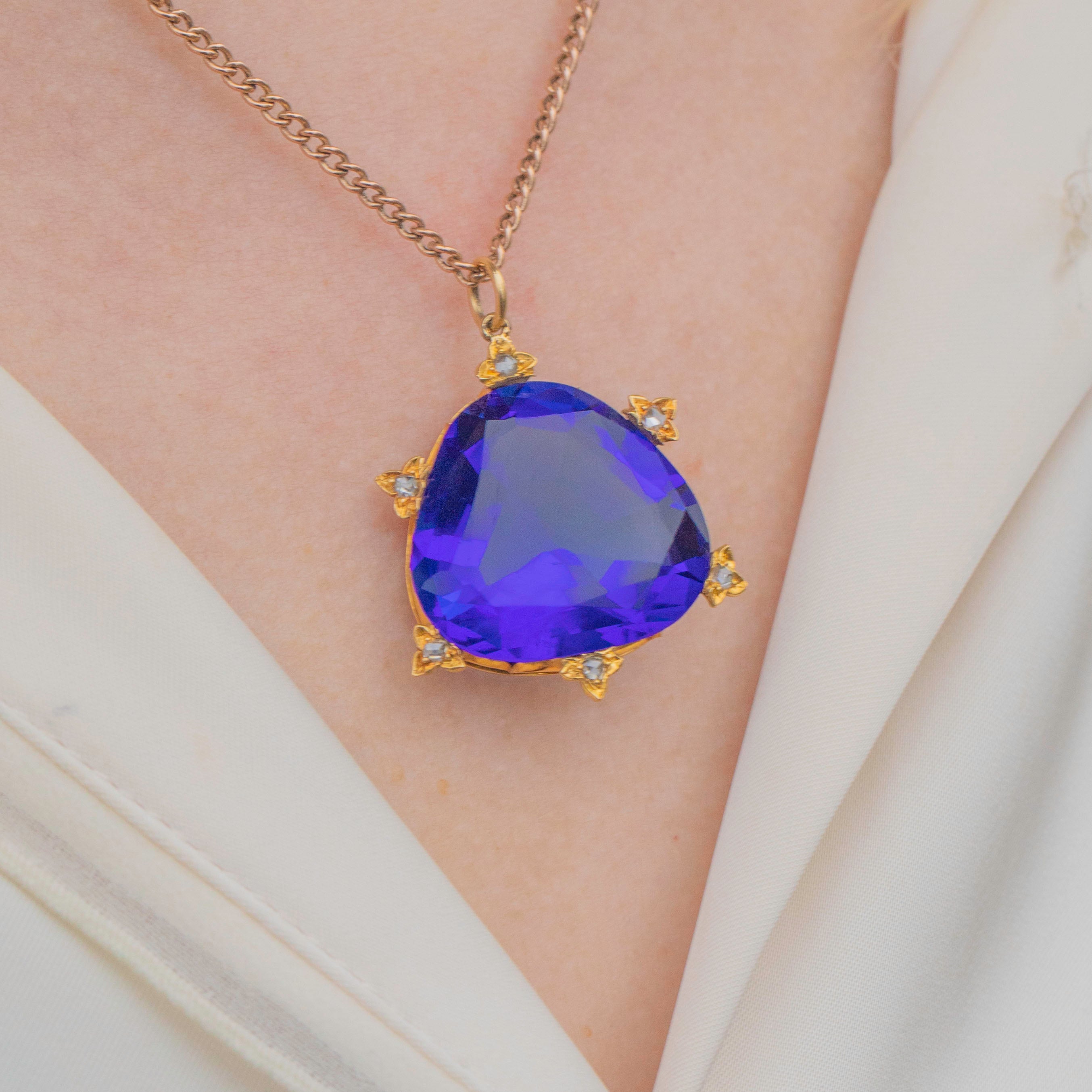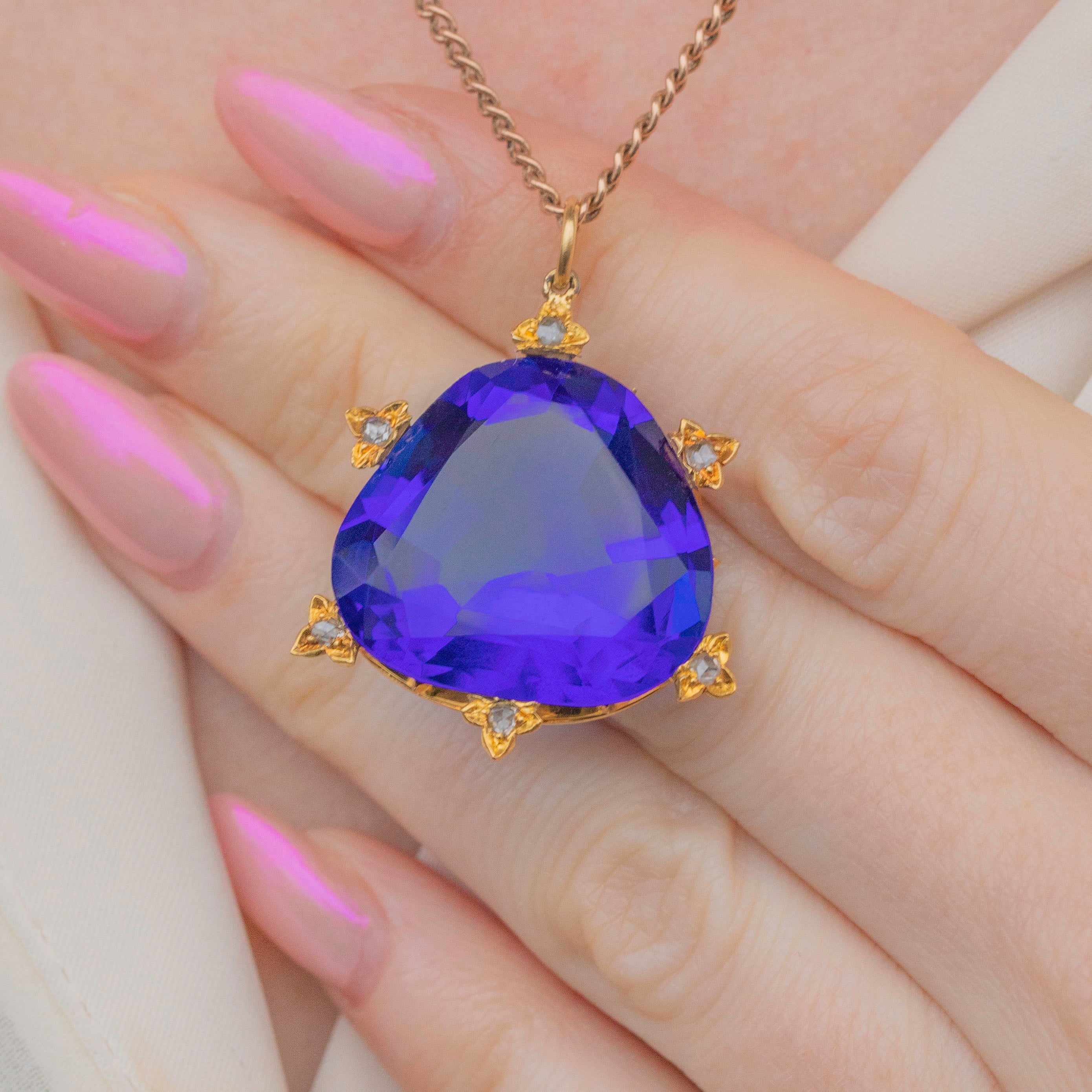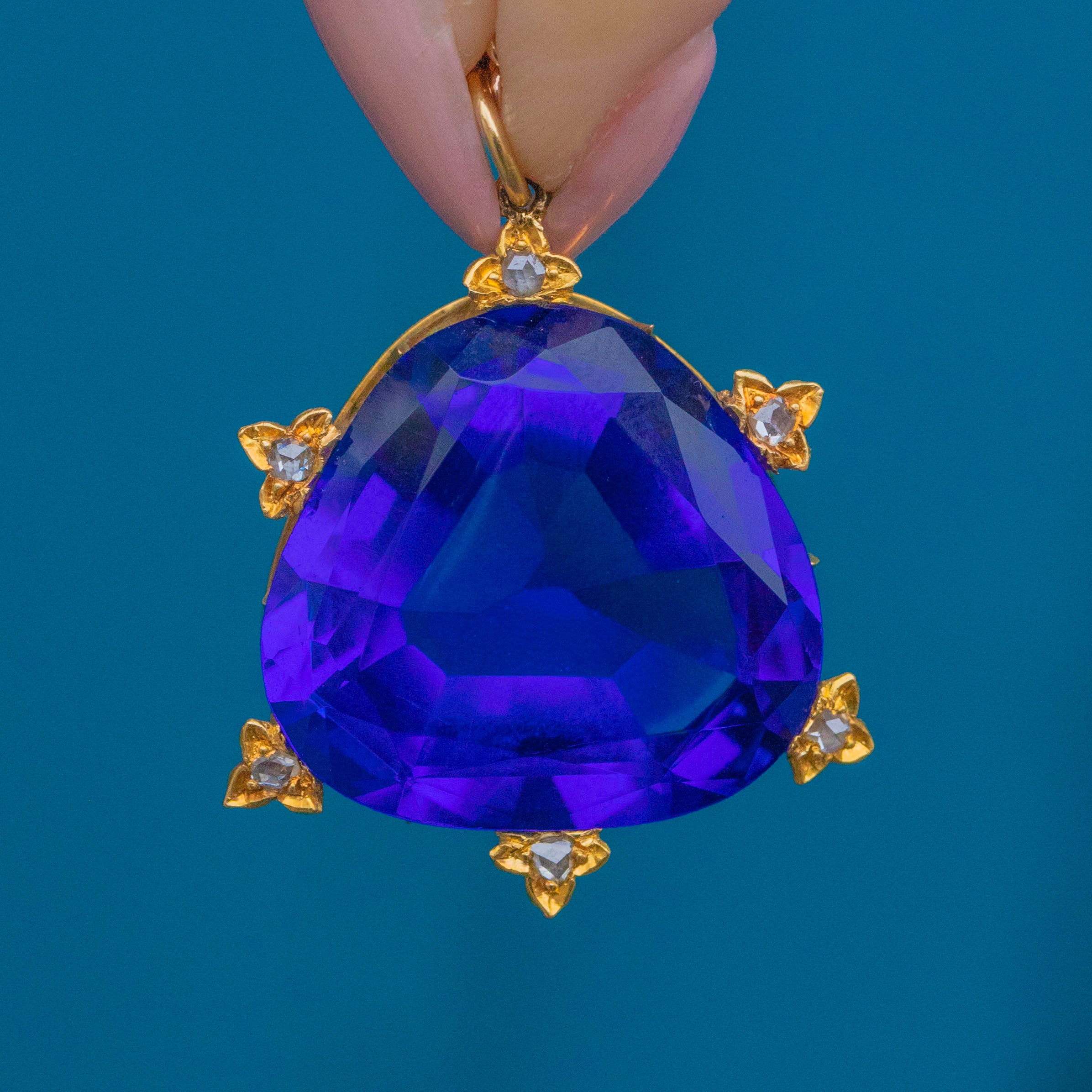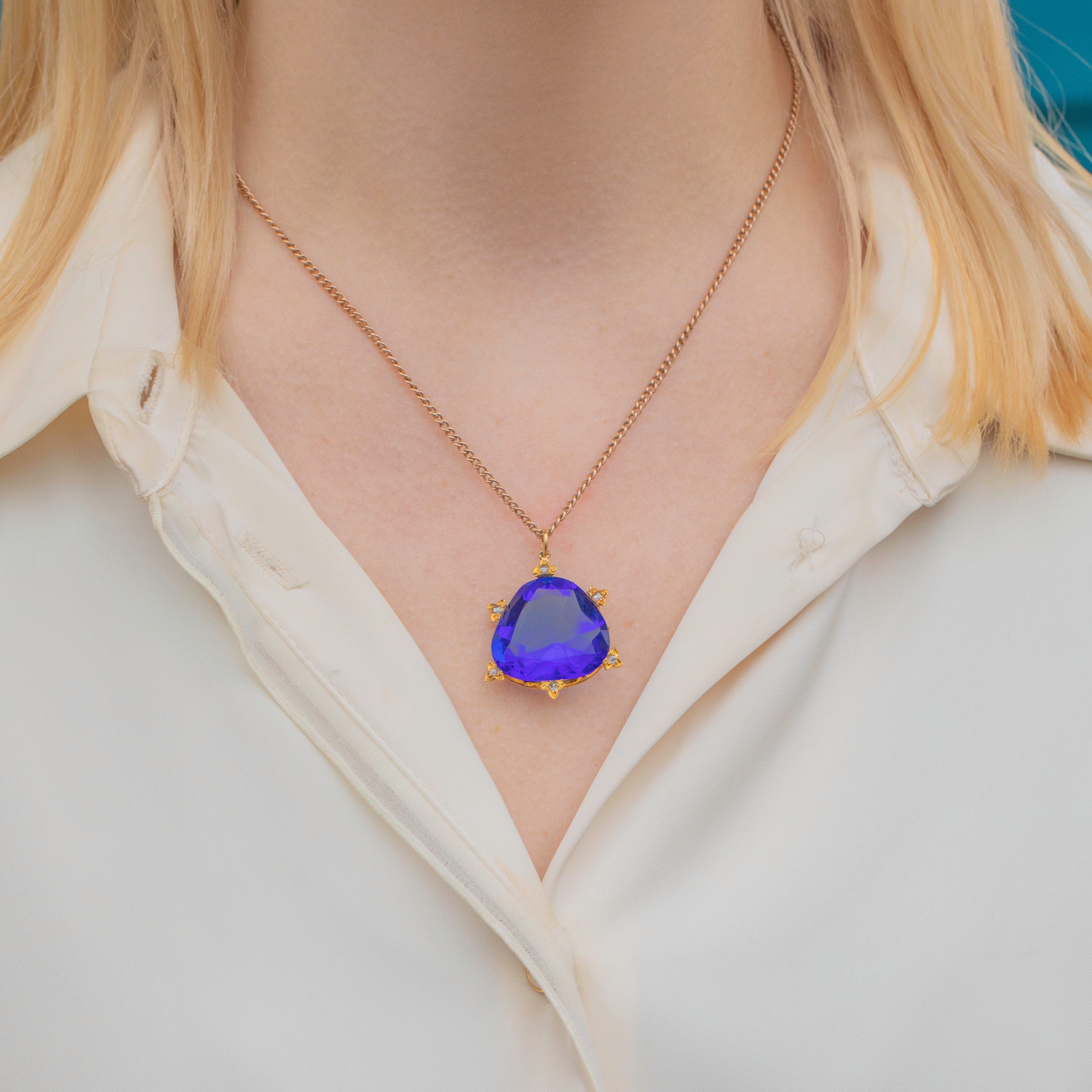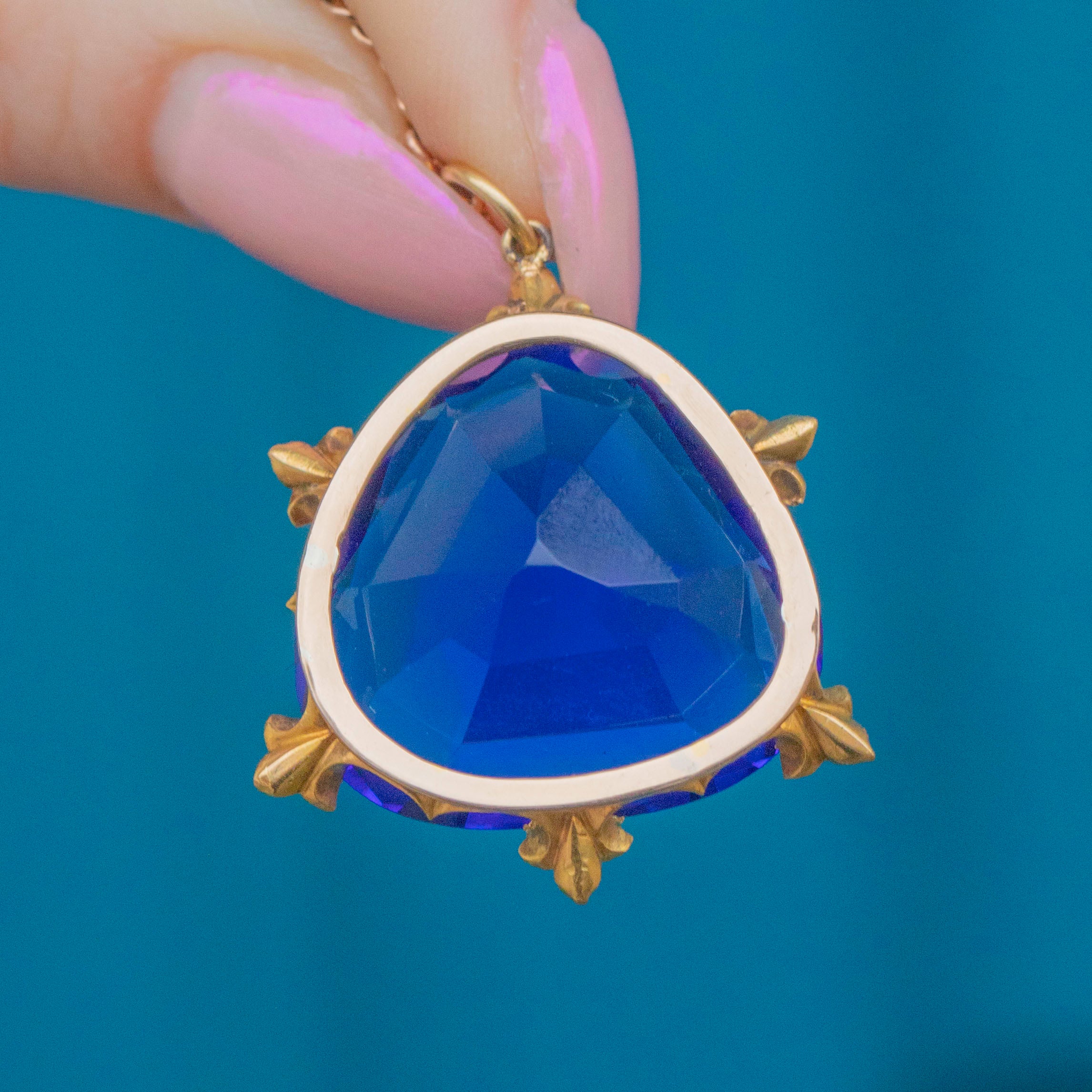 This Victorian 18ct Gold blue Paste & Diamond pendant is a marvel! Home to a ravishing blue Paste gemstone, taking a unique triangular form with softened edges, this striking pendant comes complete with twinkling Diamond accents.