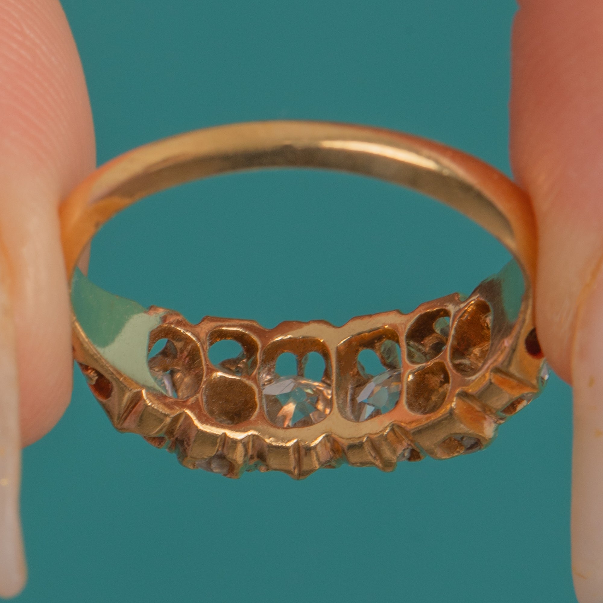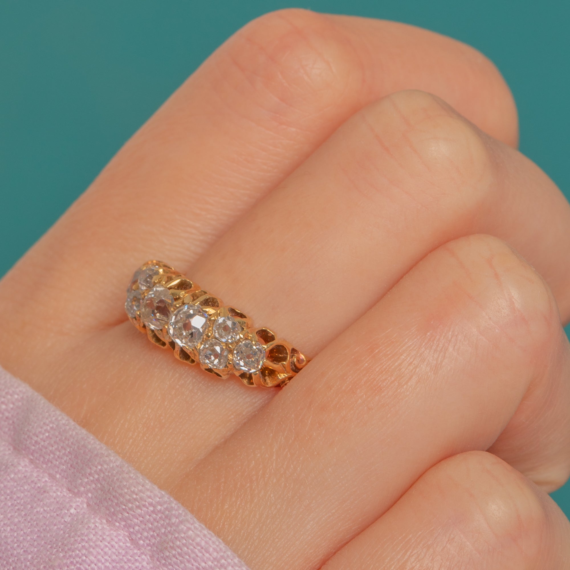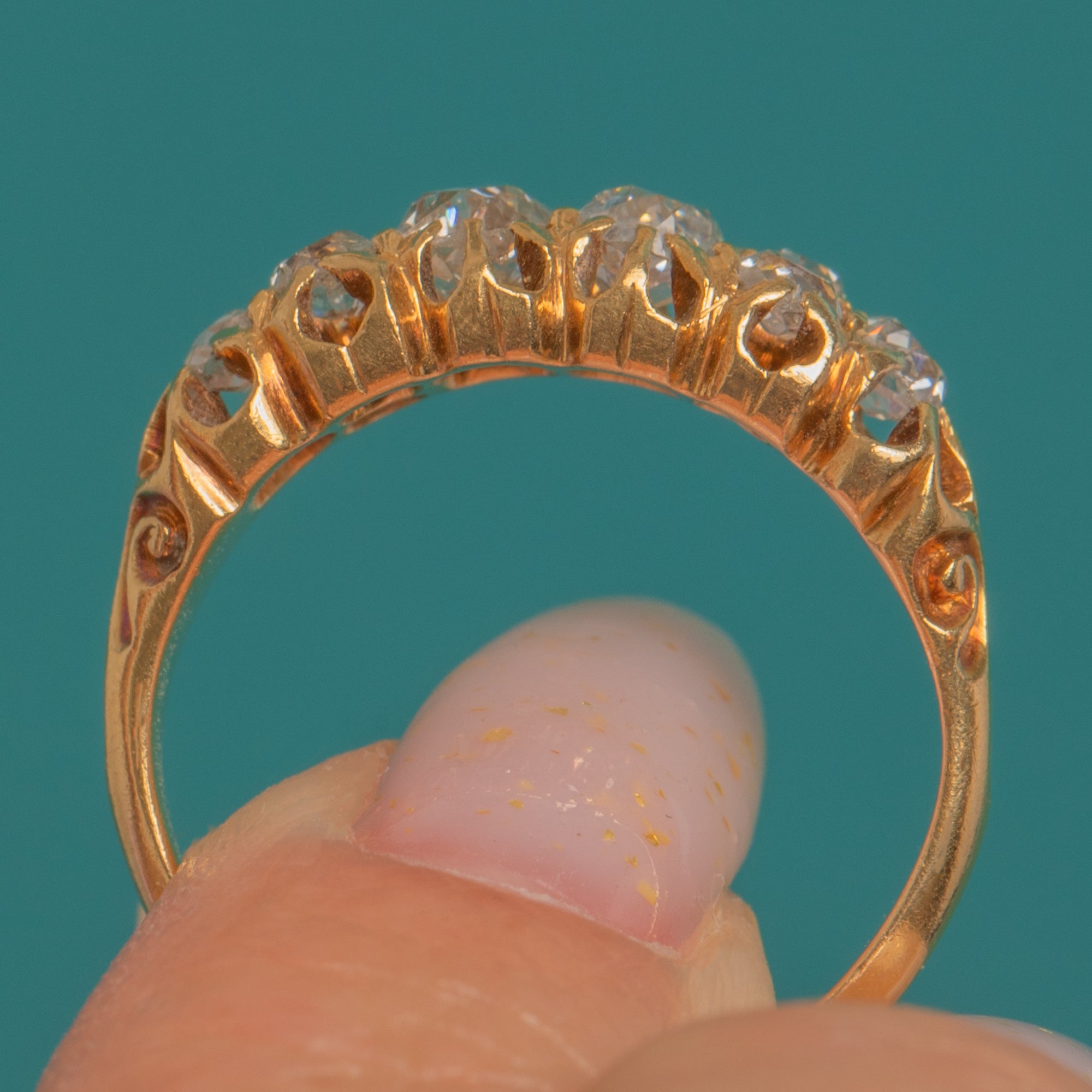 A romantic late Victorian carved half-hoop, this exquisite ring showcases eight chunky old-cut Diamonds set low across the finger in glowing 18ct Gold. A pierced trellis gallery and scroll-carved shoulders lend beautiful movement and texture to the design, all hand-finished for that sought-after antique character.