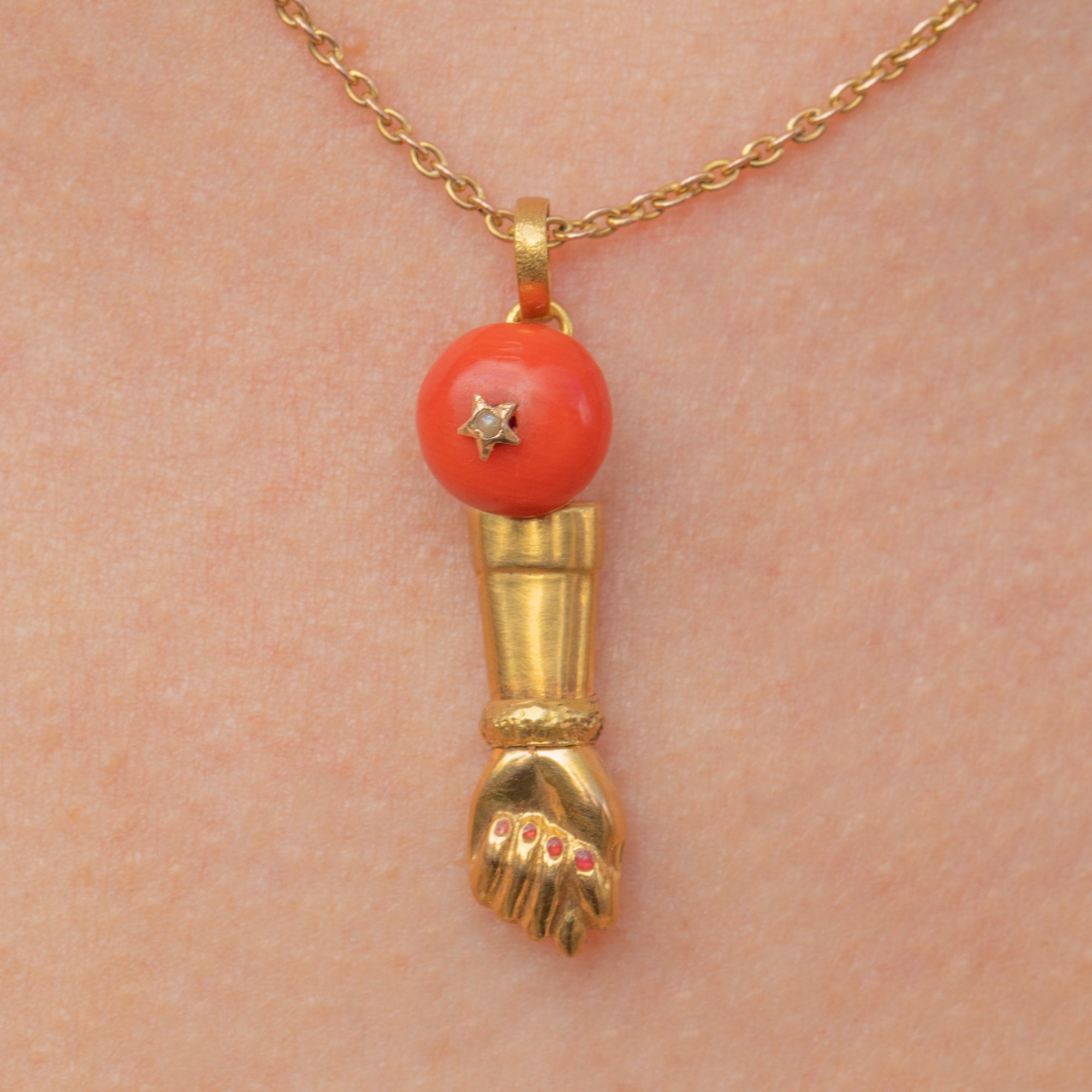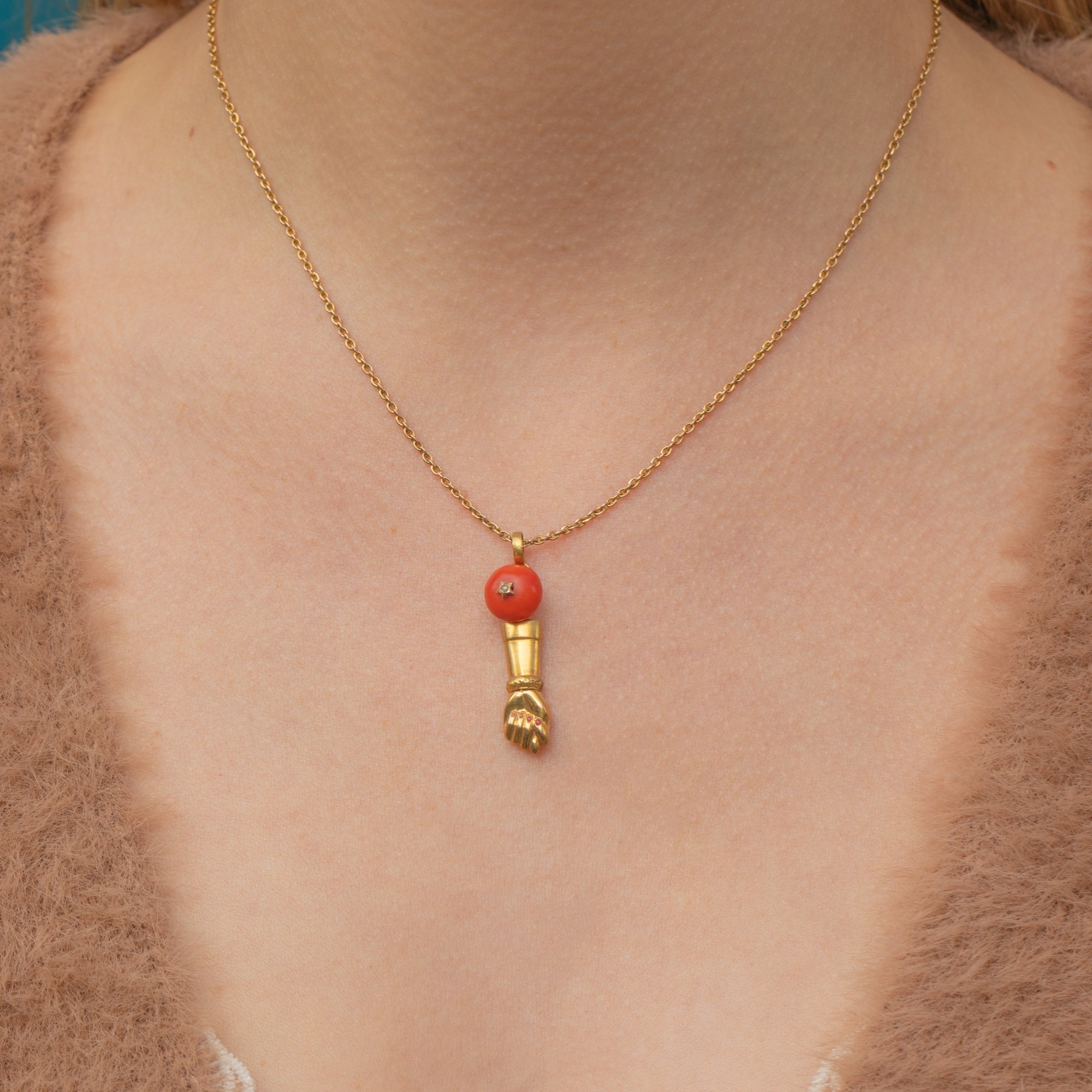 EXCELLENT. This unique antique 18ct Gold Coral Figa hand charm is in wonderful condition. It has kept incredibly well and is free from any chips or surface wear. Overall, she is a lovely antique item, and truly a one-off piece!