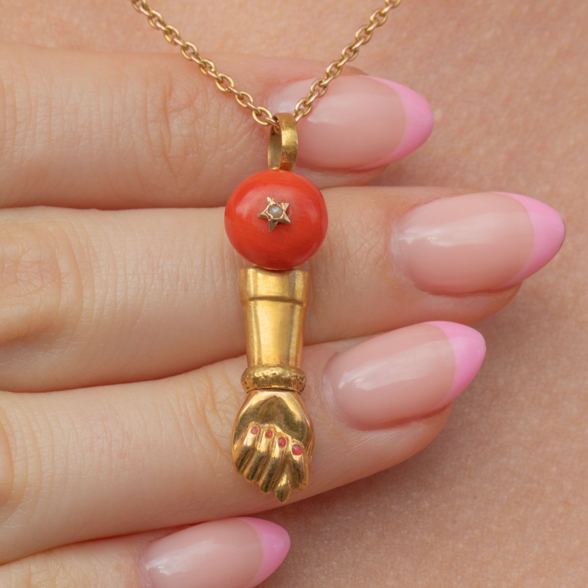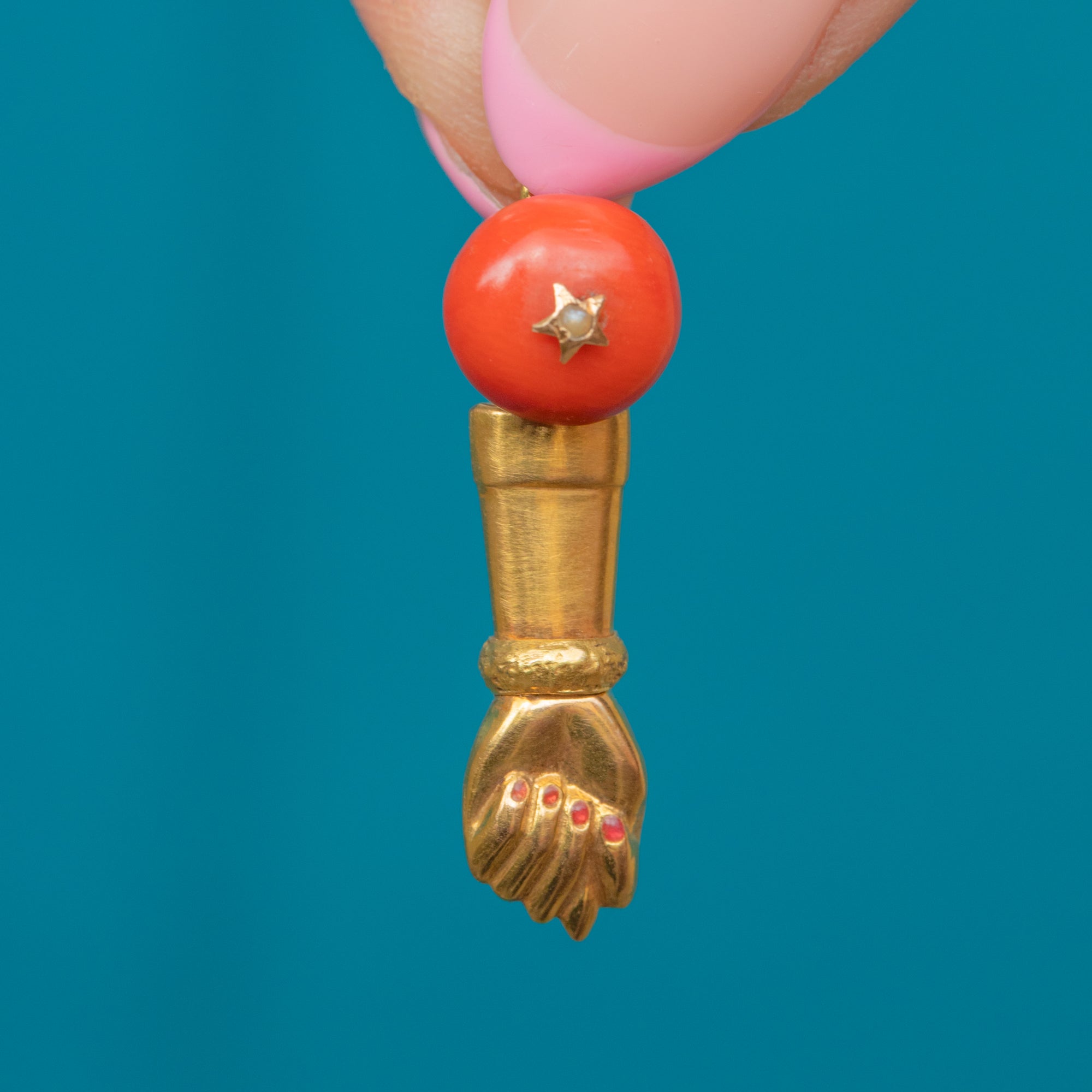 You'll never see anything else quite like this antique 18ct Gold Coral Figa hand charm! This Victorian pendant is composed of rich buttery Gold forming her intricate Figa hand, with a radiant Coral and a tiny star-set Pearl for luck! She will bring undeniable power to your antique jewellery collection!
