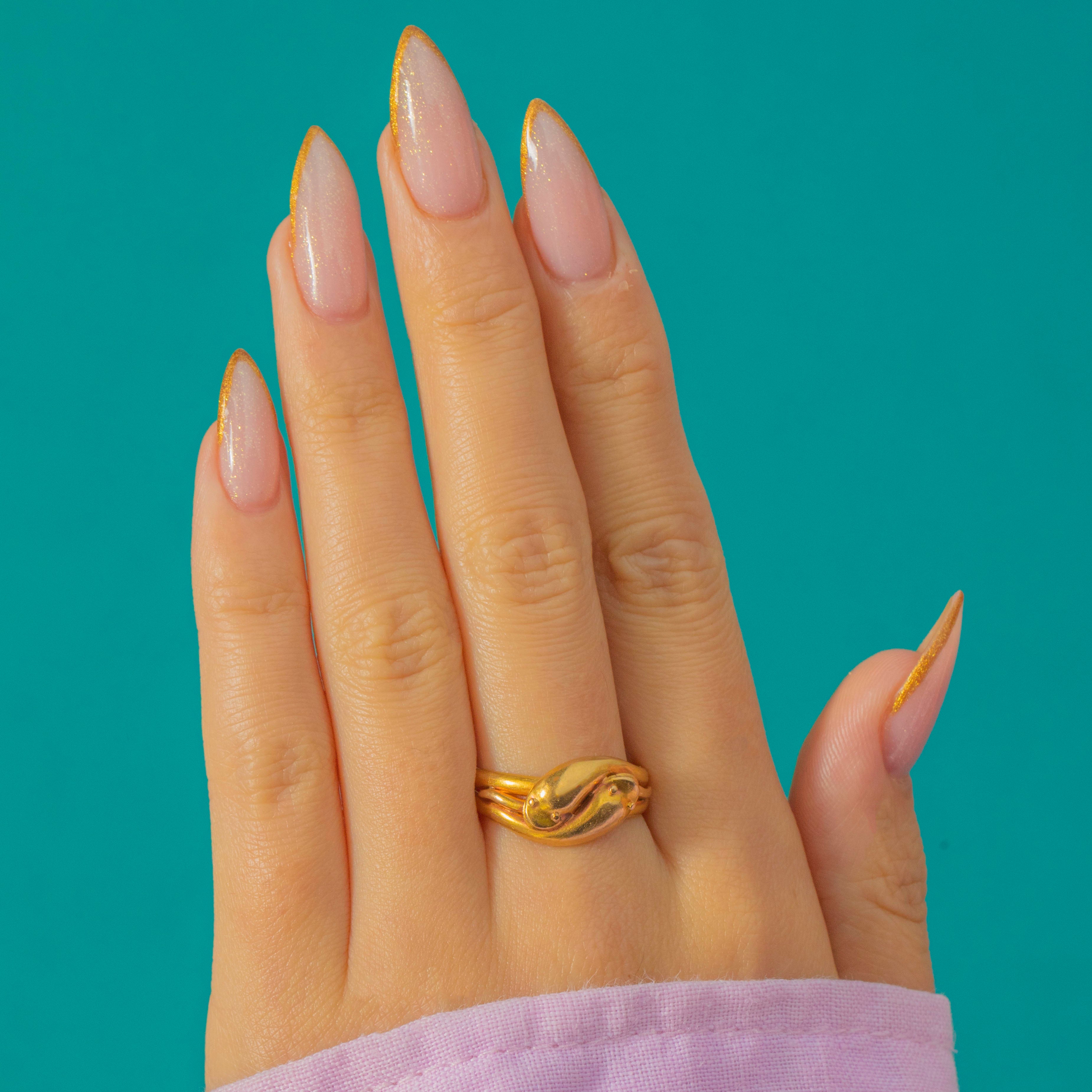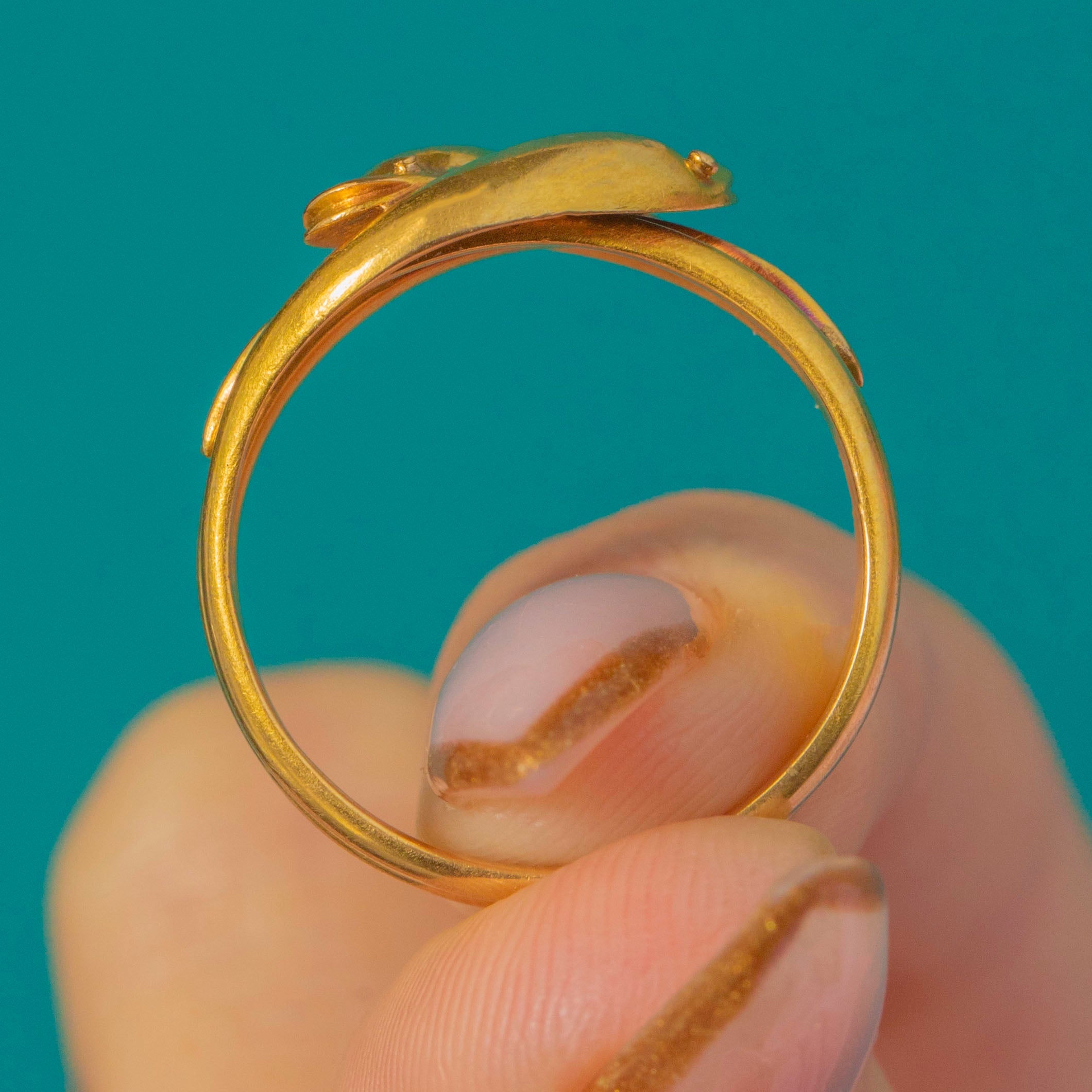 This striking Victorian snake ring is a classic symbol of eternal love, beautifully crafted in rich 18ct Gold. The smooth, sculptural curves of the serpent wrap elegantly around the finger, tapering from a bold, high-coverage front to a comfortable fit at the back. Its warm buttery Gold and lovely weight make it an iconic and endlessly wearable antique treasure.
