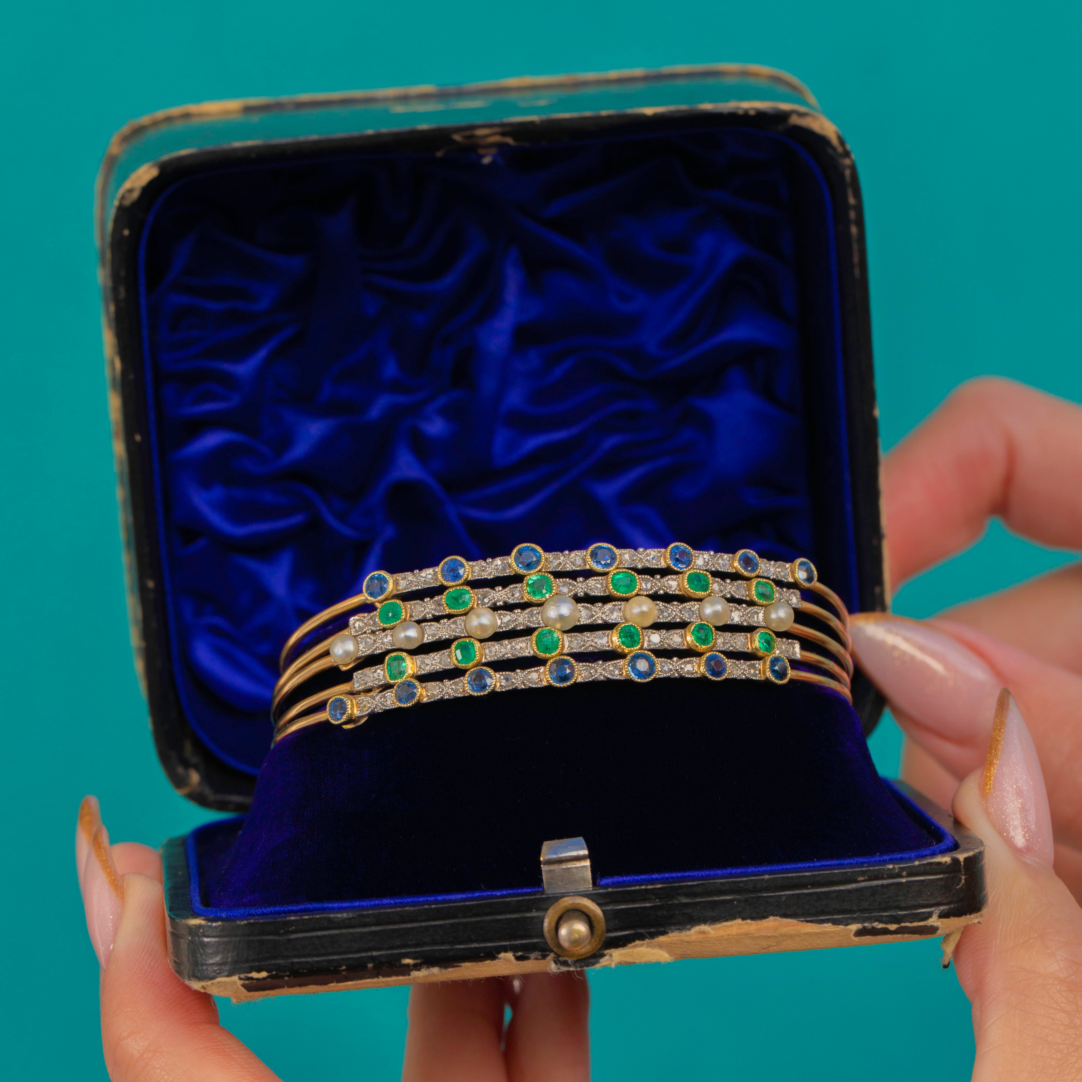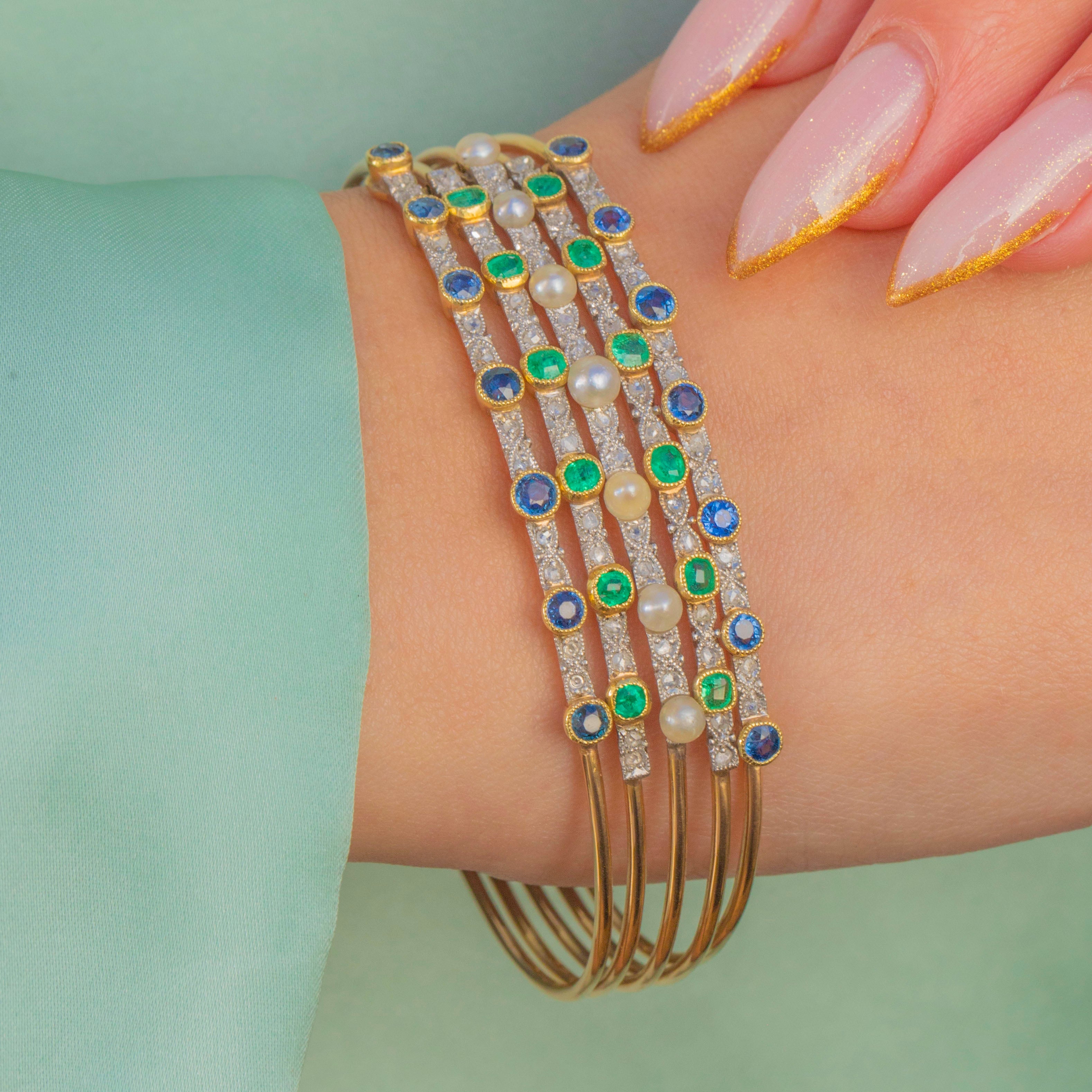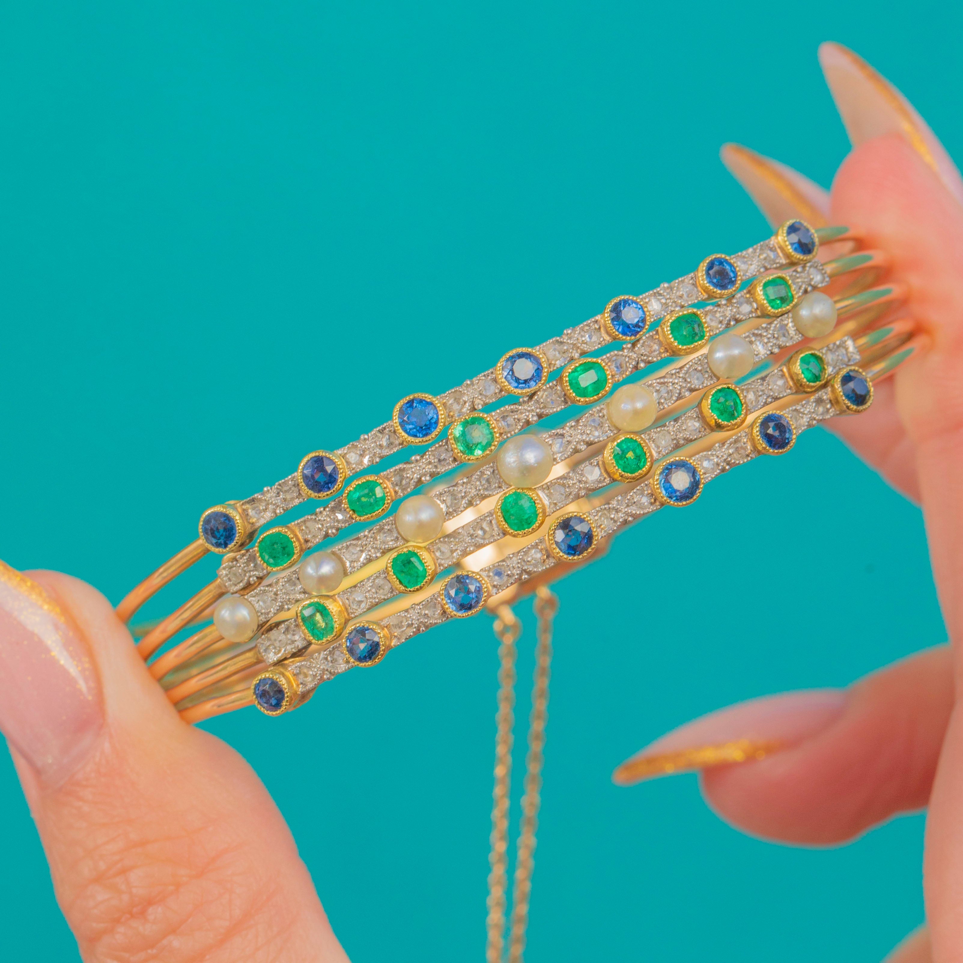 An exceptionally beautiful Edwardian harem bangle crafted in luxurious 18ct Gold with Platinum settings, set with bright Sapphires, vivid Emeralds and Natural Pearls. This style, inspired by exoticism and the romanticism of the early 20th century, is wonderfully opulent on the wrist and retains all its elegance today.