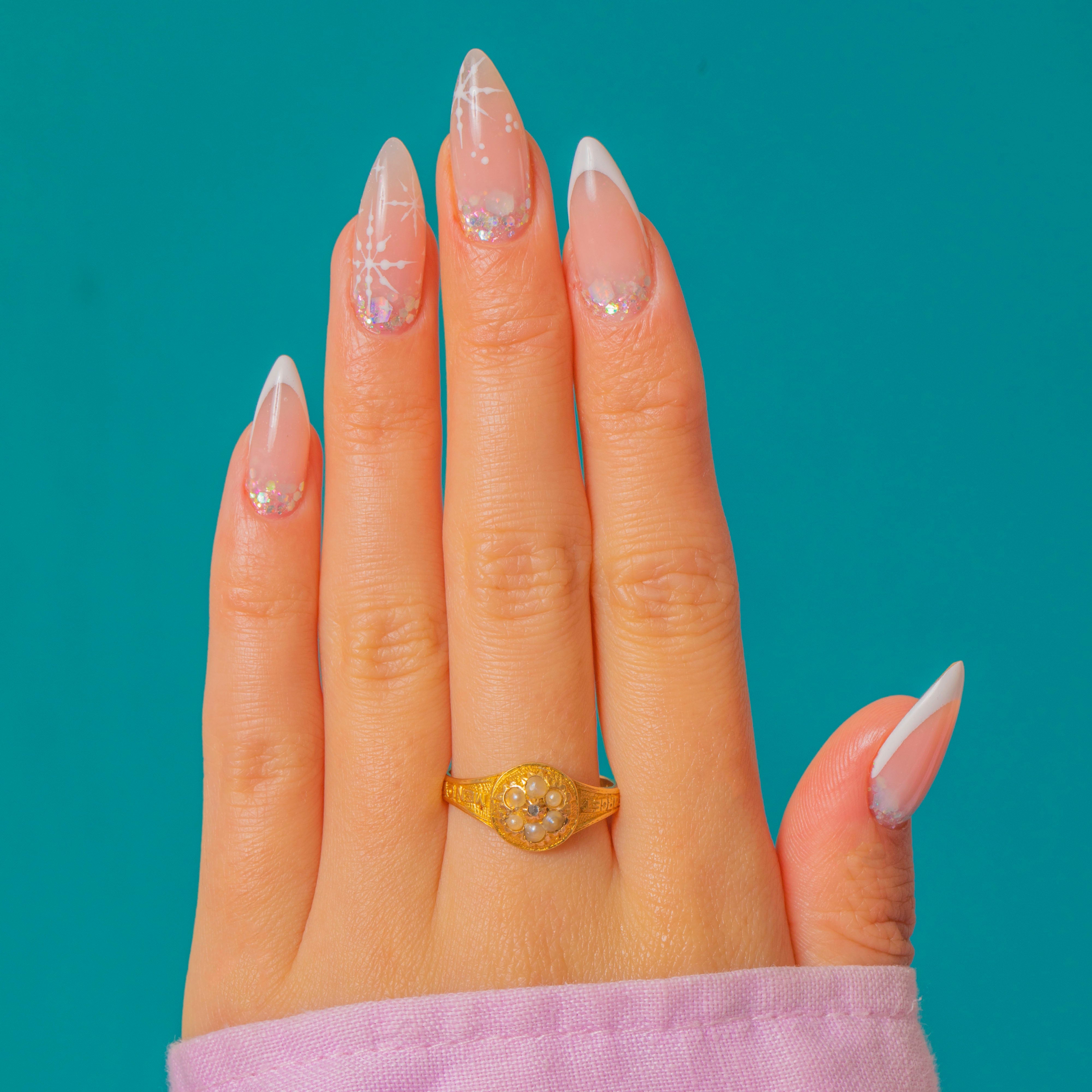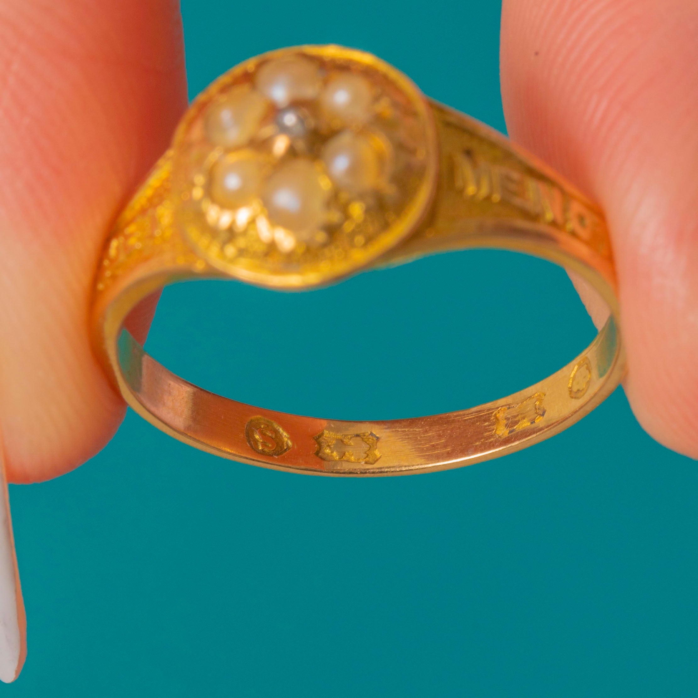 Victorian 18ct Gold Engraved Forget-Me-Not Pearl Diamond Ring, c.1867 Item added