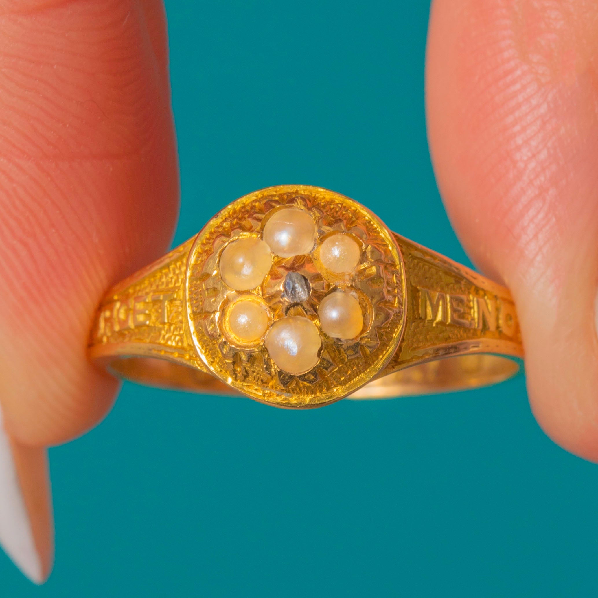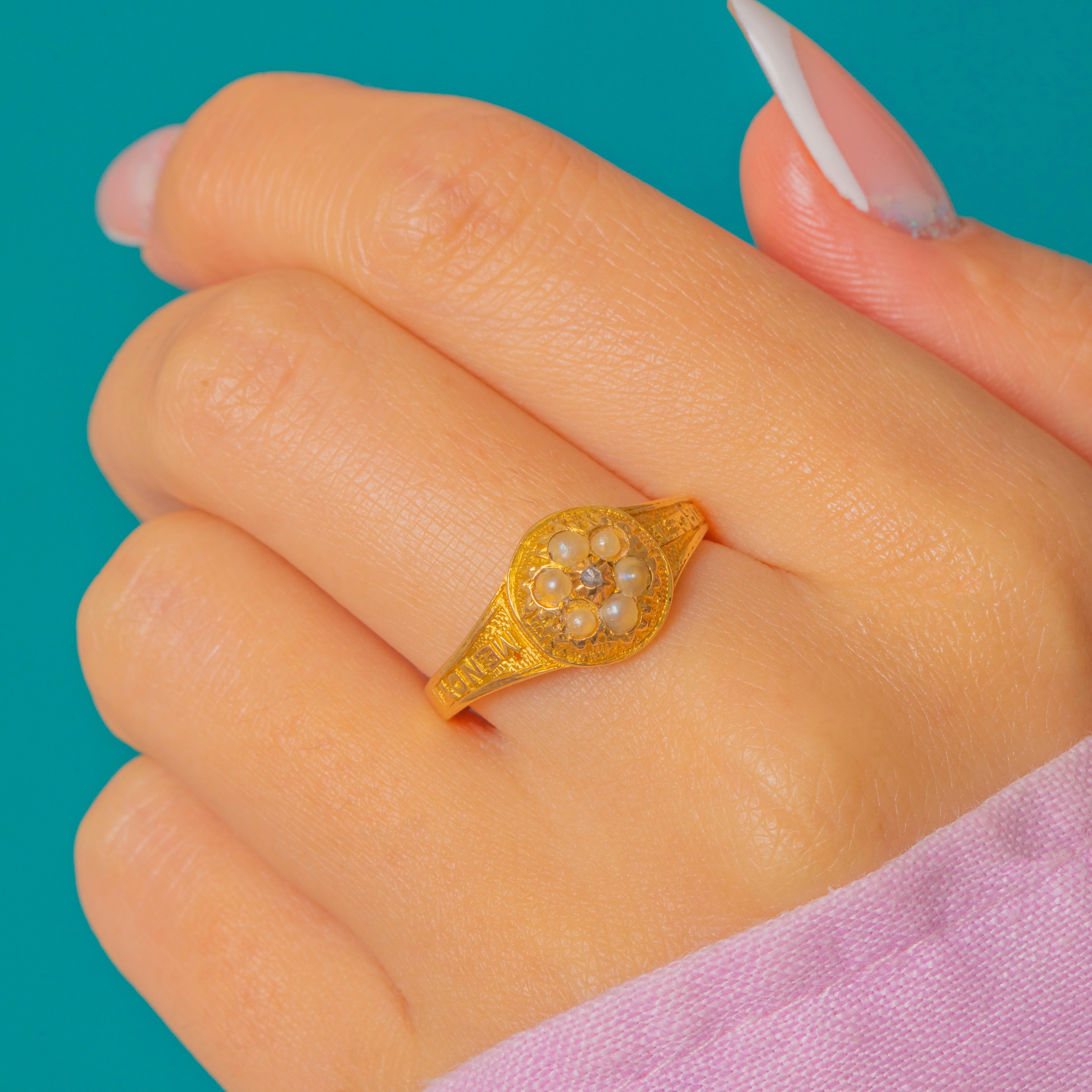 In her centre sits a dainty flower cluster, formed of six lustrous Pearls surrounding a central scintillating Diamond. The ring face is flanked by inscribed shoulders reading 'FORGET ME NOT', a unique feature adding allure and Victorian charm to this antique ring.