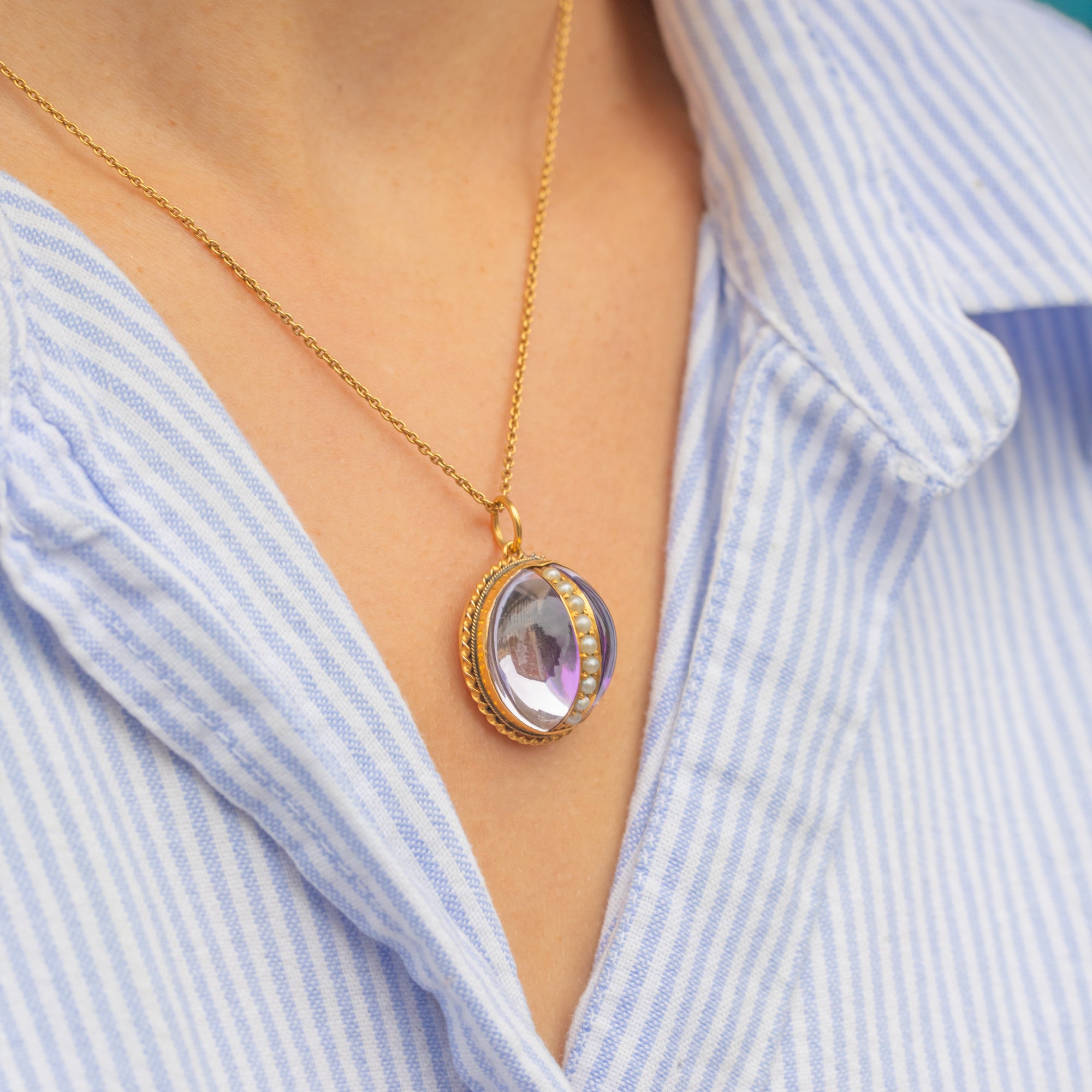 A single 2mm Pearl accents the design, adding a delicate contrast against the glowing Quartz. Bold in scale yet refined in detail, this pendant is a wonderful example of Victorian gemstone jewellery and makes a dramatic statement when worn on a fine chain or layered with other antique pieces.