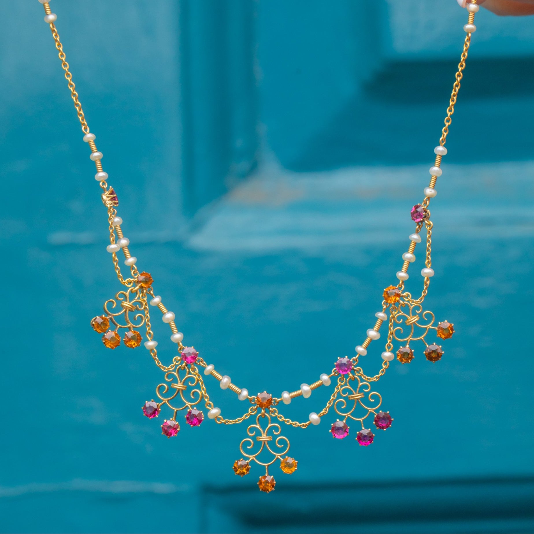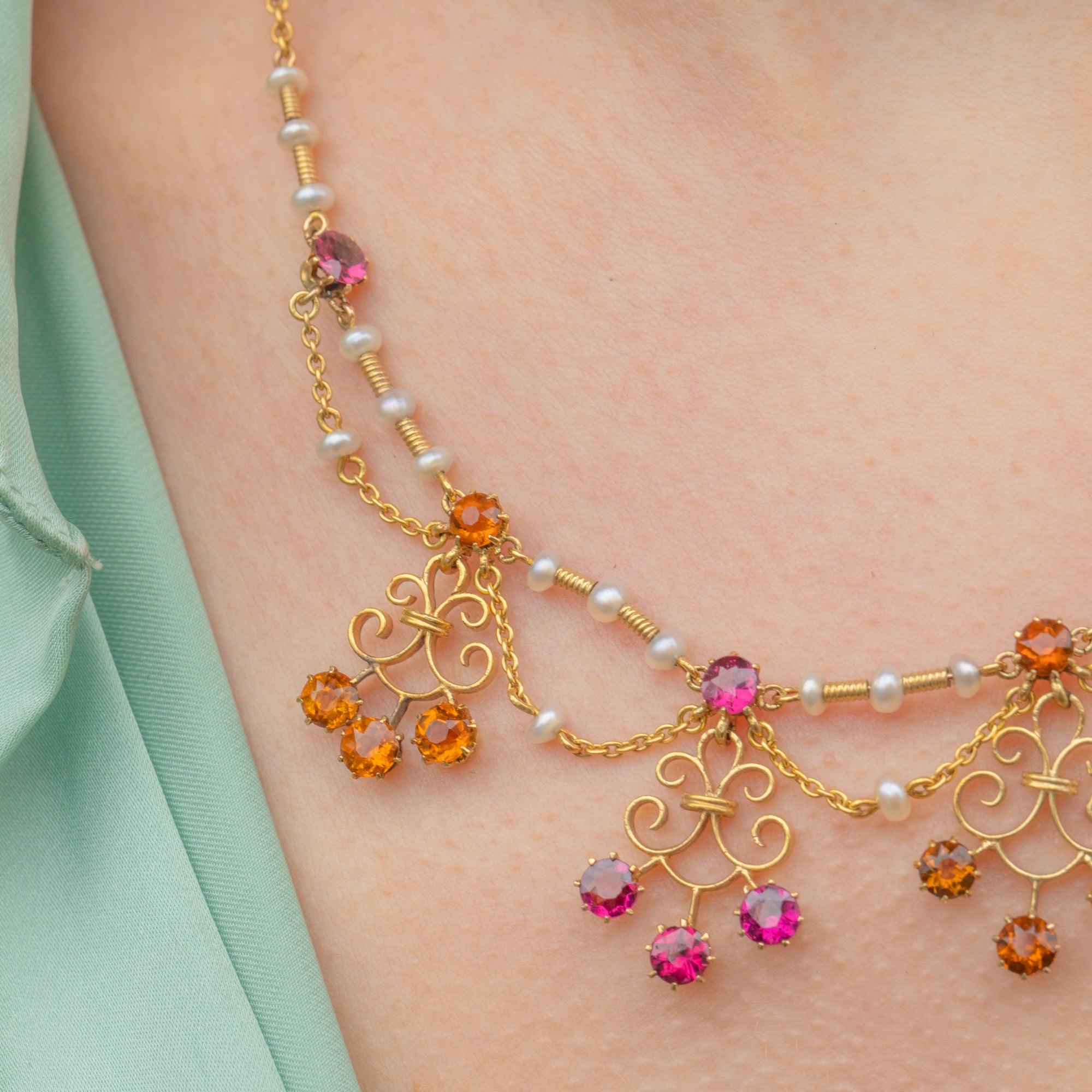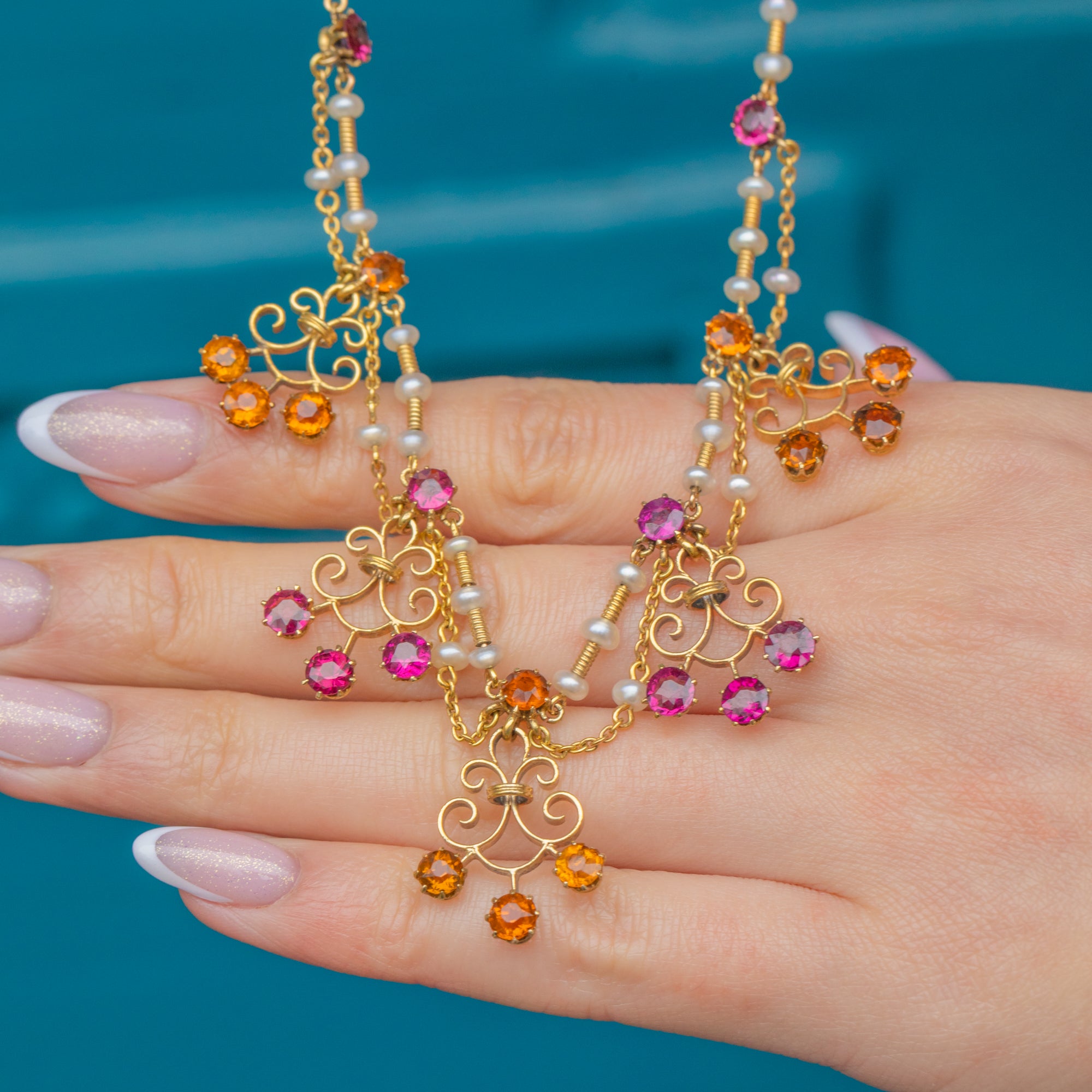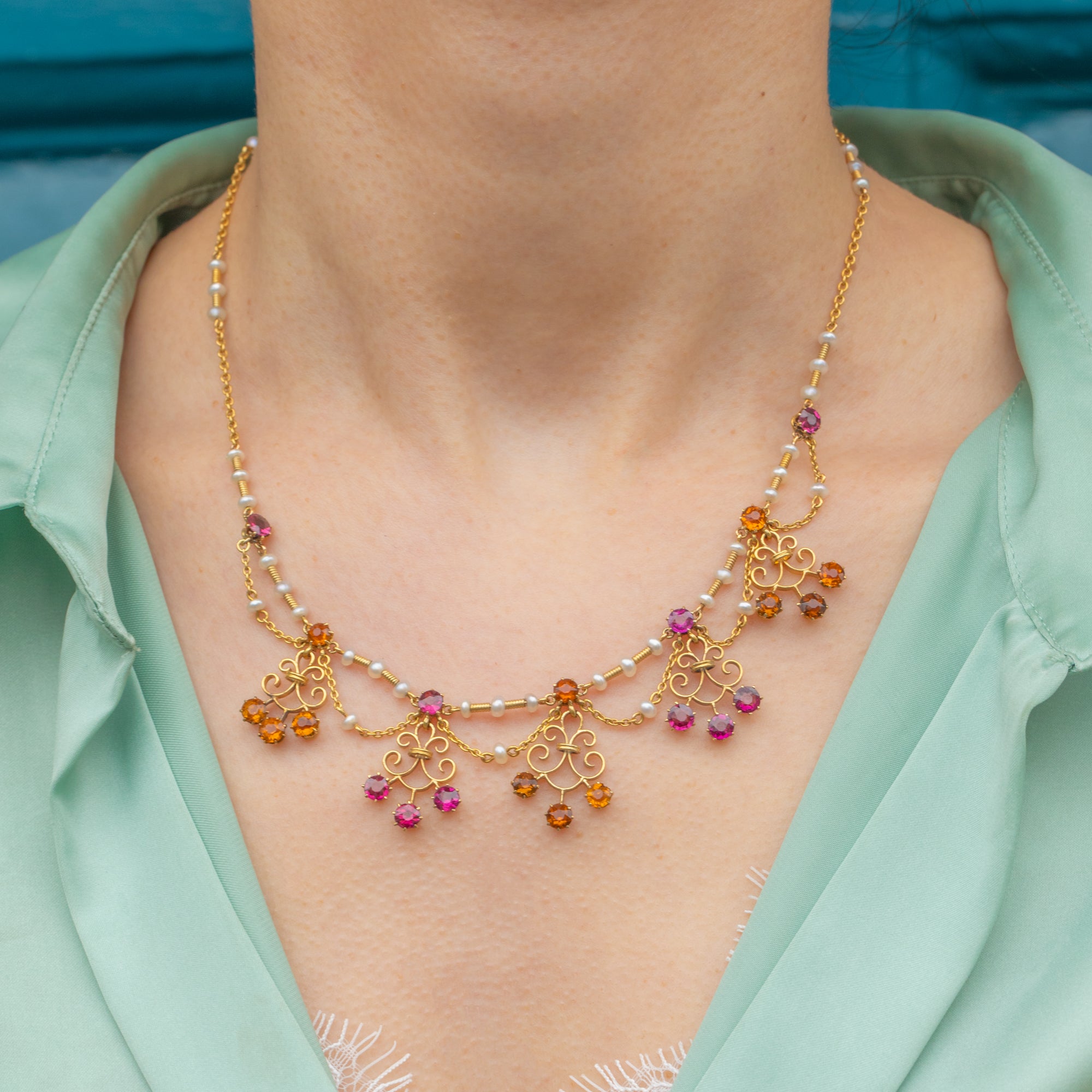 This Victorian 18ct Gold Garnet Citrine & Pearl fringe necklace is packed with antique charm and character!