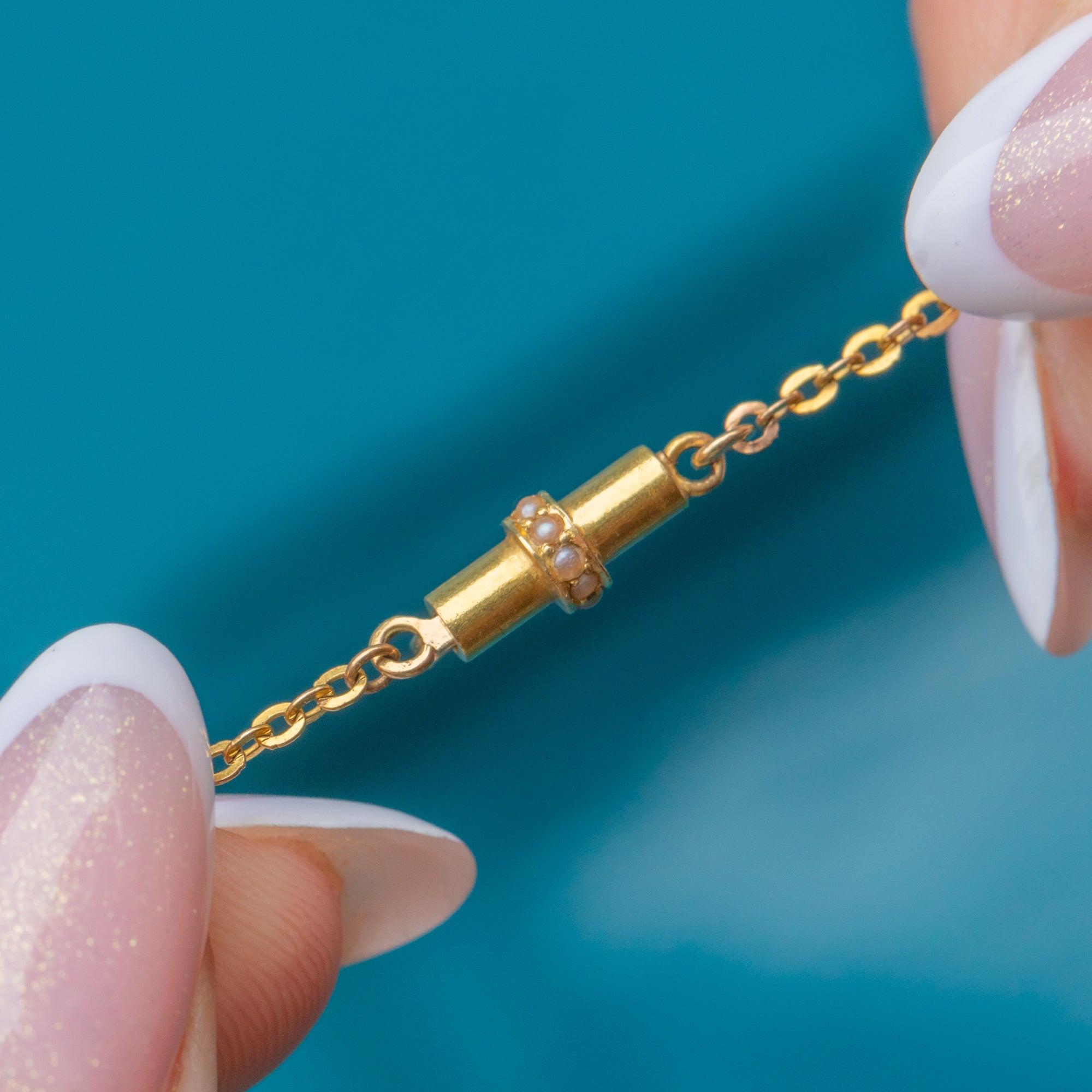 This Victorian necklace is complete with an array of lustrous Pearls lining the chain, providing this piece with a lovely majestic iridescence. A brilliant piece for collectors and gemstone lovers alike, this antique 18ct Gold necklace will make a splendid addition to your collection!
