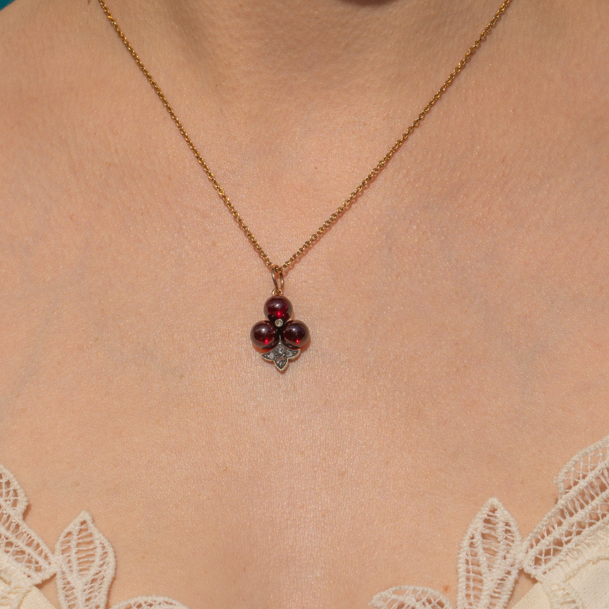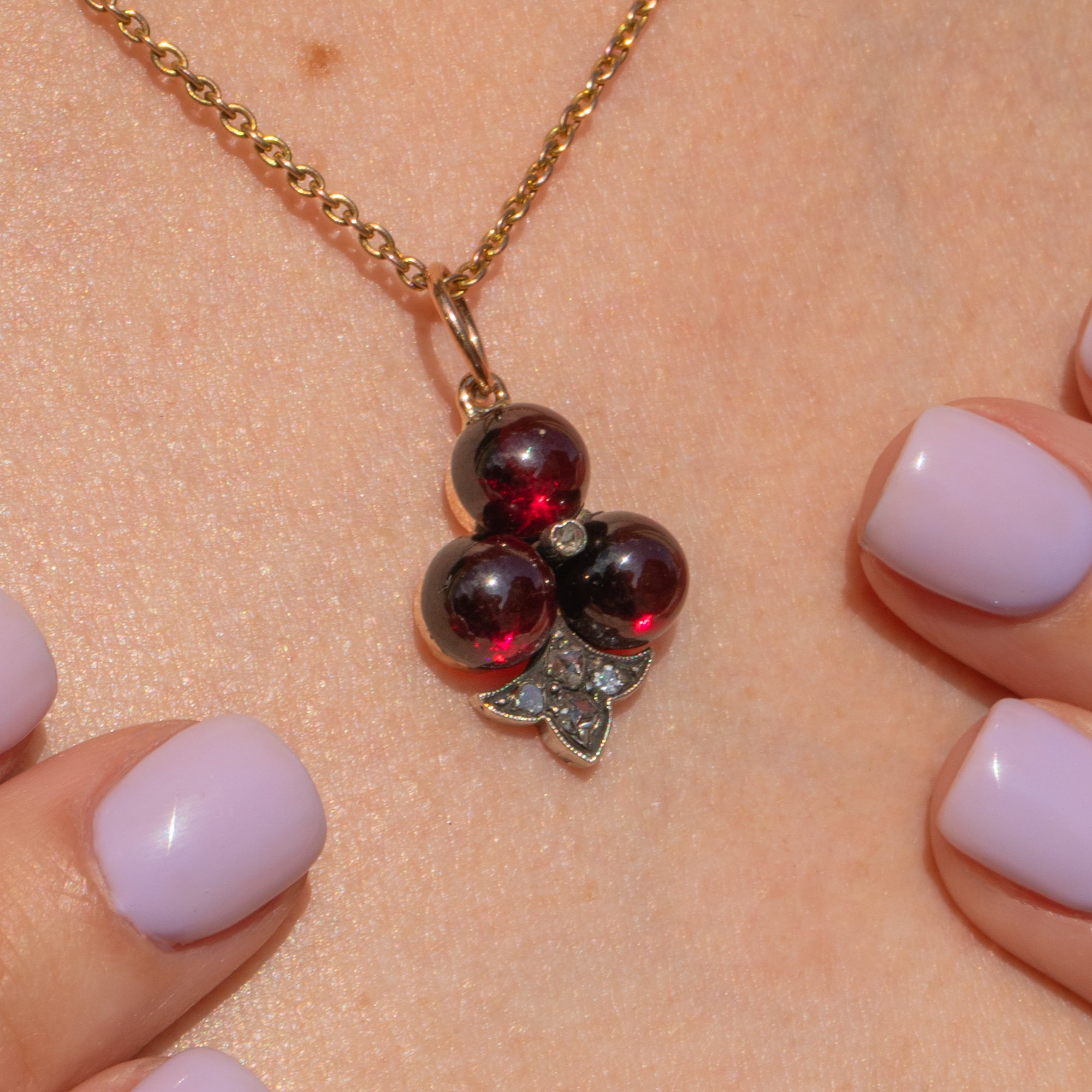 Suspended below her trefoil Garnet design are four rose-cut Garnets adding a sprinkling of charismatic sparkle to this indulgent Victorian pendant. Trefoil is a design often seen within gothic architecture, which in tern heavily inspired jewellery over the years, just like this Garnet Diamond trefoil pendant!