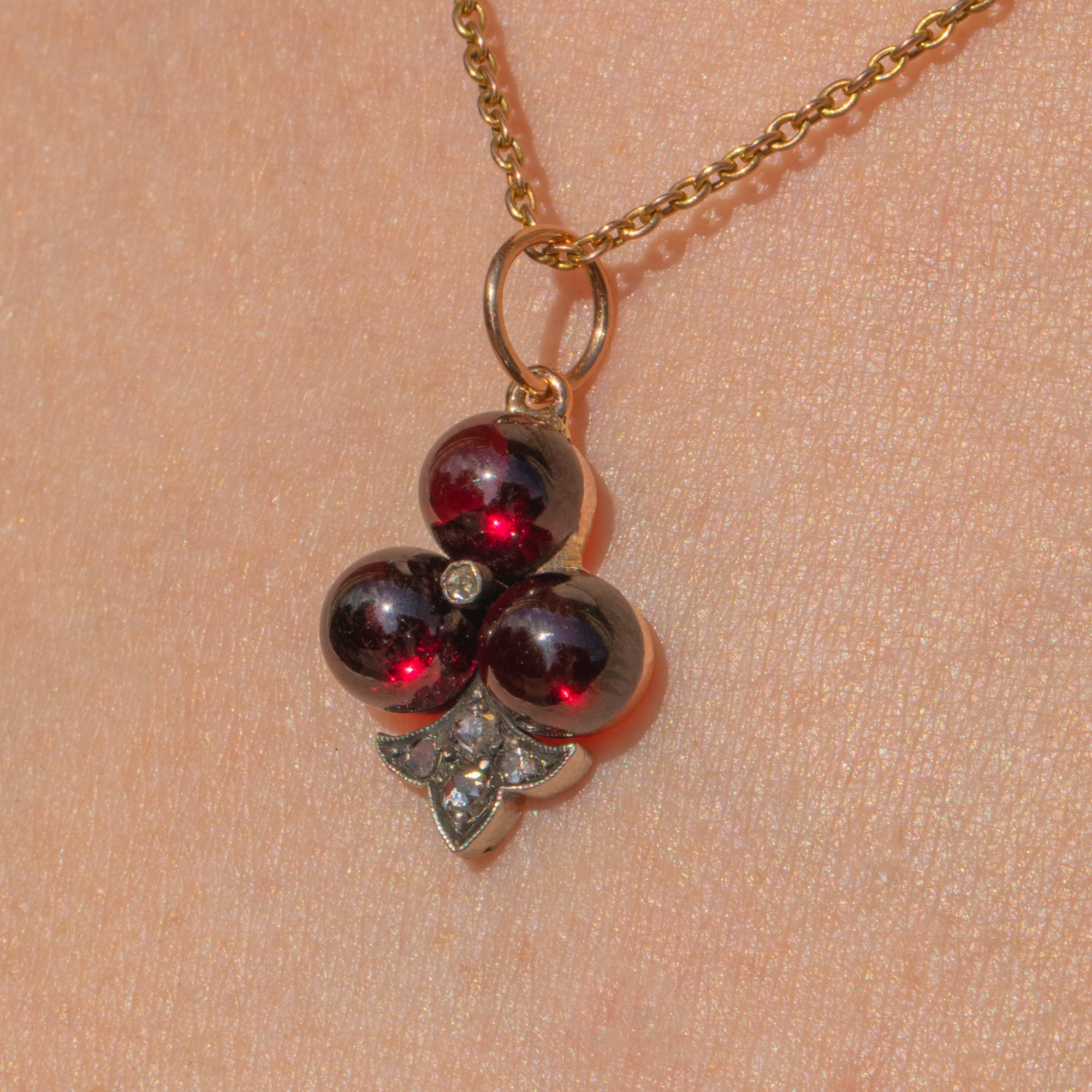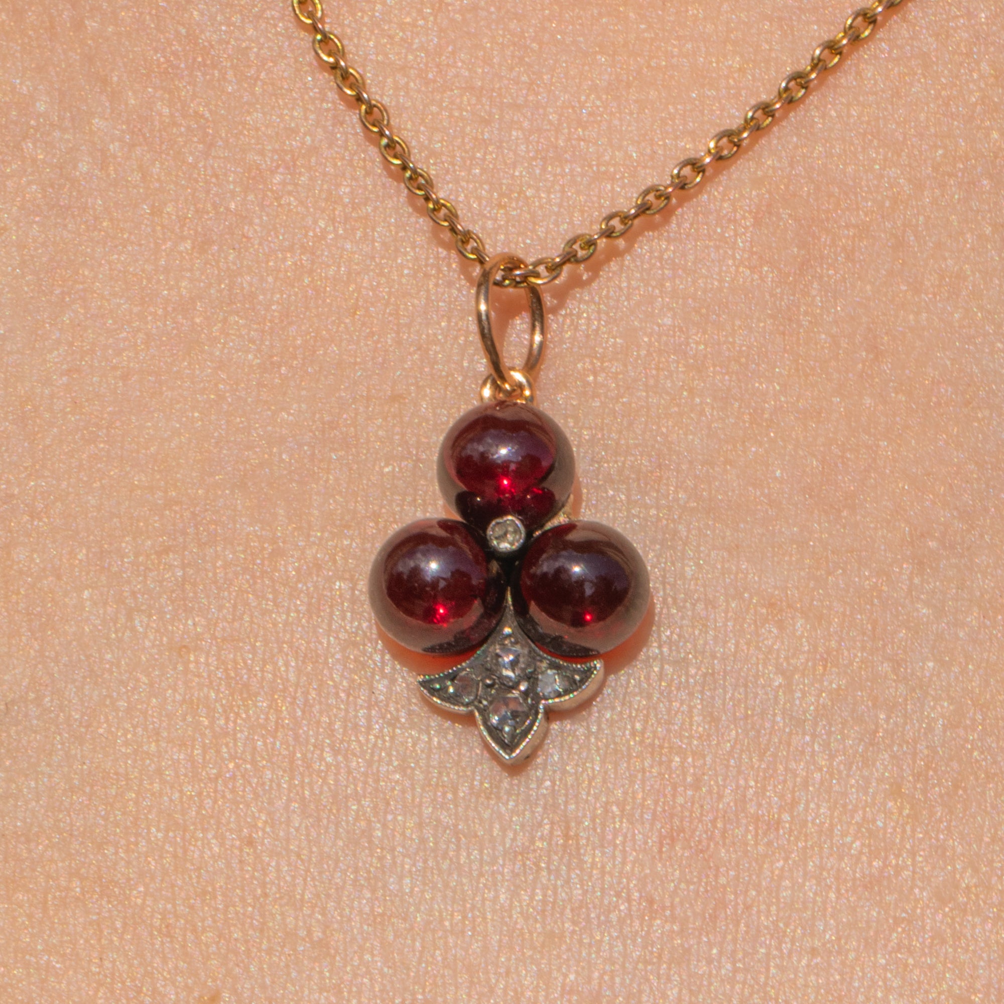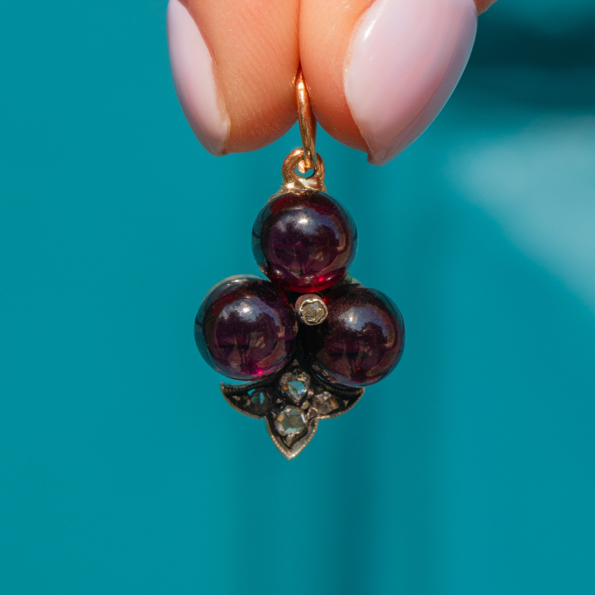 Inject some gothic glamour into your repertoire with this Victorian 18ct Gold Garnet Diamond trefoil pendant! Three plump Garnets with a combined carat weight of 6.00ct, are akin to a bunch of the juiciest grapes exuding rich jammy hues that look good enough to eat.