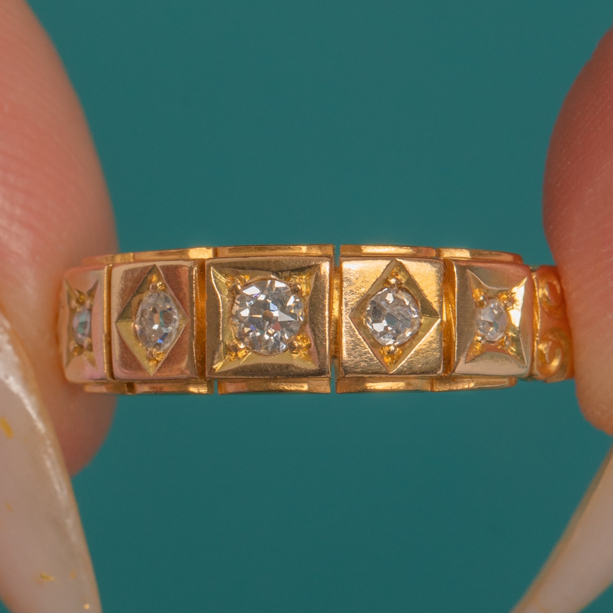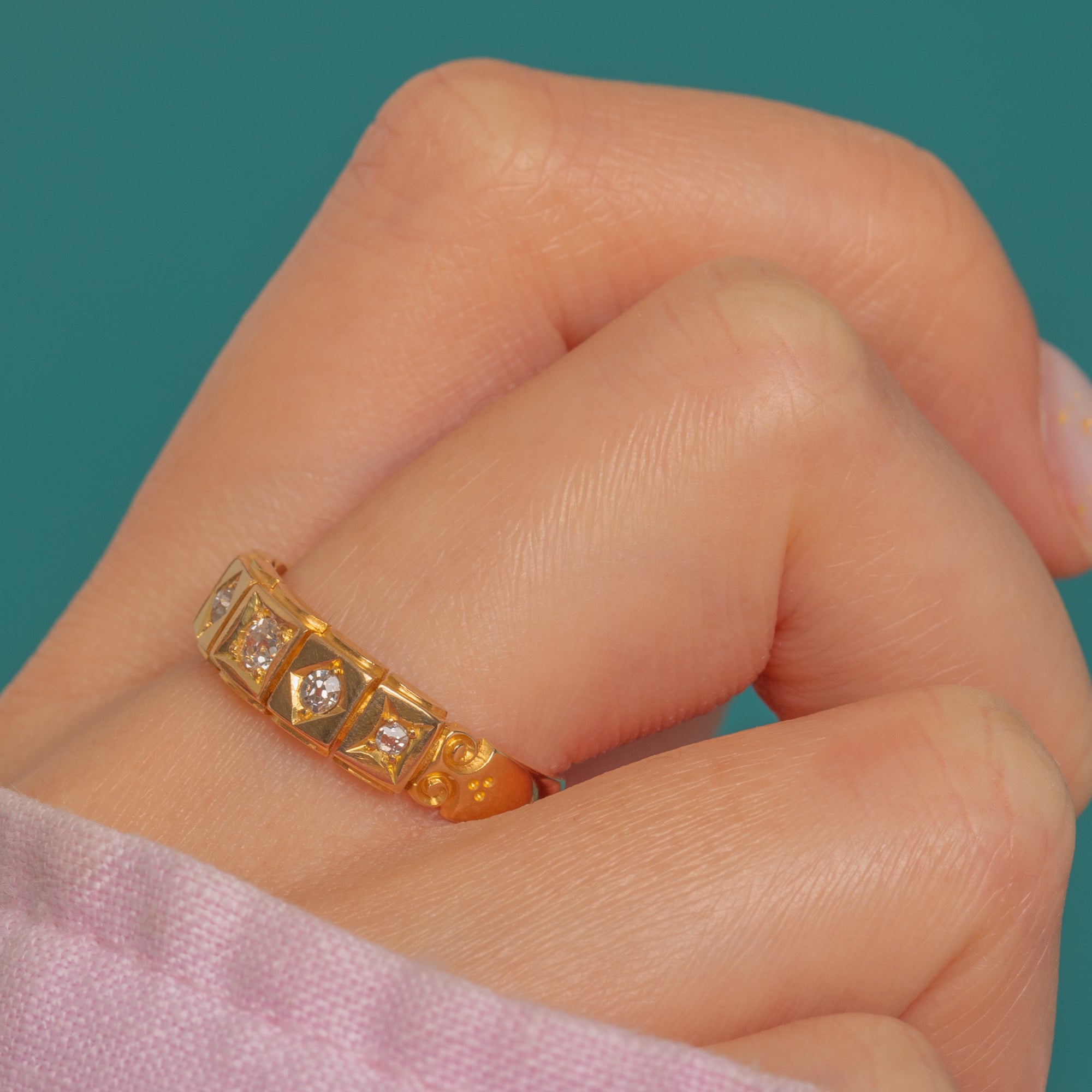 A timeless Victorian five-stone gypsy ring in rich 18ct Gold, set with a graduated line of Old Mine Cut Diamonds. The low-profile head is composed of geometric plaques engraved with classic starburst details, each Diamond flush-set for a clean, confident silhouette. The central stone is subtly larger, creating gentle graduation across the finger.