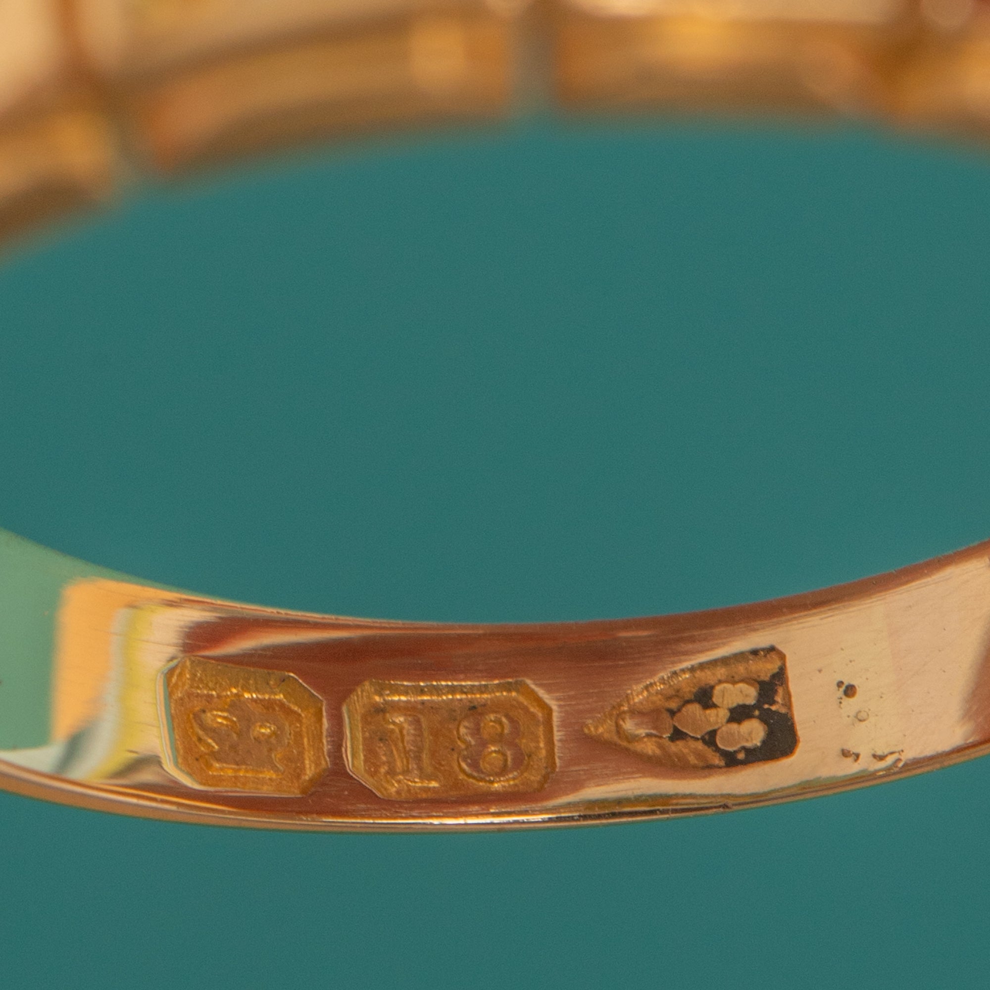 Finished with petite scrolled shoulders and circular open backs to the stones, this elegant half-hoop glides on the hand and stacks beautifully. English hallmarks confirm quality, with the reassuring glow and character that collectors love from late 19th-century craftsmanship.