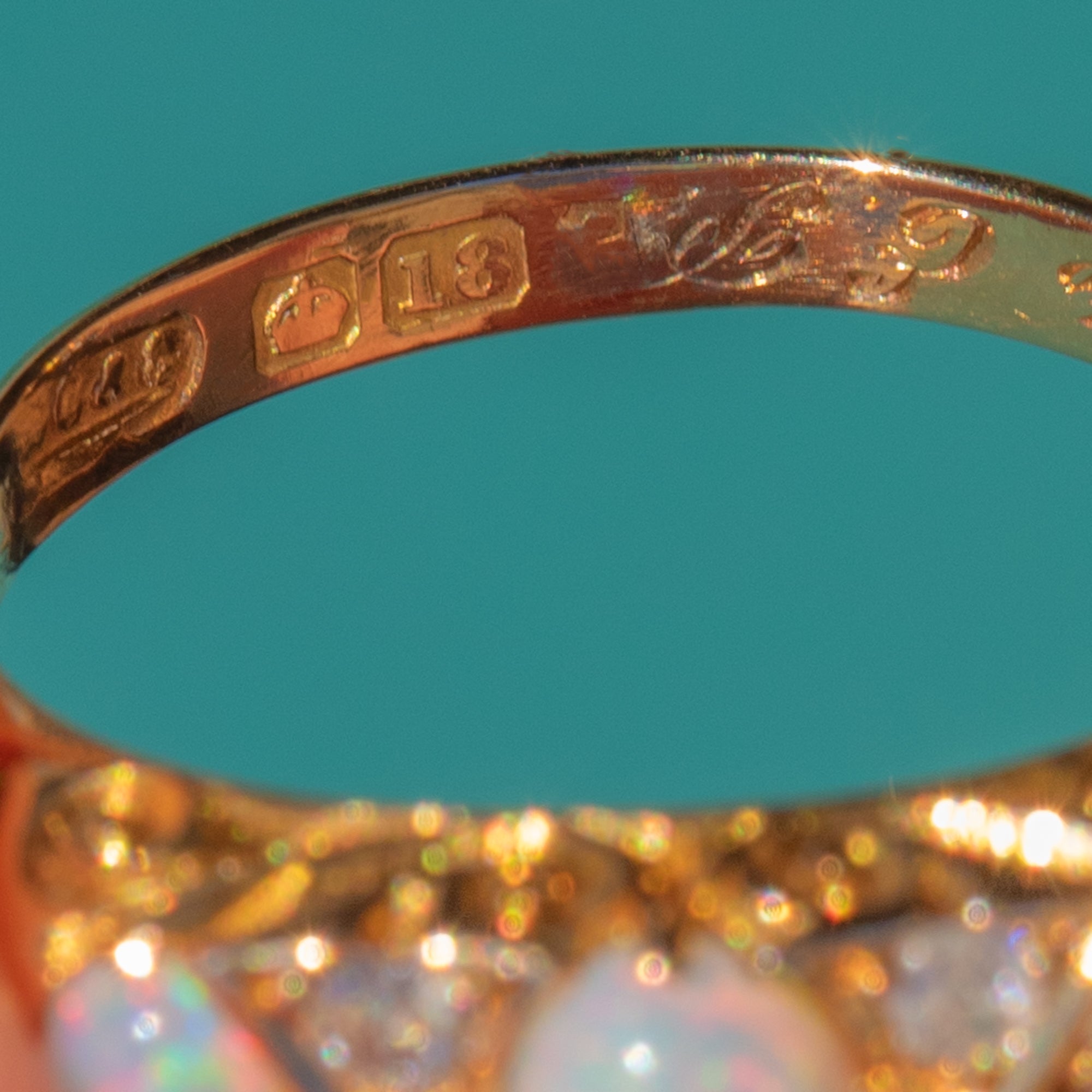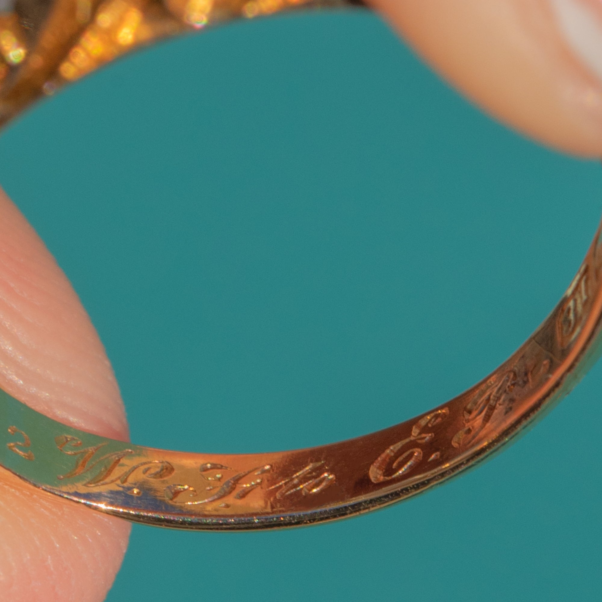 The gallery and shoulders are beautifully carved with scrolling detail, flowing into a smooth Gold band that tapers elegantly at the back. Inside the shank you’ll find an engraved “LM” monogram, adding an extra layer of sentiment and history to this special piece.
