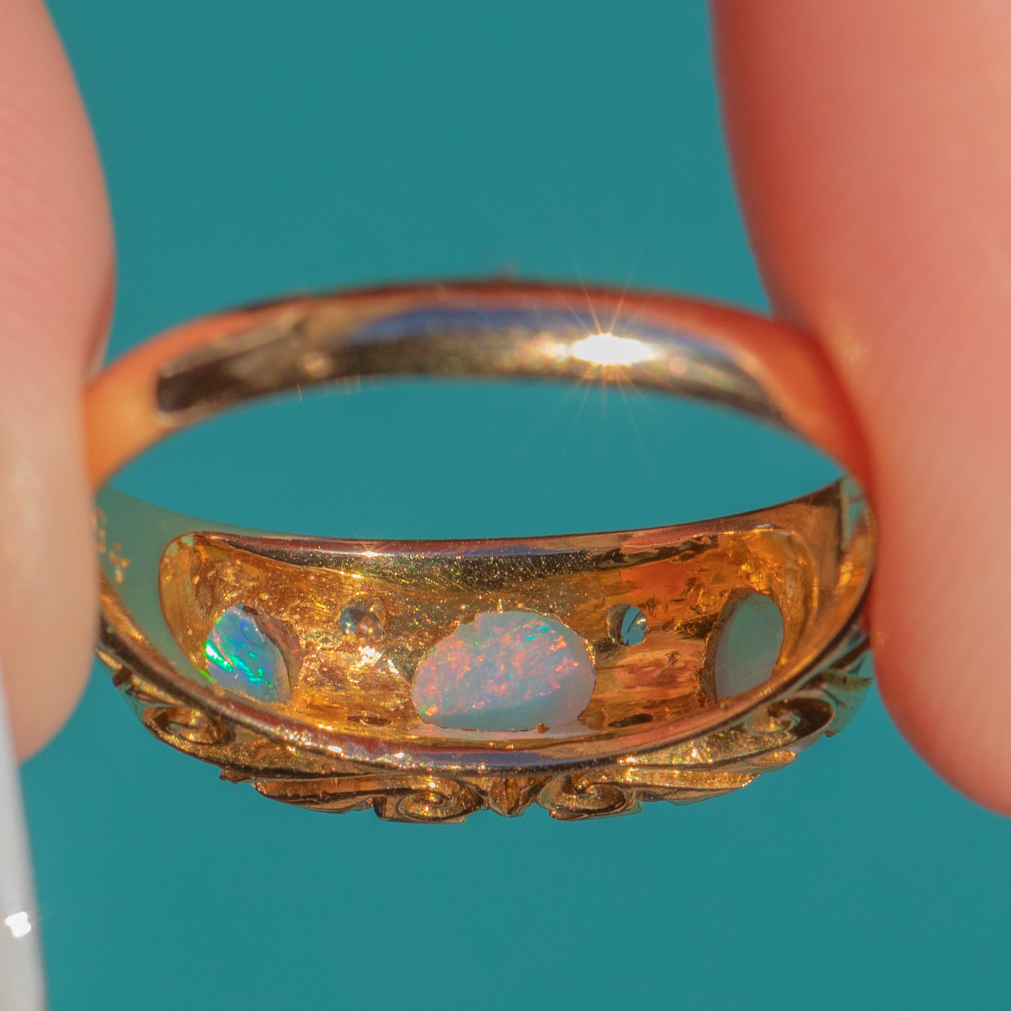 VERY GOOD: The Opals and Diamonds are bright and well-matched with no chips visible under close inspection. The carved Gold gallery and band show light wear in keeping with age but retain crisp detail. No evident resize marks; engraving and hallmarks remain legible.