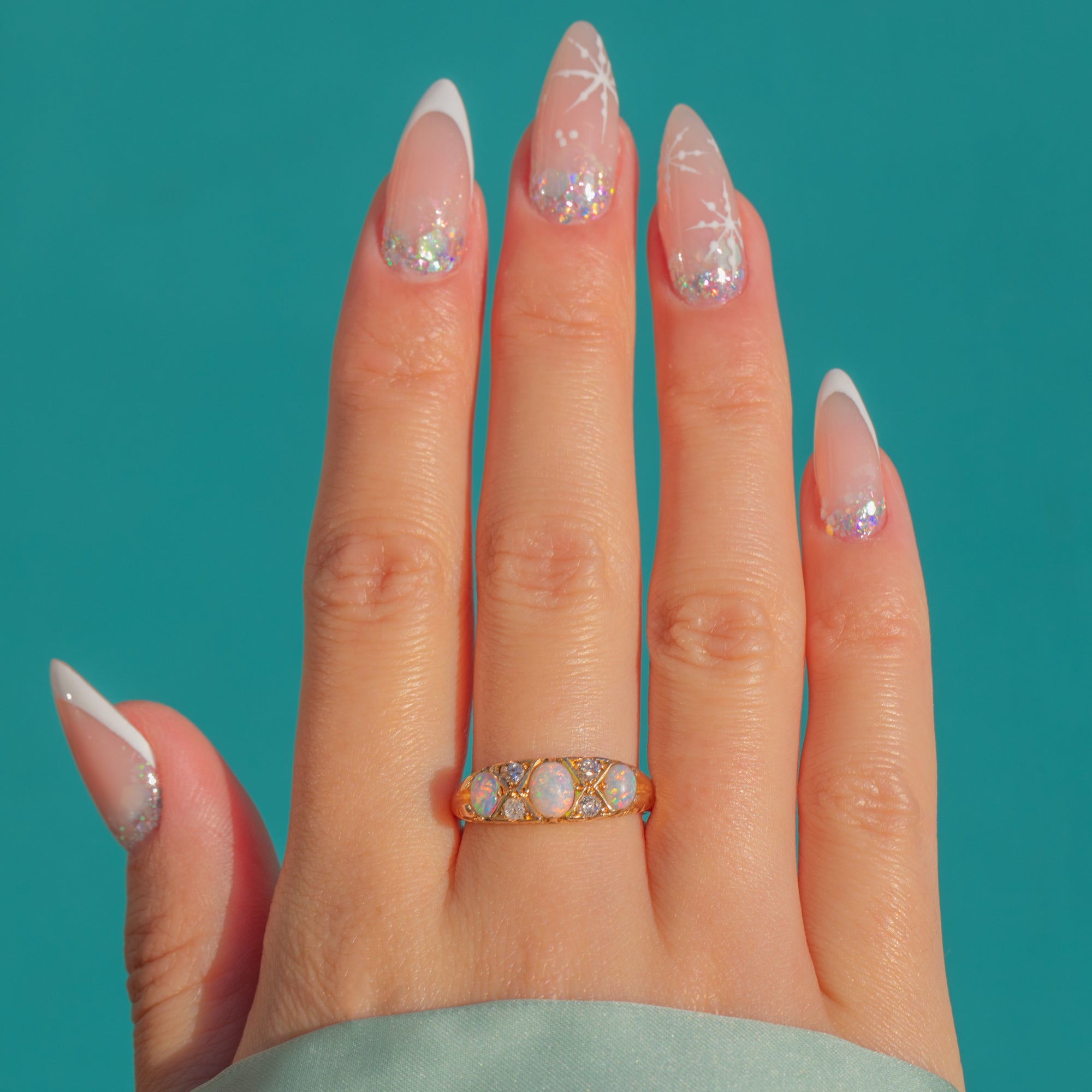 This romantic Victorian Opal and Diamond boat ring glows with pastel flashes of pink, green and orange. Three dreamy Opal cabochons are framed by twinkling Diamond spacers in an X-shaped setting, giving this antique band a luxurious, jewel-rich presence on the hand.