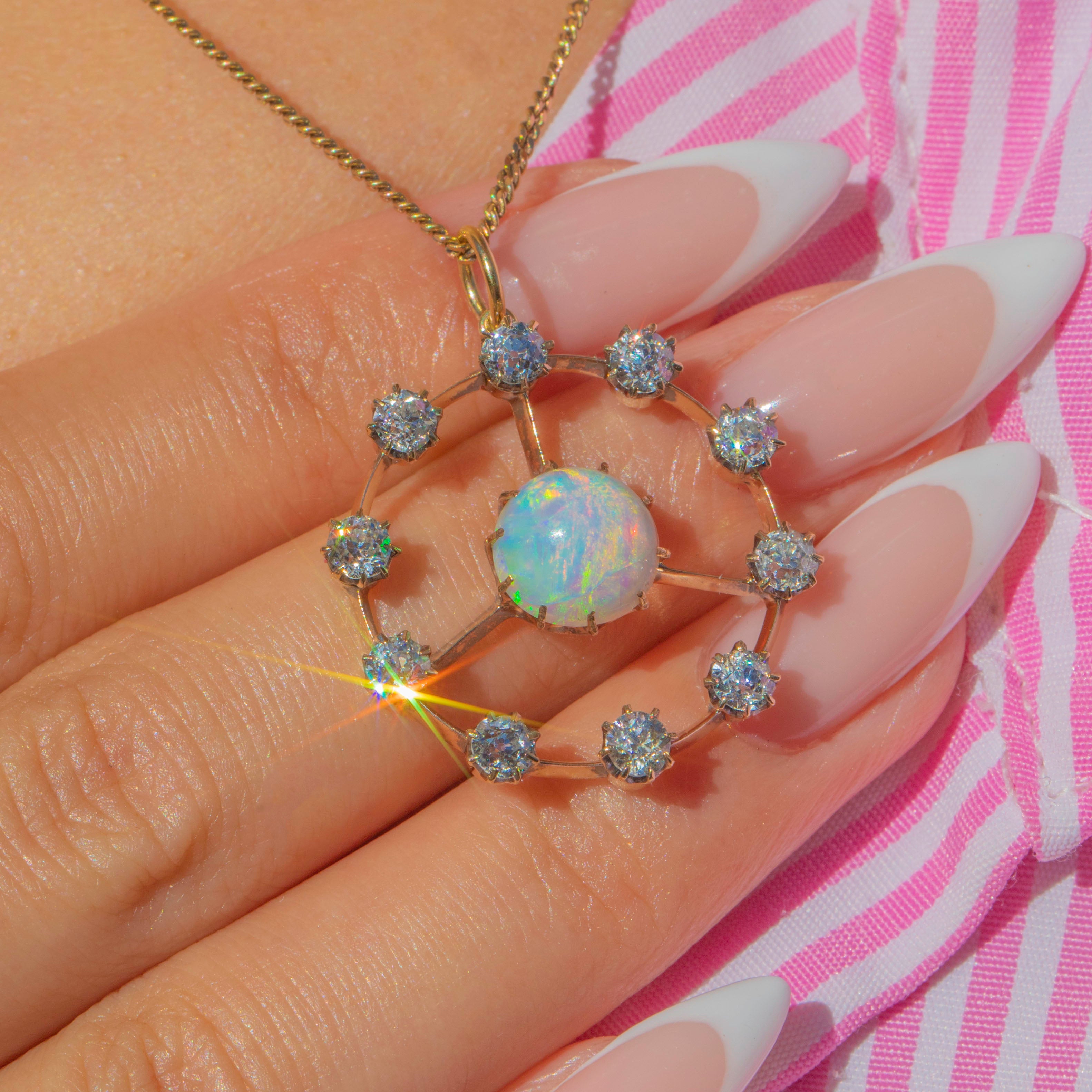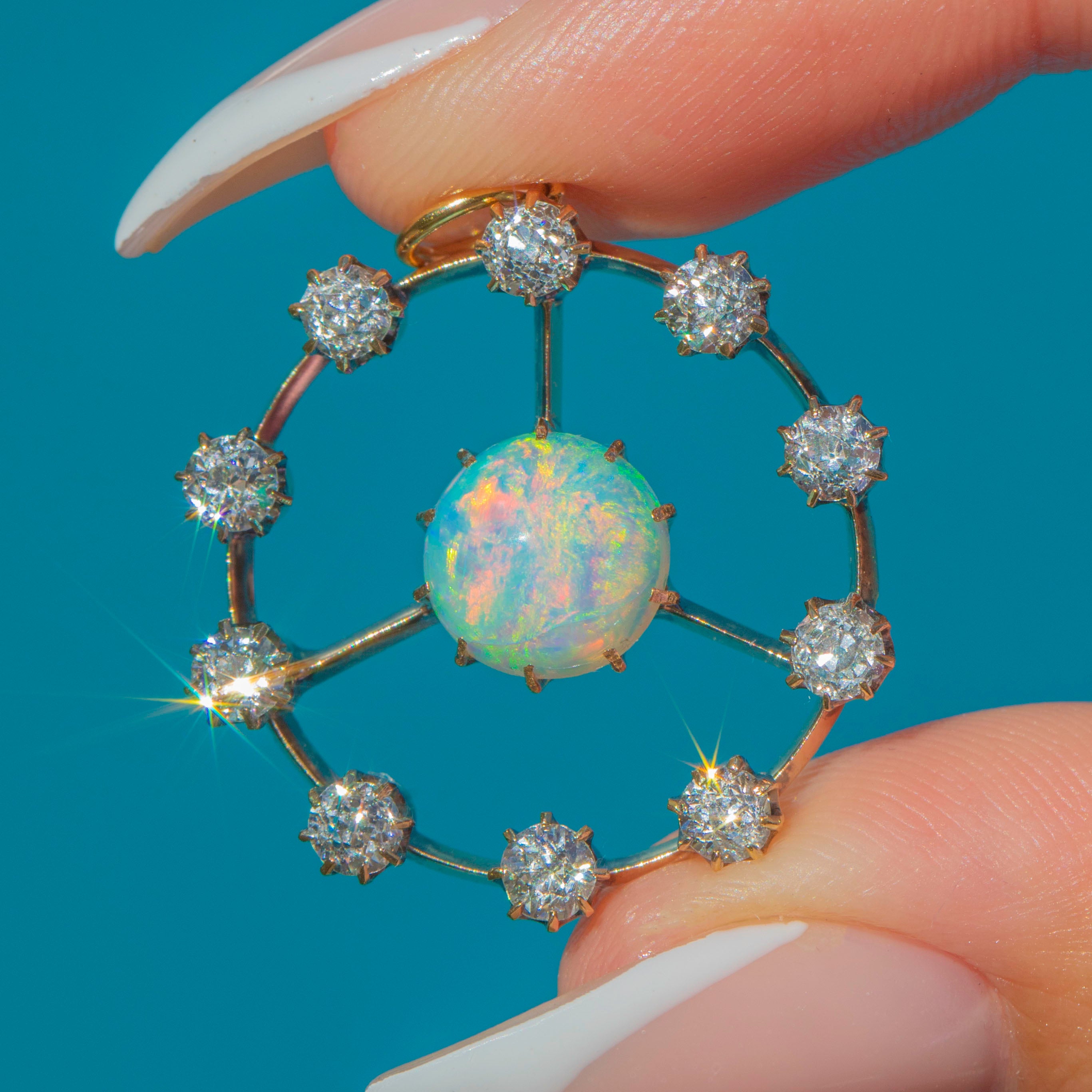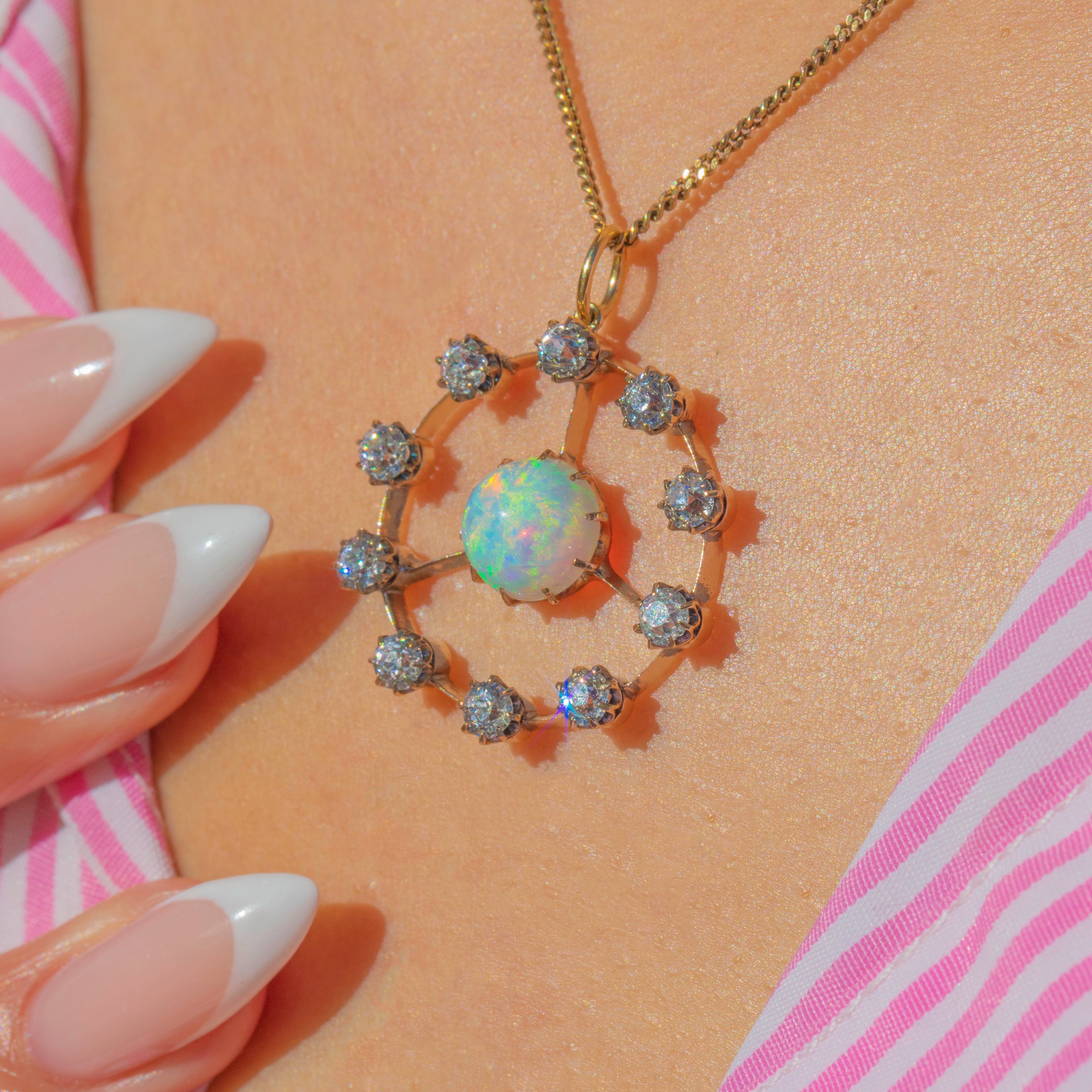 EXCELLENT: This pendant is in excellent antique condition. The Opal is free from chips and scratches, with vibrant colour play intact. The Diamonds are securely set, and the Gold setting remains in superb order with minimal signs of wear.