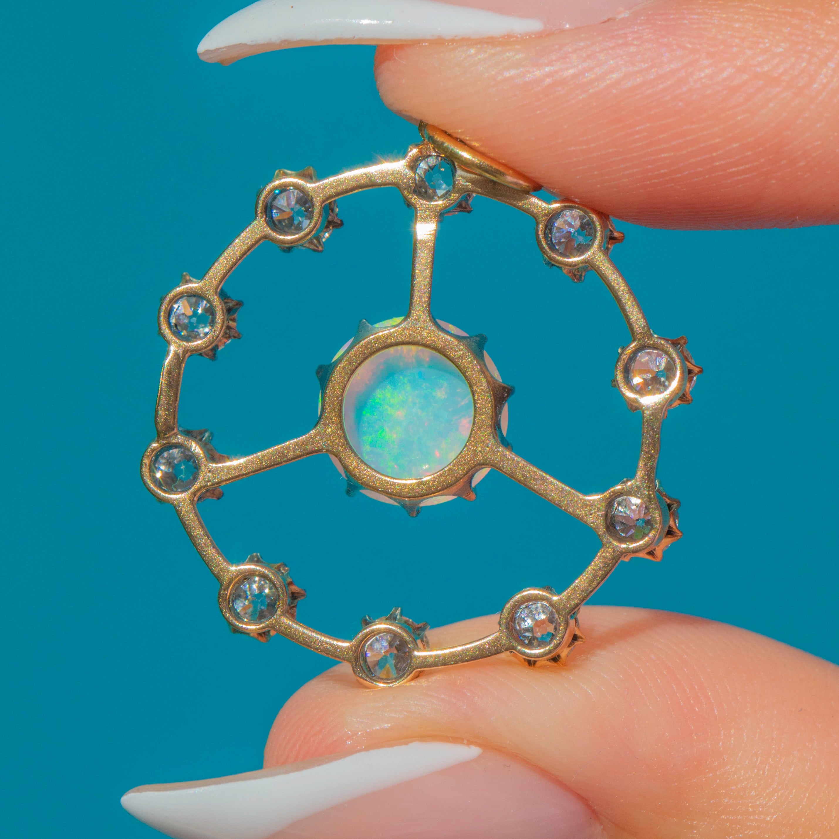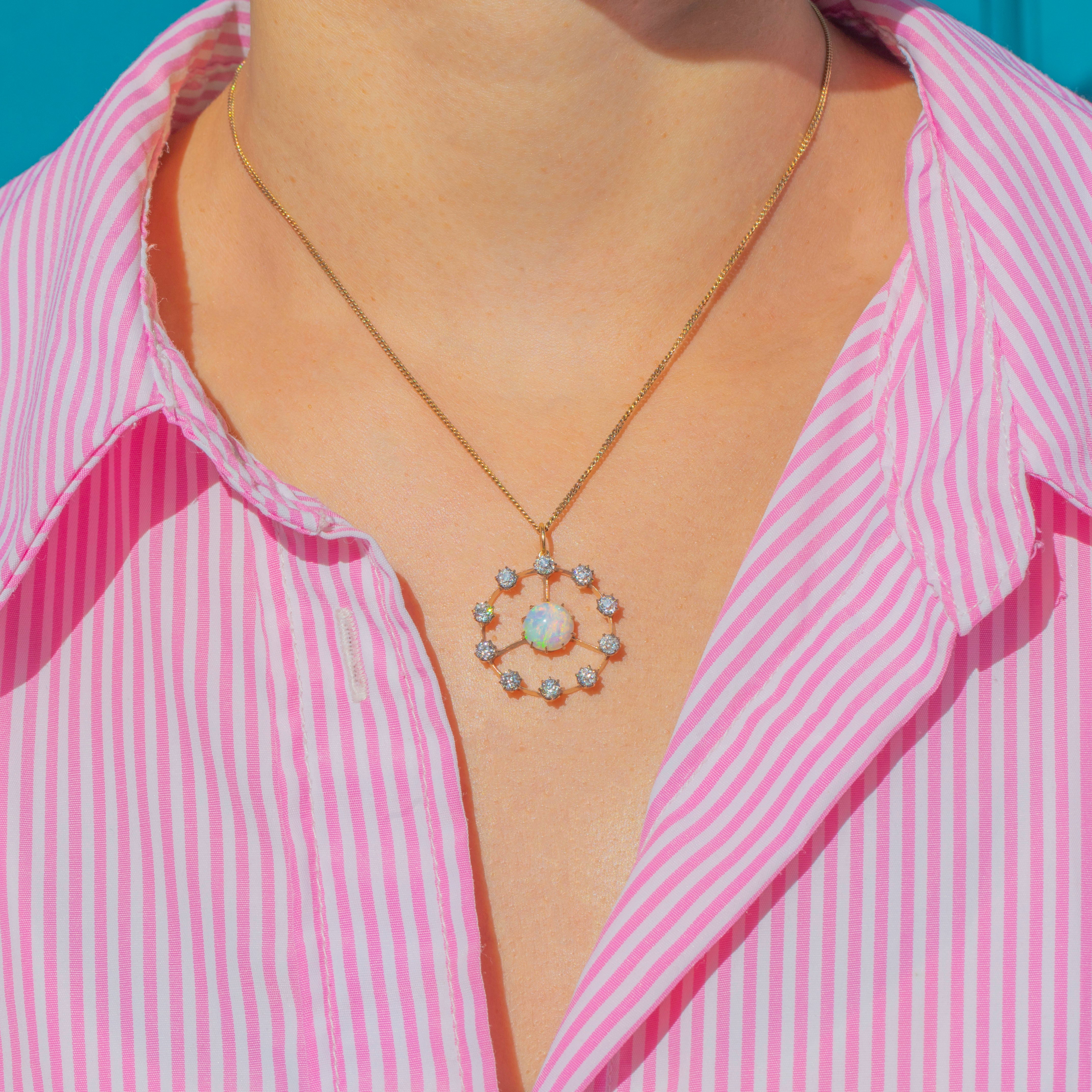 A spectacular Victorian “constellation” pendant, crafted in glowing 18ct Gold and set with a mesmerising Opal surrounded by sparkling old cut Diamonds. The central Opal, displaying a magical play of colour that dances with every movement. Encircling it are ten old cut Diamonds, arranged in a radiant starburst design.