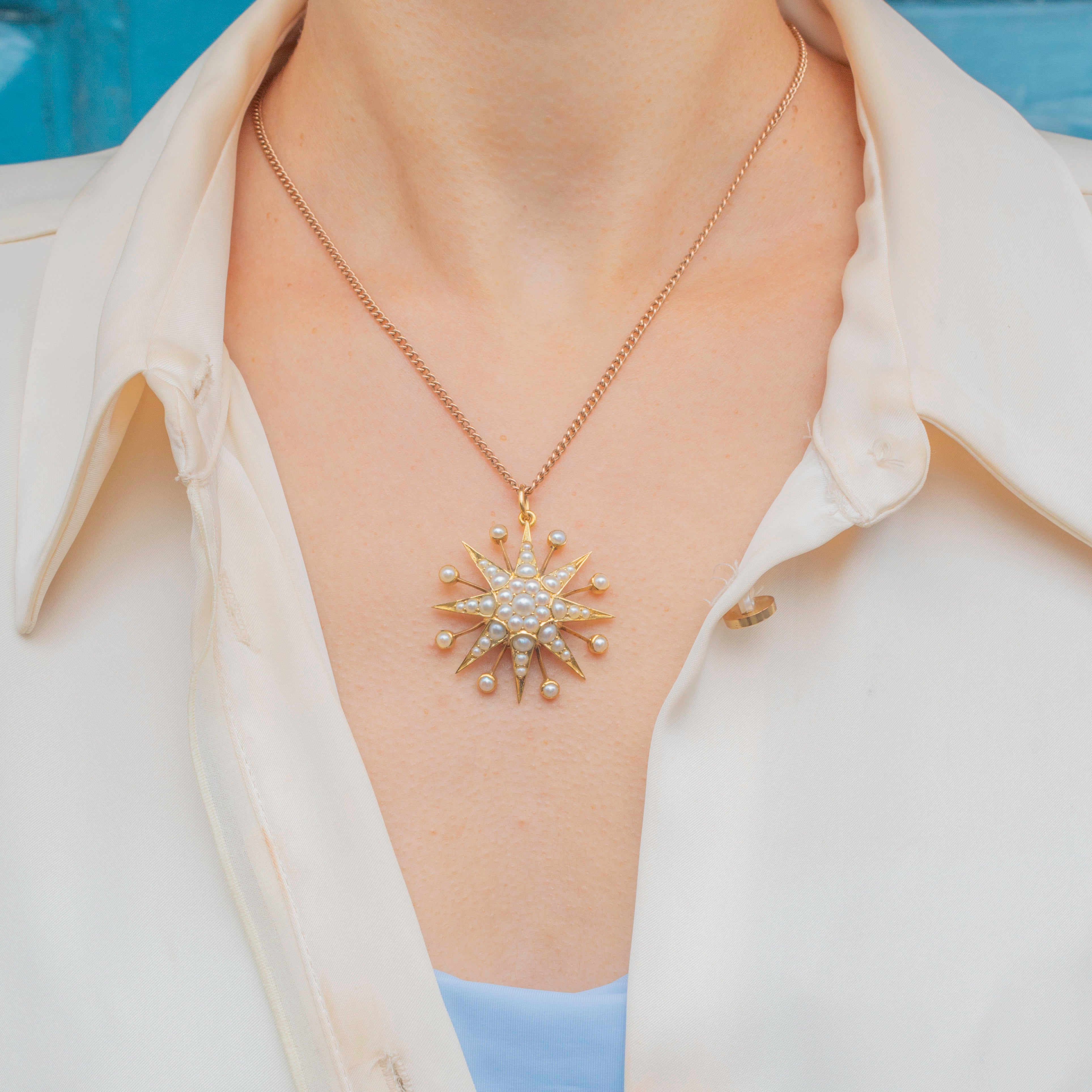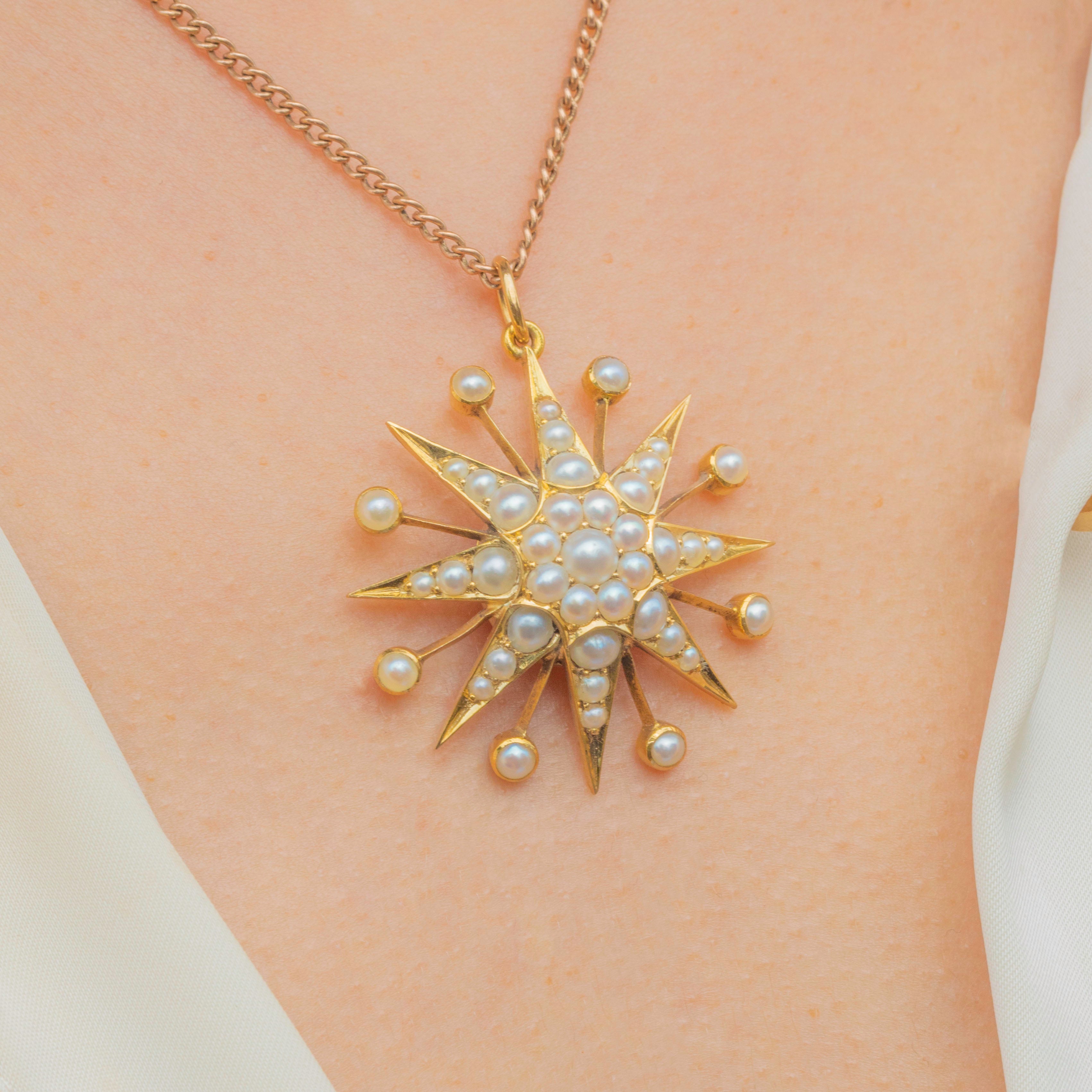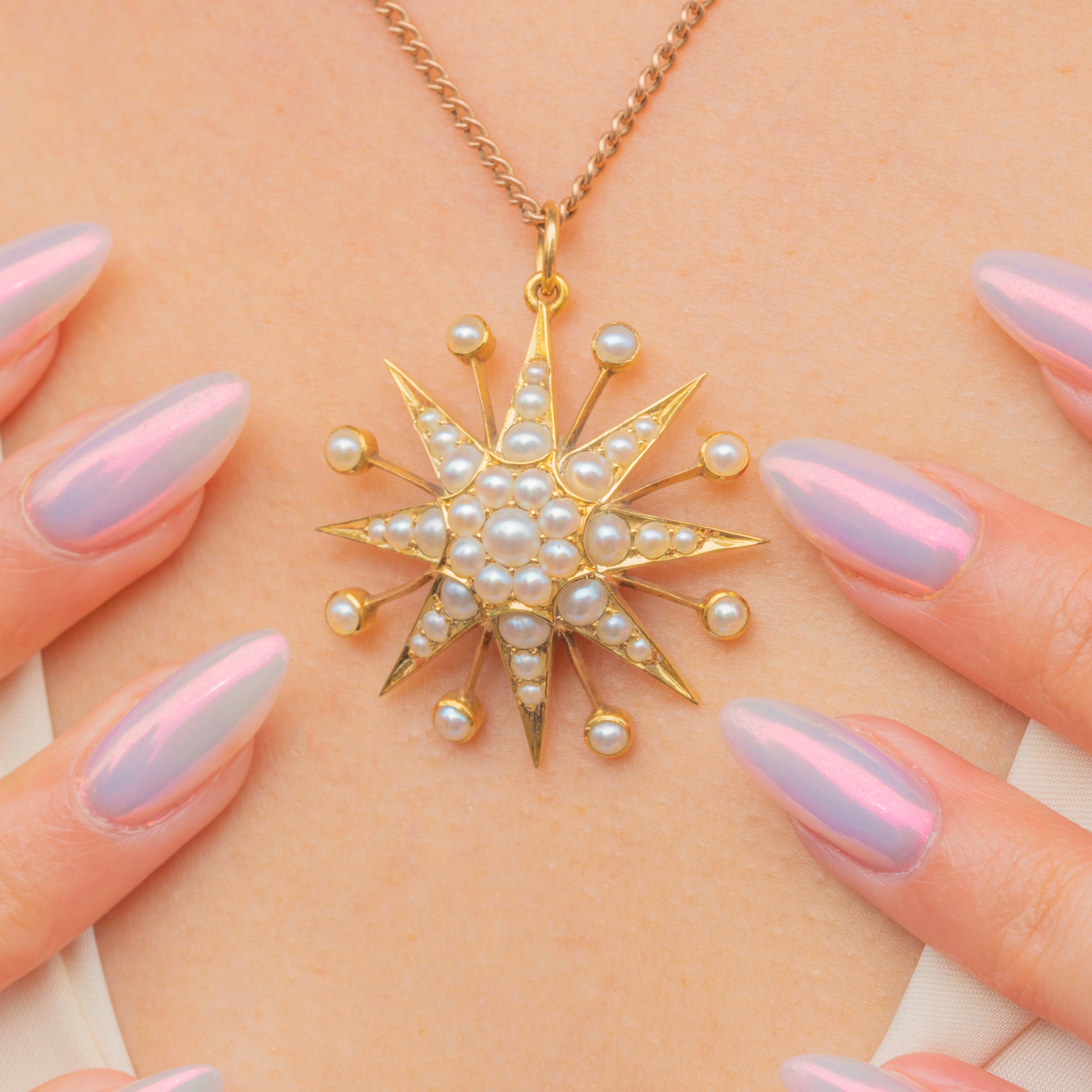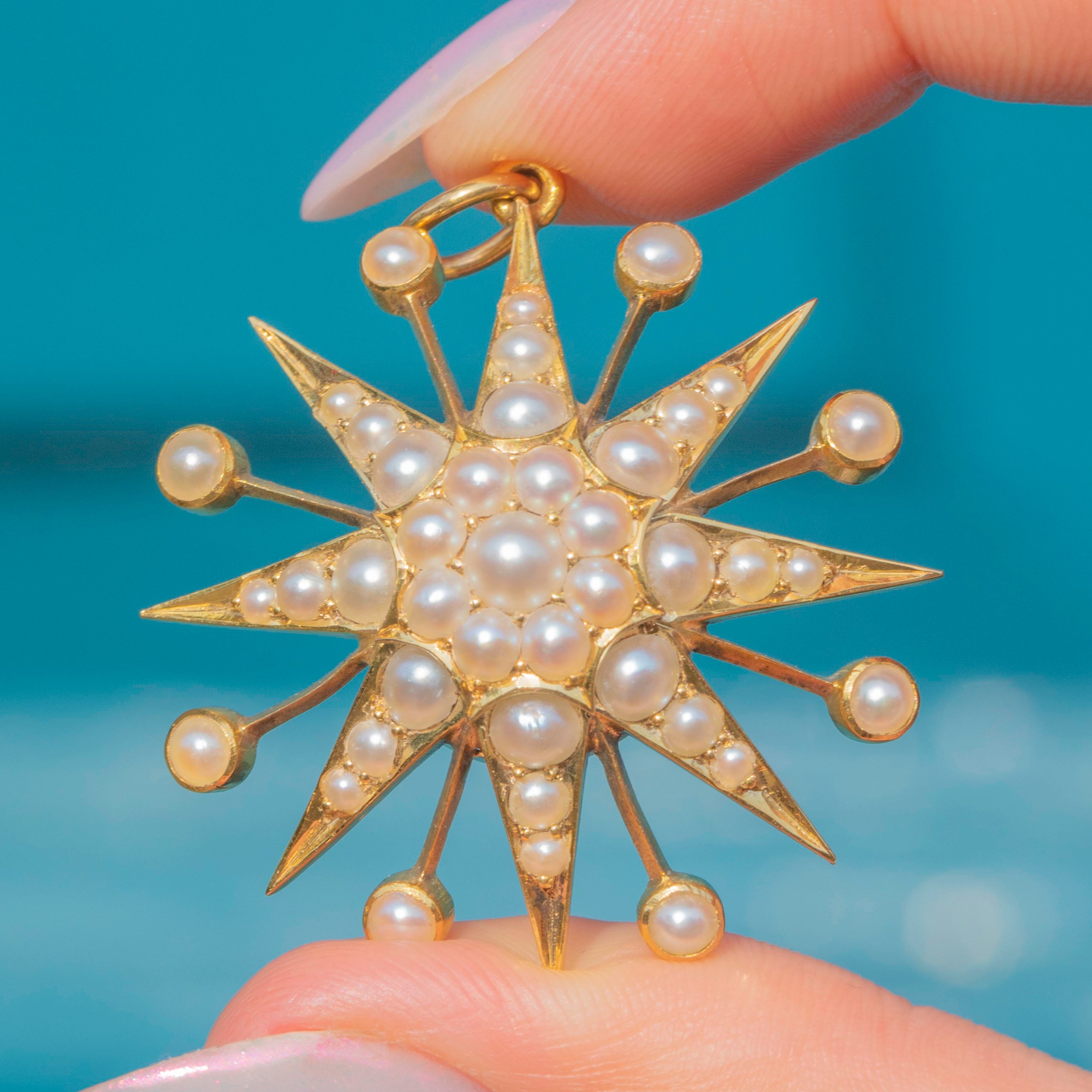 This Victorian 18ct Gold Pearl starburst pendant is a glorious antique jewel. Composed of glossy, highly saturated 18ct Gold, this Victorian starburst lives up to its name, bursting with over forty champagne-hued Pearls!