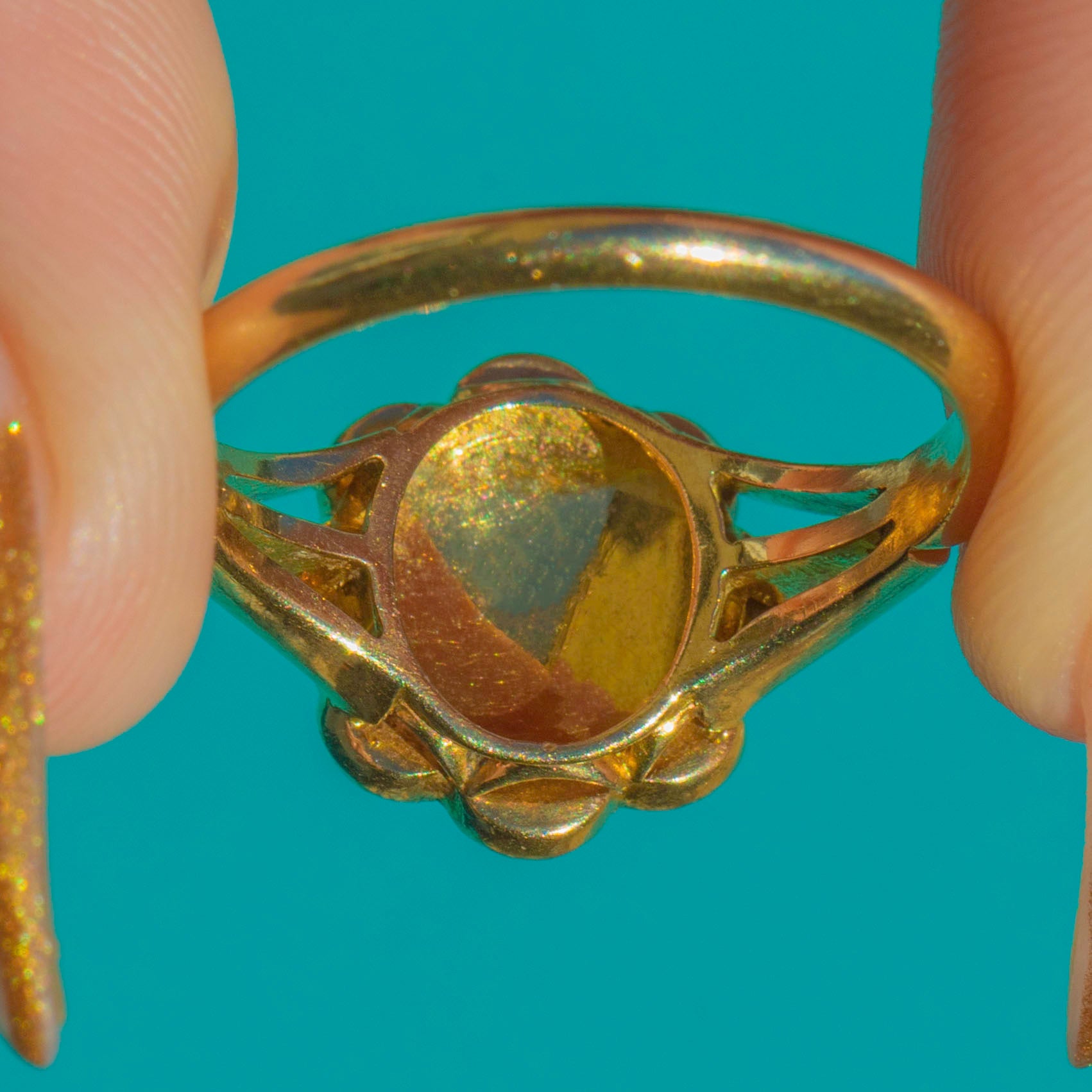 The floral head sits on elegant split shoulders that taper into a smooth Gold band, giving the ring a graceful, airy profile on the hand. It’s a beautiful example of late 19th-century sentiment, pairing Turquoise – long associated with love and protection – with luminous Pearls for a look that’s both sweet and striking.