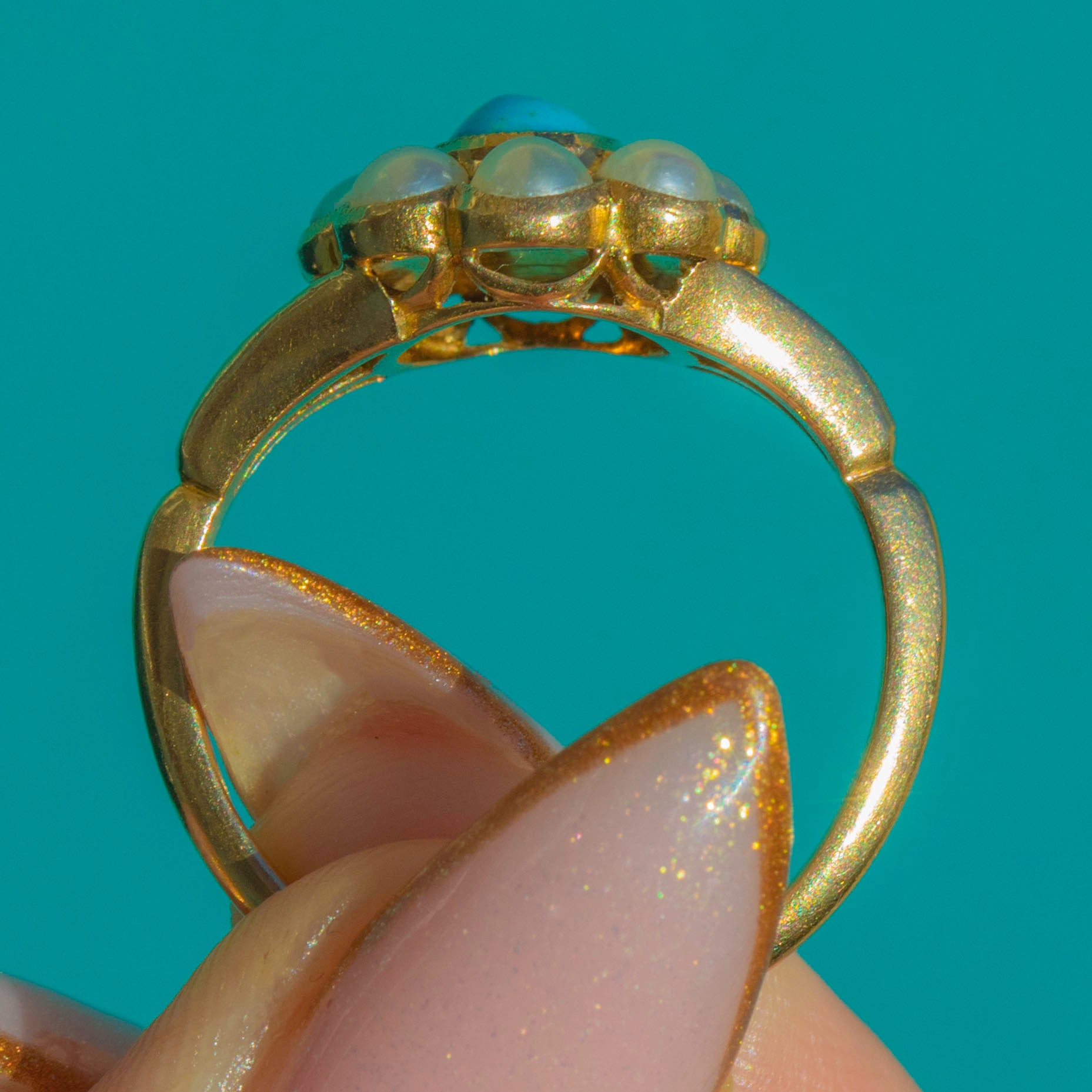 This romantic Victorian cluster ring is all about that joyful pop of colour. A bright oval Turquoise sits at the centre, its saturated blue hue glowing against rich 18ct Gold. Around it, a halo of creamy Pearls forms a charming daisy motif, framed with fine milgrain for a delicate, lacy edge.