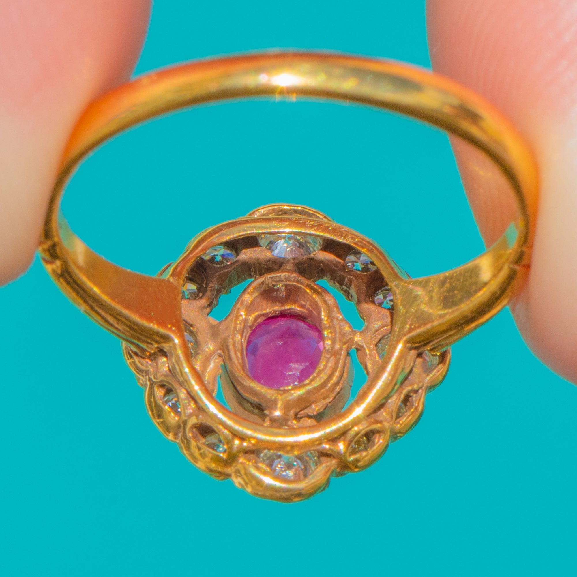 VERY GOOD-EXCELLENT: The Ruby and Diamonds are bright with no chips or noticeable abrasions, retaining lovely sparkle. The 18ct Gold setting, scalloped halo and openwork gallery are secure and well-preserved with light, age-appropriate surface wear and a gentle patina. The shank shows minor wear; a faint solder line near the head suggests a neat historical resize, stable and not noticeable in wear.