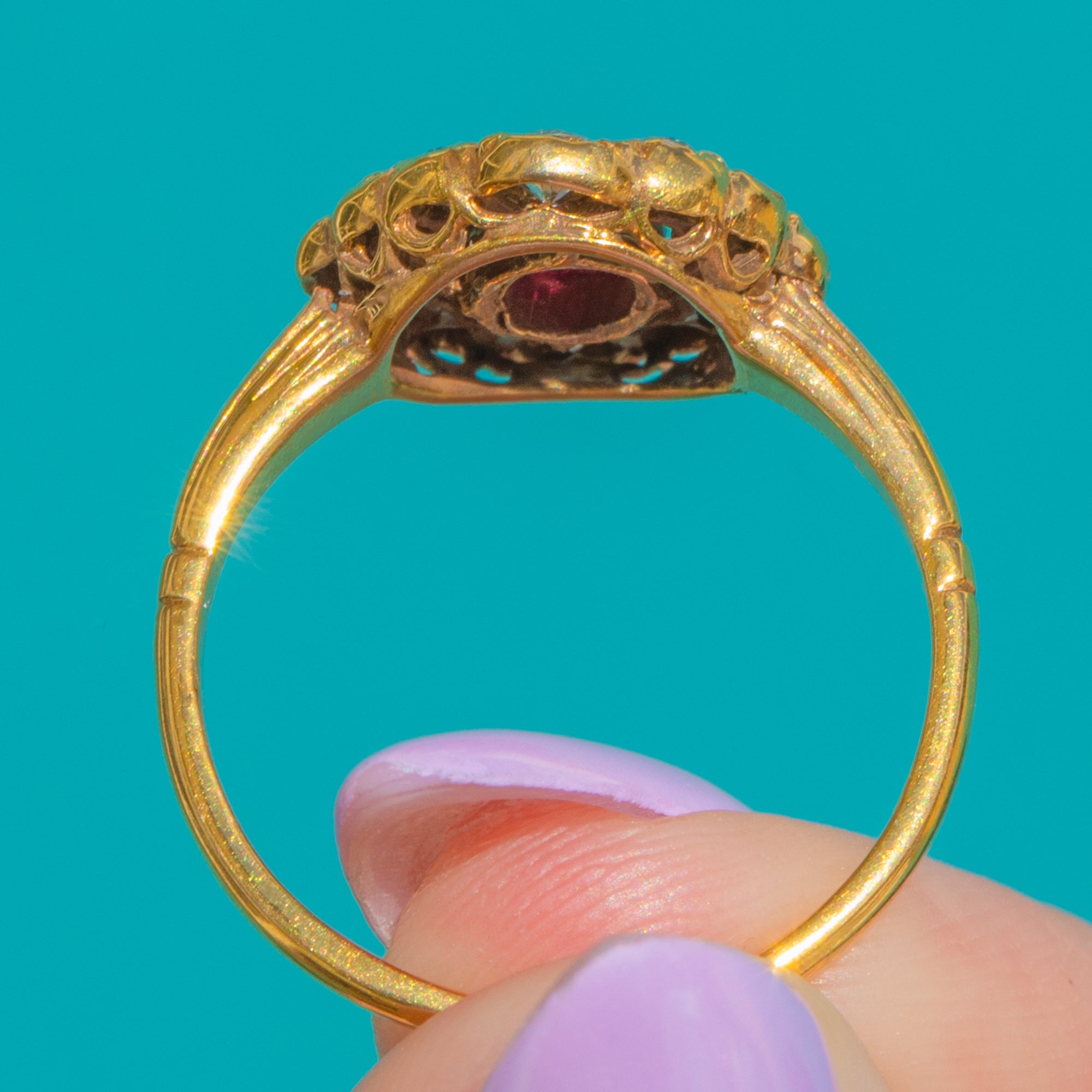 A timeless Victorian cluster ring that captures the romance of the era, crafted in rich 18ct Gold with a wonderfully detailed, hand-finished feel. At its heart sits an oval Ruby of approximately 0.55ct, its vibrant pink-red hue lifted in a raised bezel and framed by a scalloped halo.