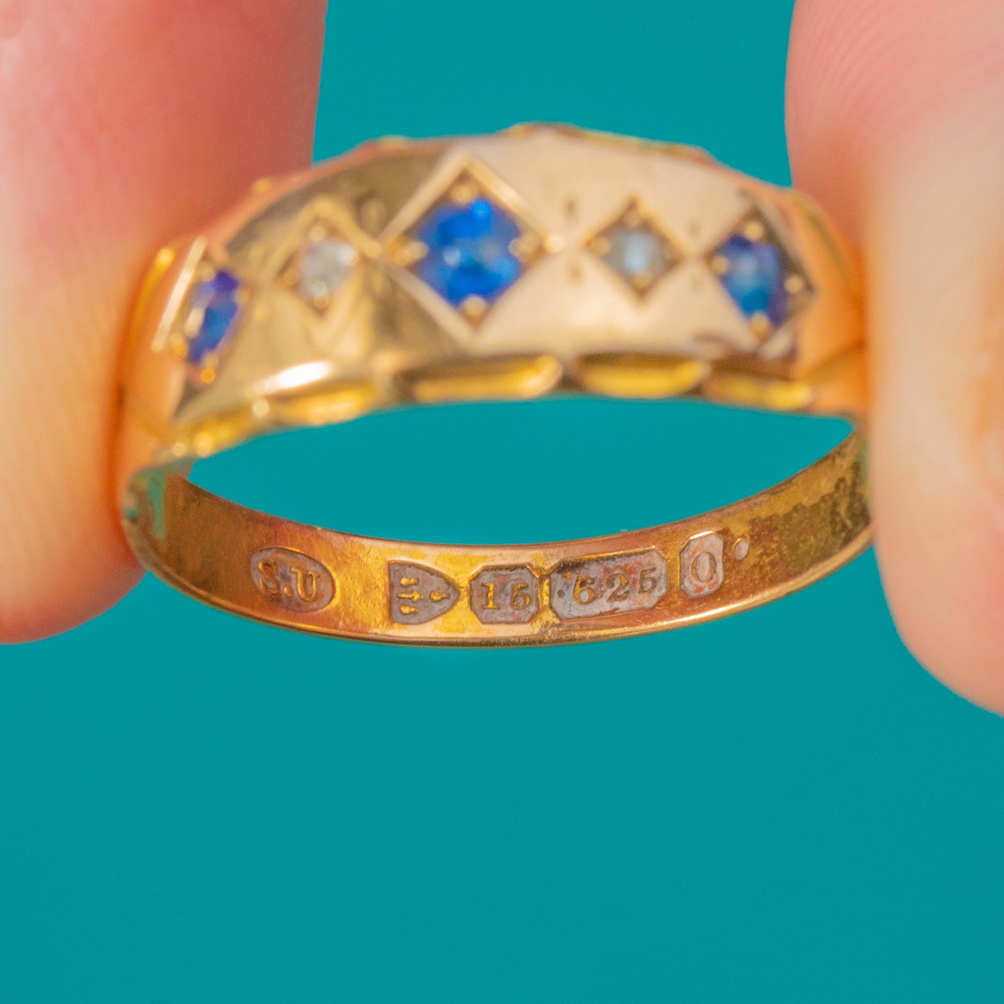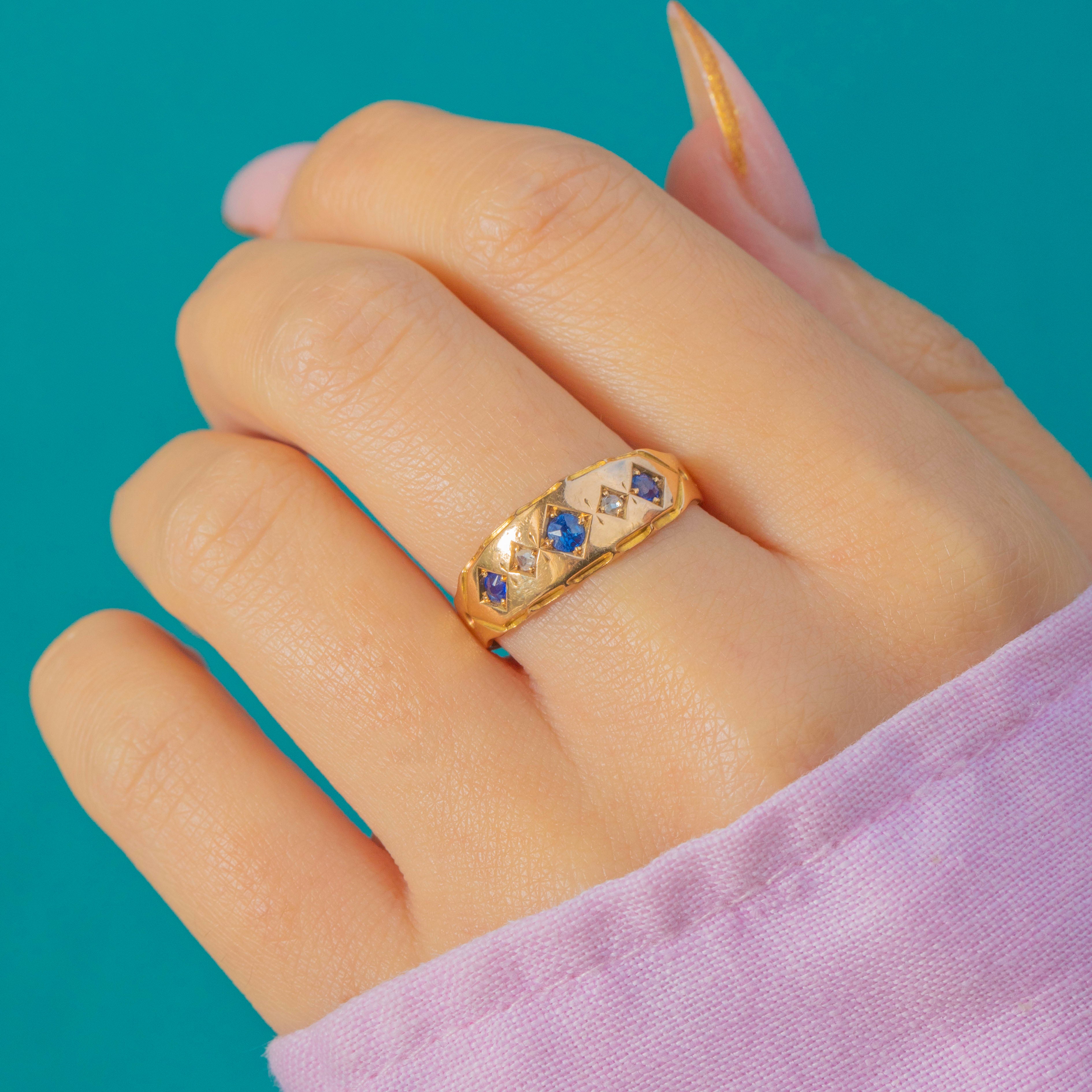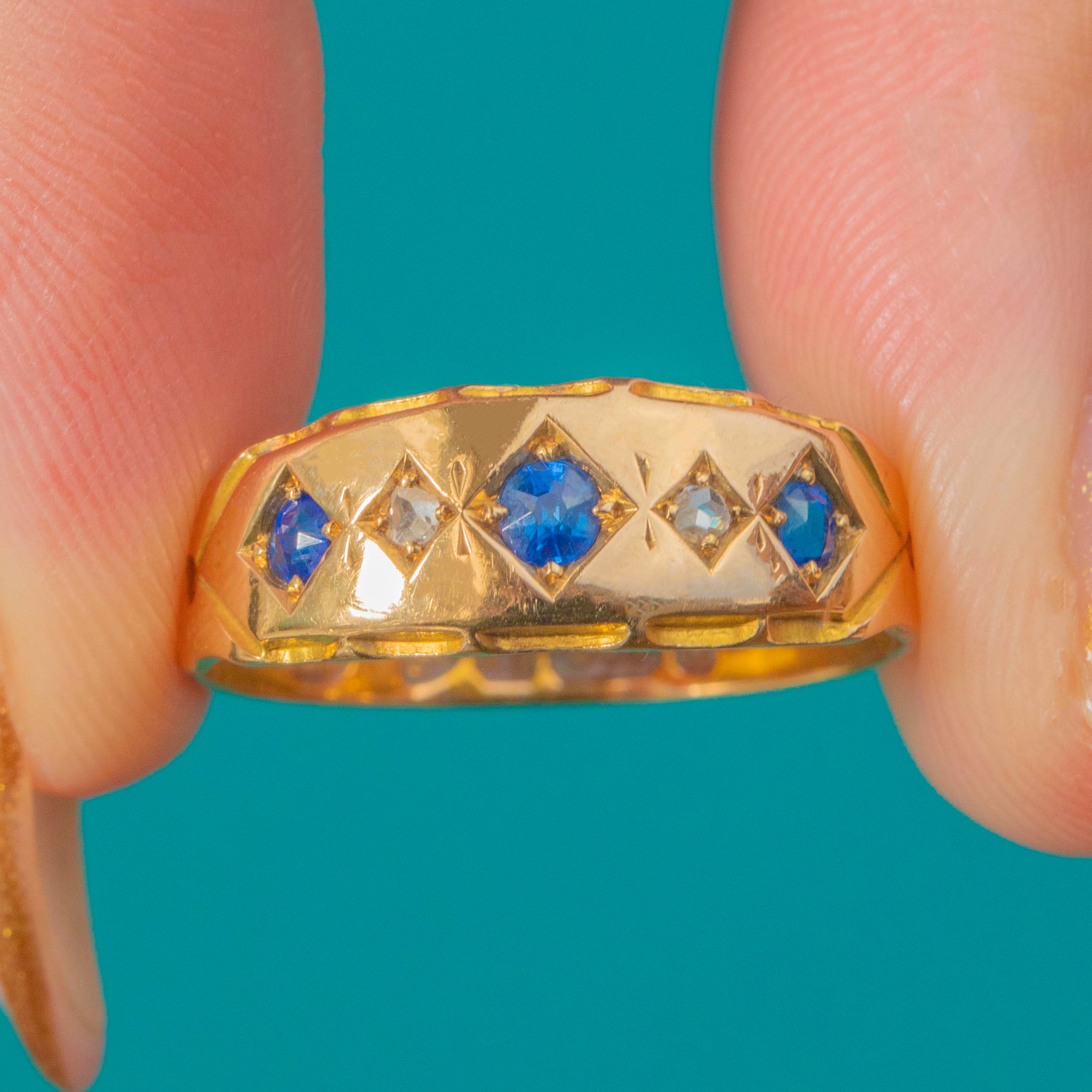 This Victorian five-stone gypsy ring, dated 1897, is a classic design set with bright blue Sapphires and sparkling Diamonds in a smooth, sculpted 18ct Gold band. The stones are flush-set within star-shaped settings, a hallmark of late-19th-century English craftsmanship.