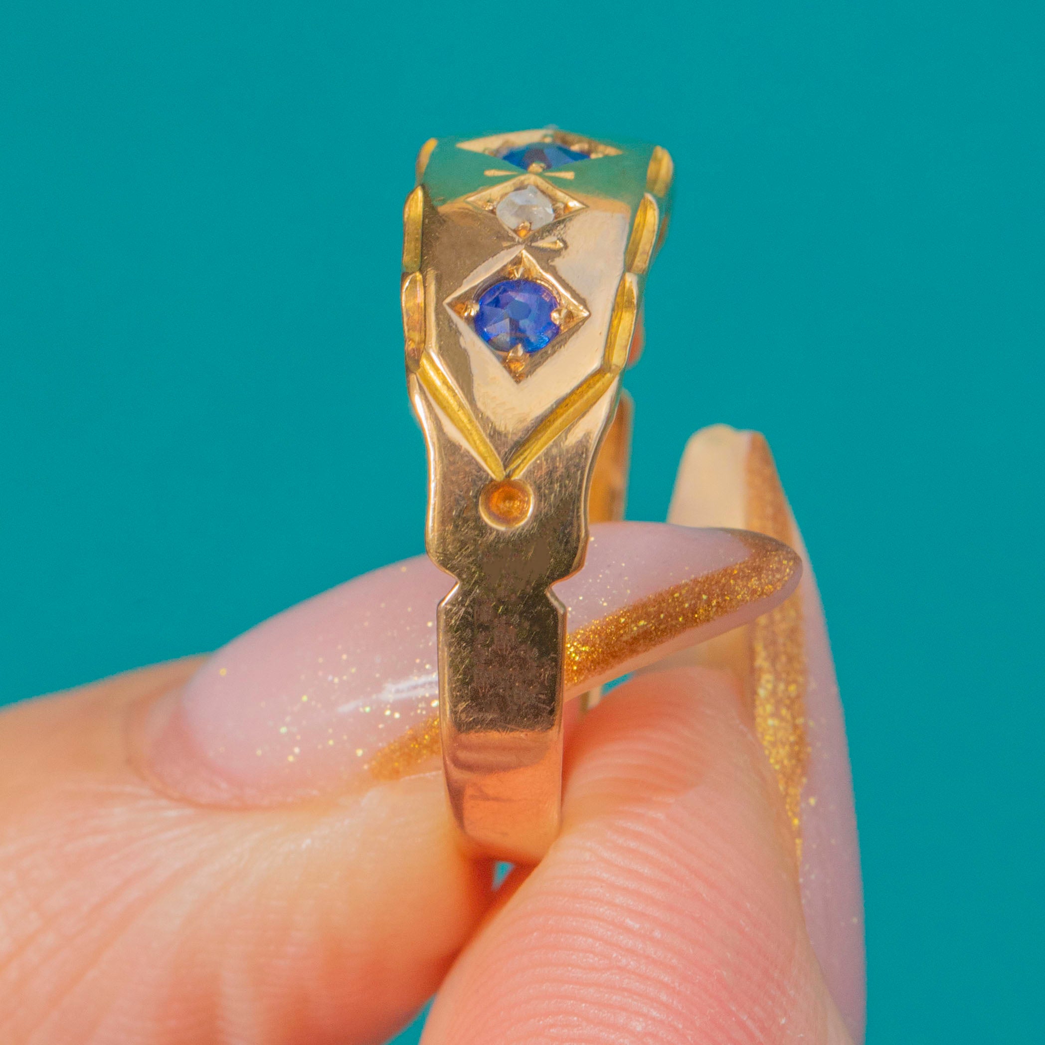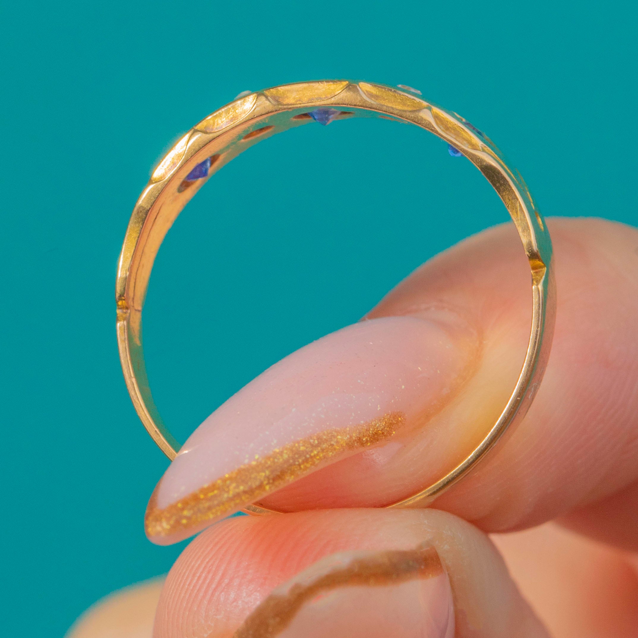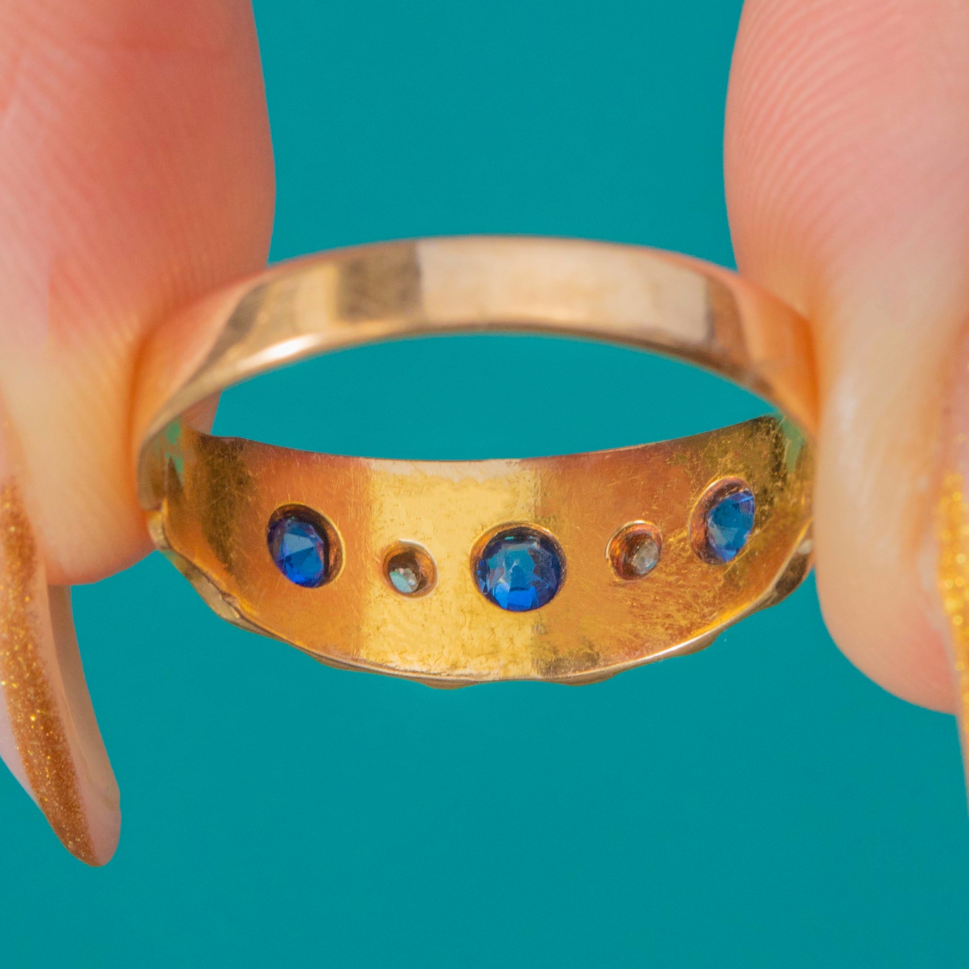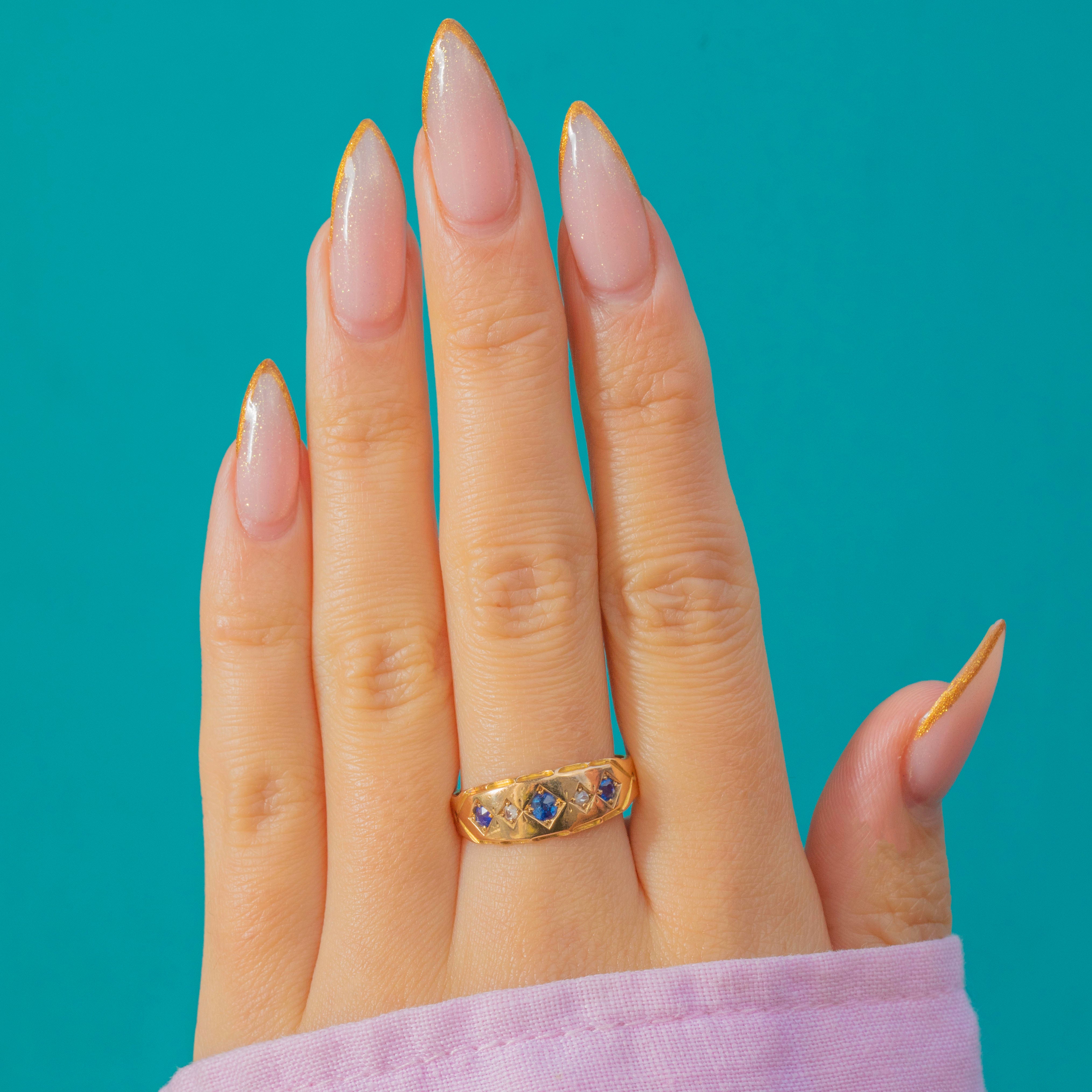 This Victorian five-stone gypsy ring, dated 1897, is a classic design set with bright blue Sapphires and sparkling Diamonds in a smooth, sculpted 18ct Gold band. The stones are flush-set within star-shaped settings, a hallmark of late-19th-century English craftsmanship.