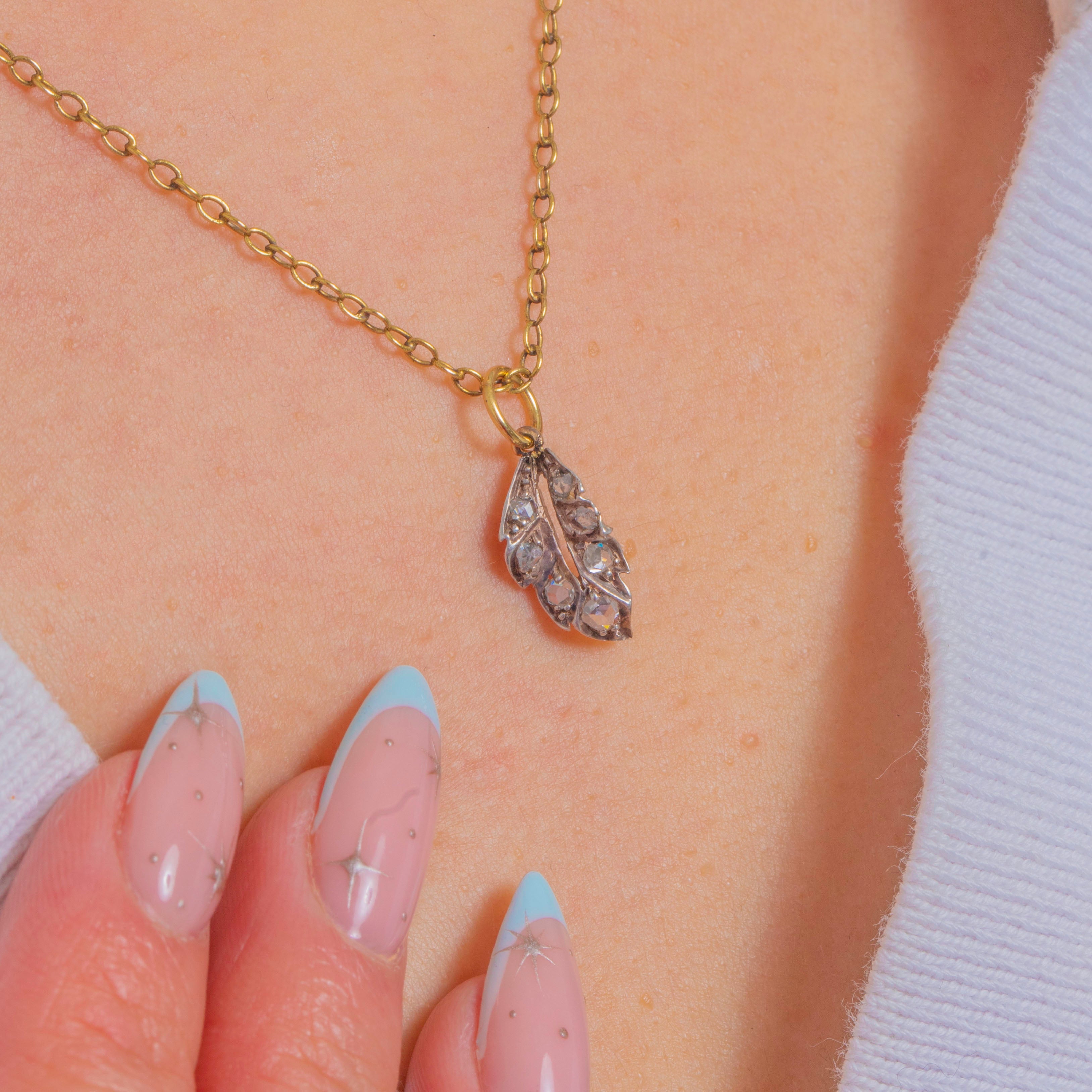 Dainty and deliciously decorative, this Victorian leaf charm is set with glimmering rose-cut Diamonds that trace each lobe and vein. The Silver-topped face lends a soft, antique sheen to the Diamonds, while the reverse and jump ring are fashioned in rich 18ct Gold for a timeless two-tone look.