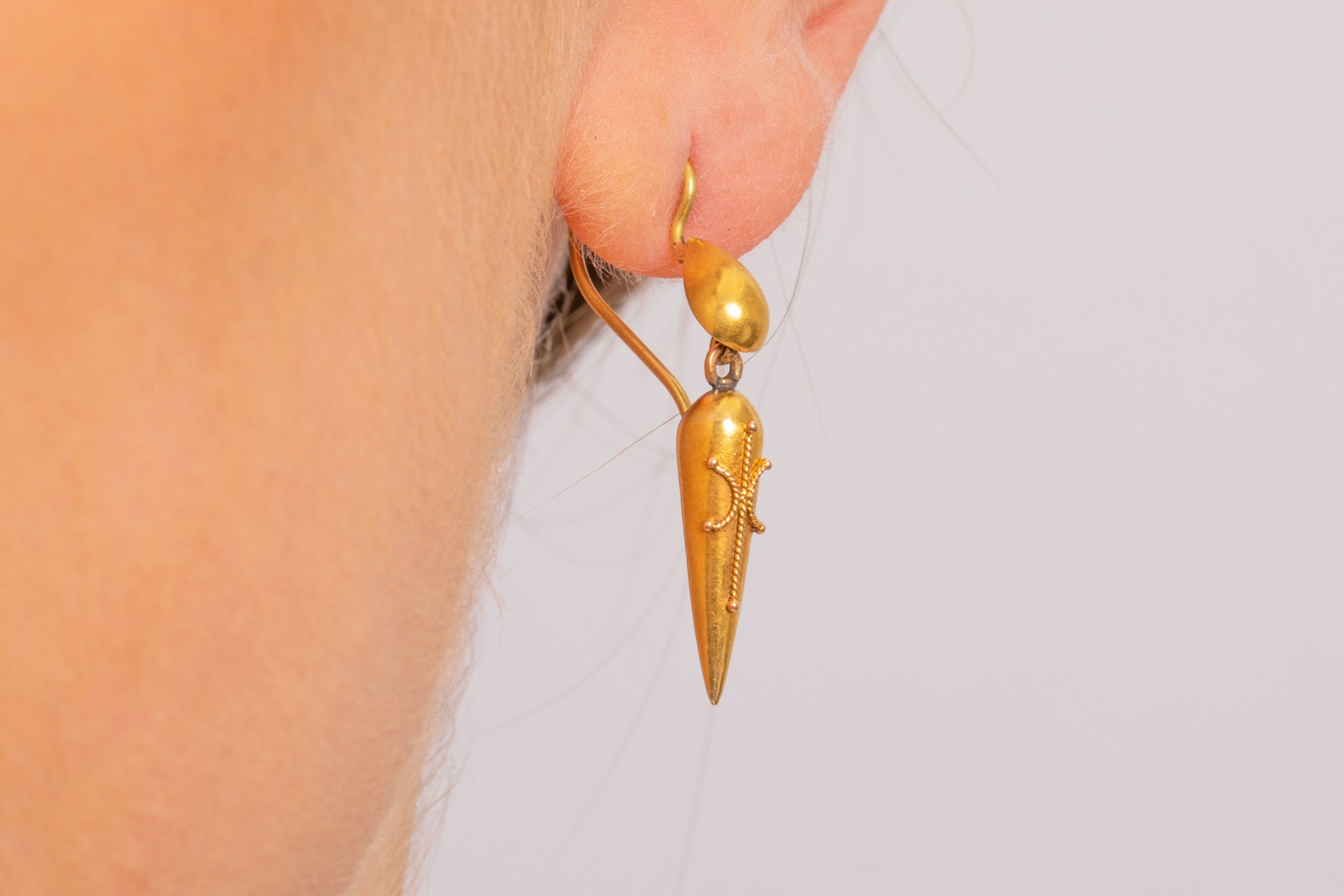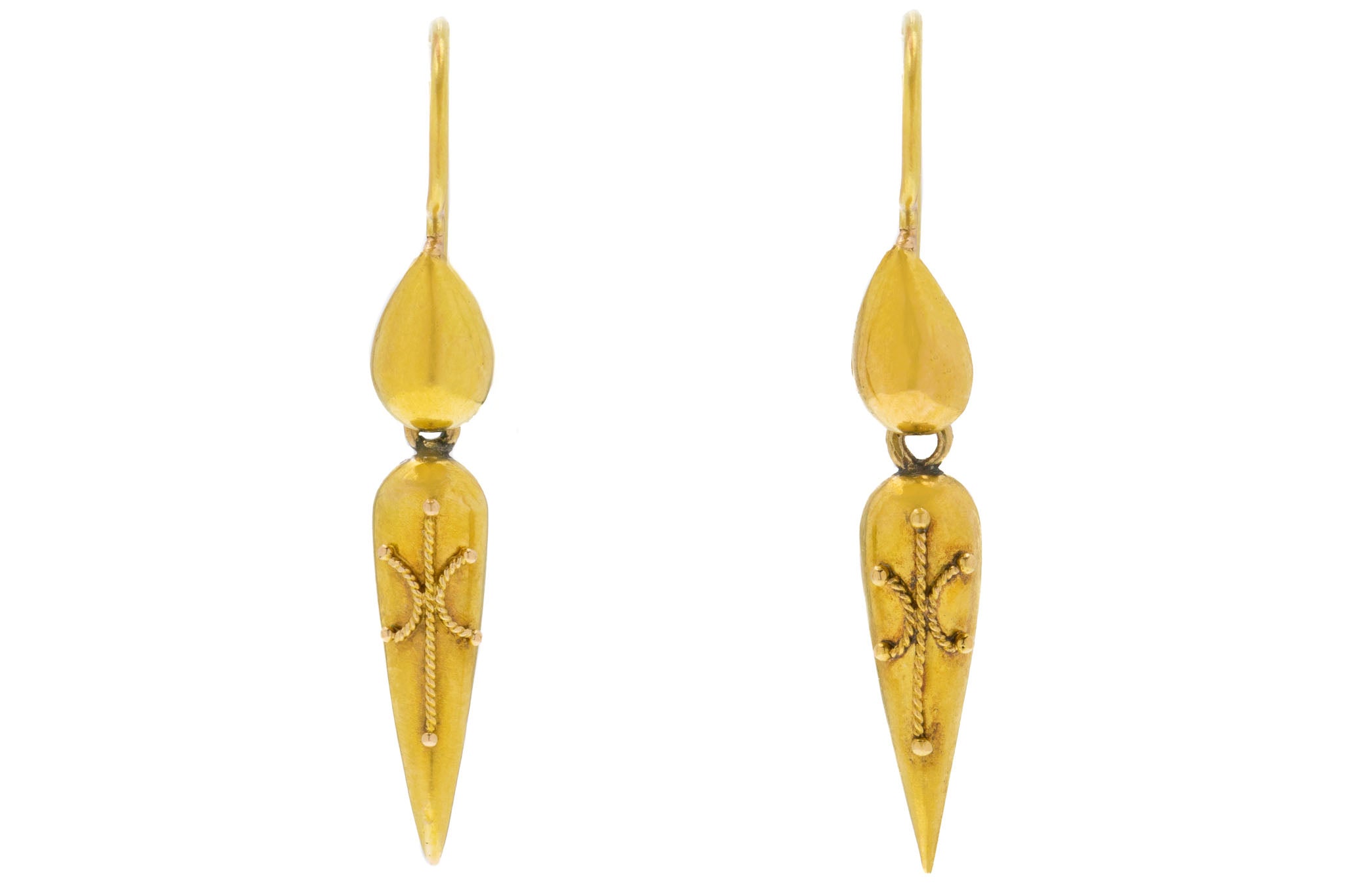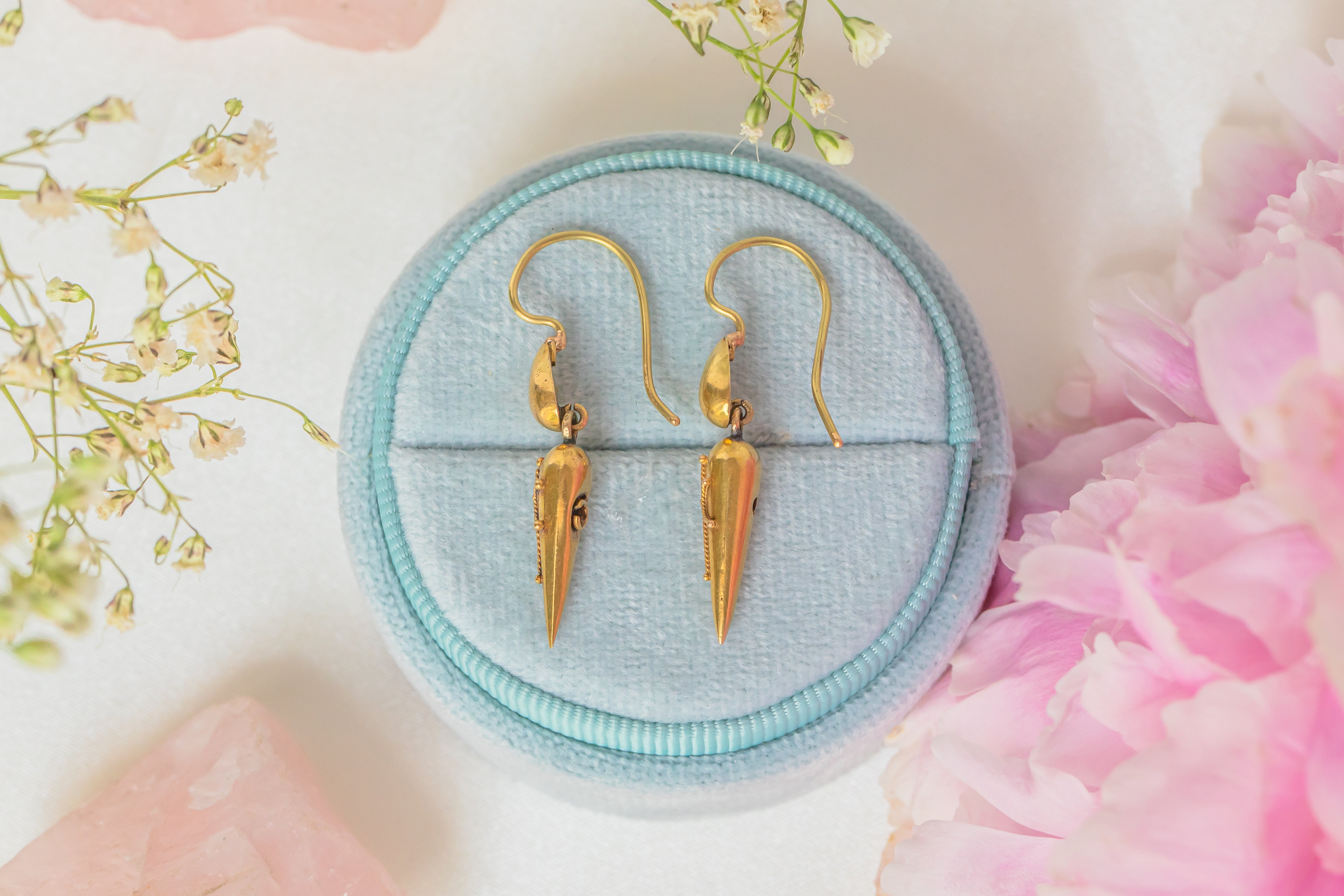 Make these Victorian 18ct Gold torpedo drop earrings your new go-to pair! Unique in design, these striking earrings boast dainty cannetille details resting across the front of the sleek torpedo drops.