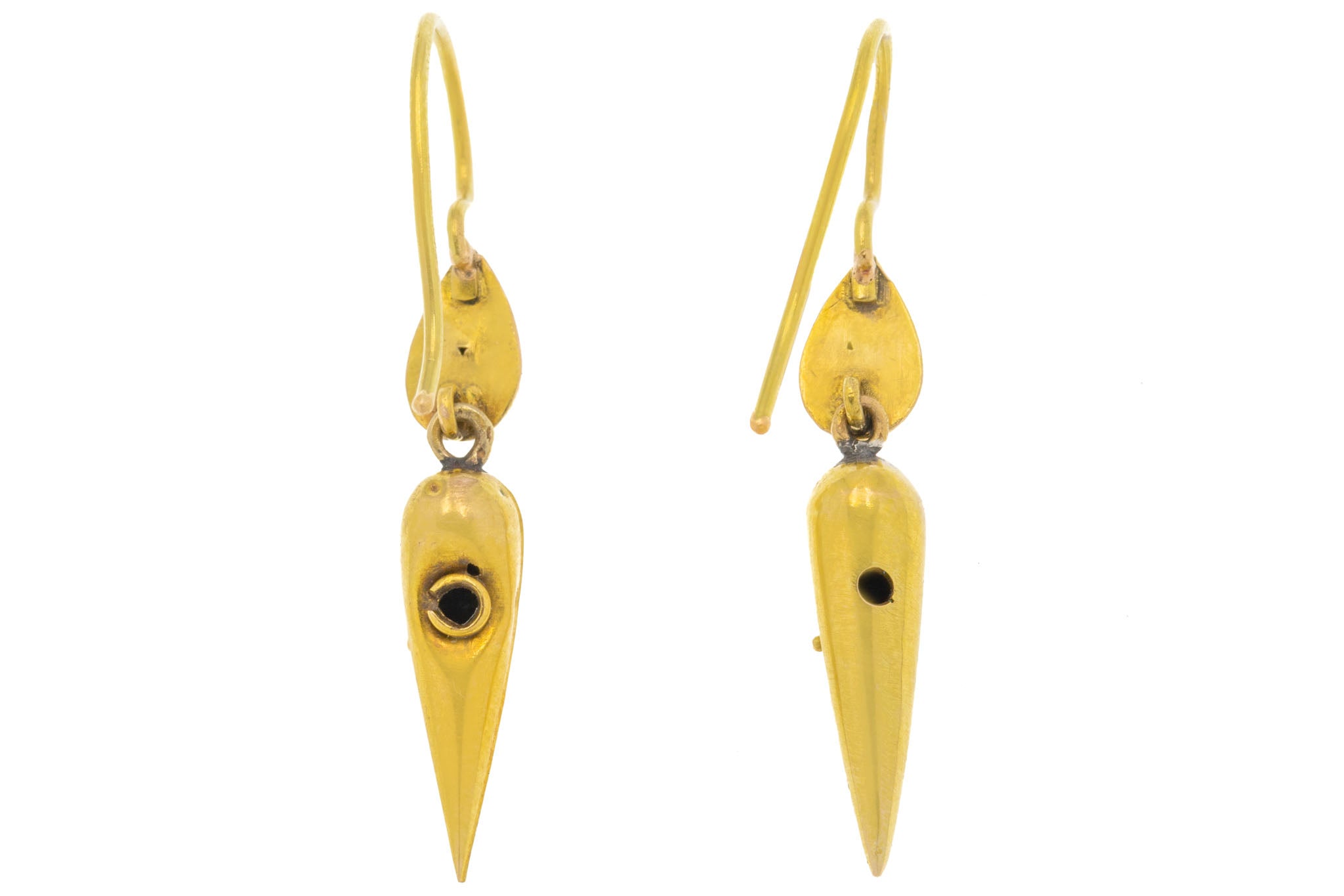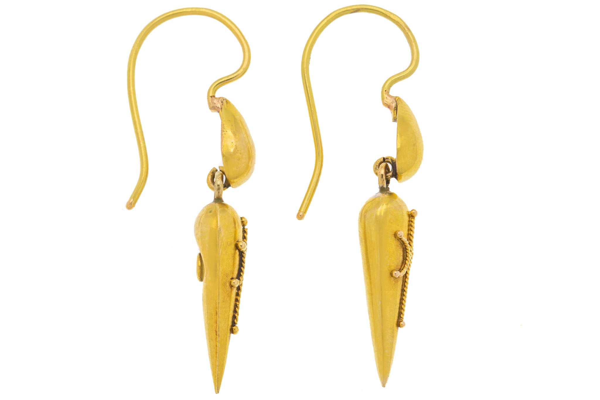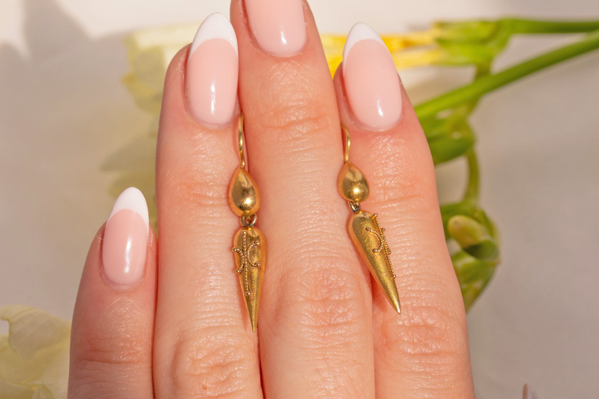 Make these Victorian 18ct Gold torpedo drop earrings your new go-to pair! Unique in design, these striking earrings boast dainty cannetille details resting across the front of the sleek torpedo drops.
