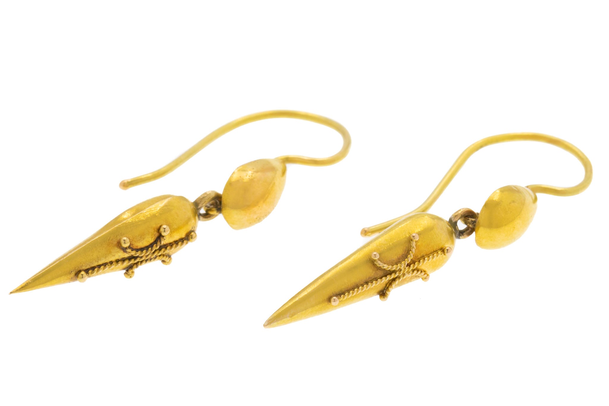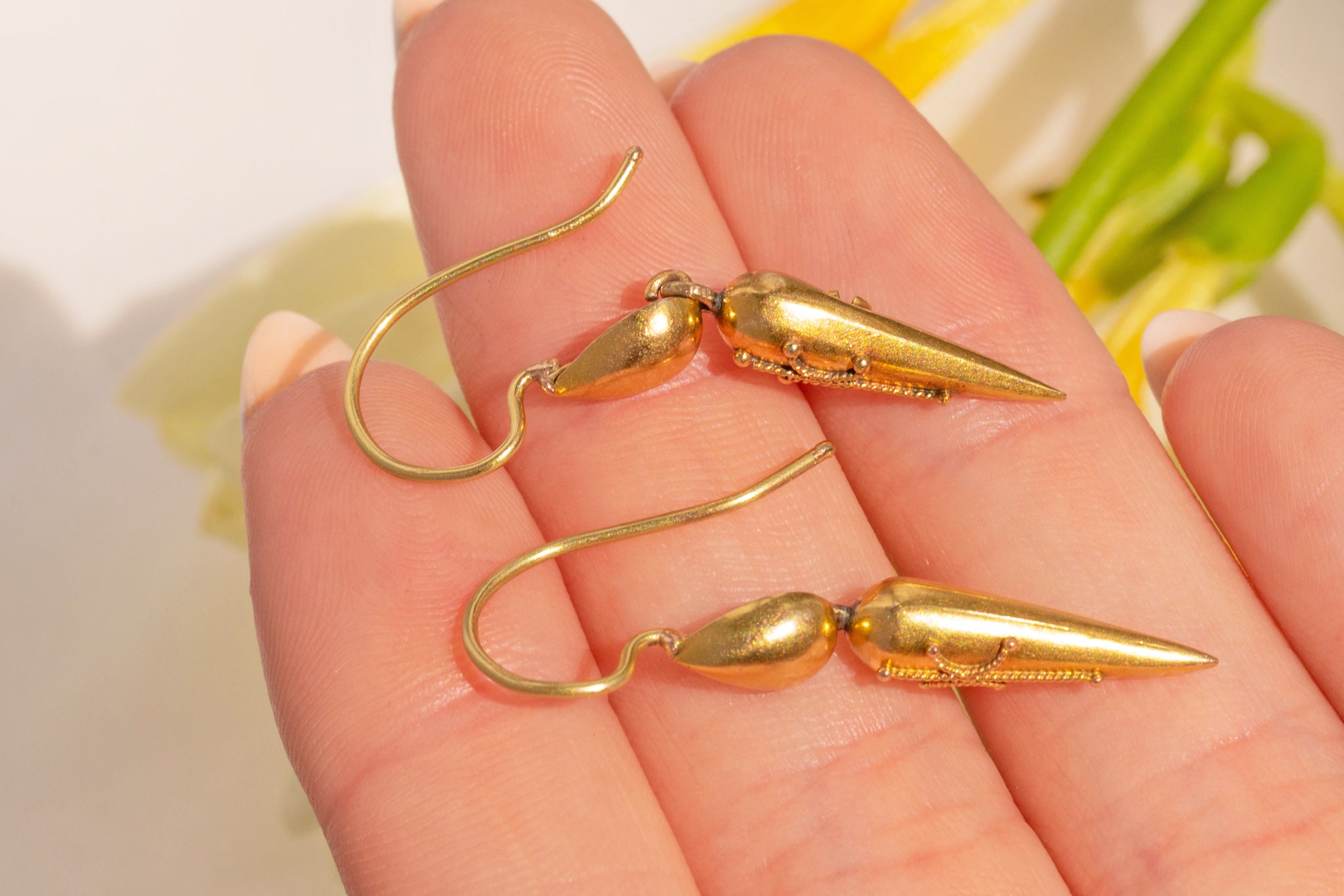 VERY GOOD. This pair of Victorian 18ct Gold torpedo drop earrings are in very good condition. These earrings do have some signs of aging on the back of them, with a few subtle dings. The backs have some open holes in them, which were used to let the heat out when they were being made. The cannetille details are all intact and the hooks are robust promising you years of wear and enjoyment!